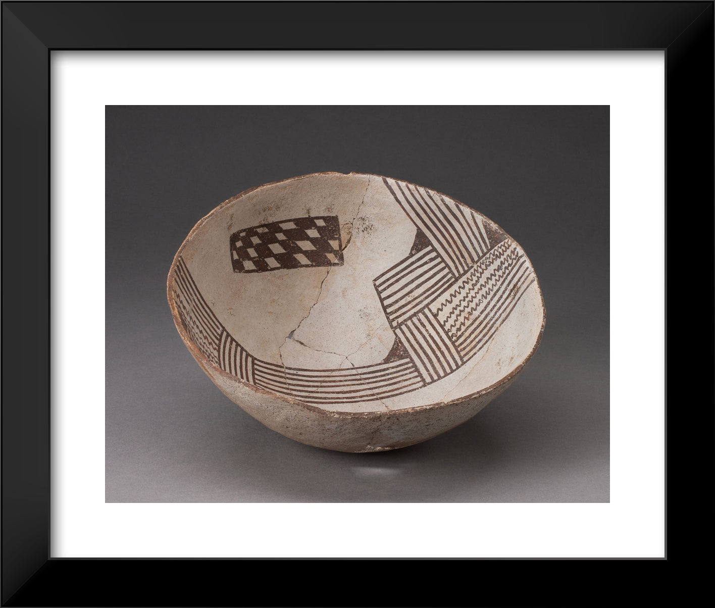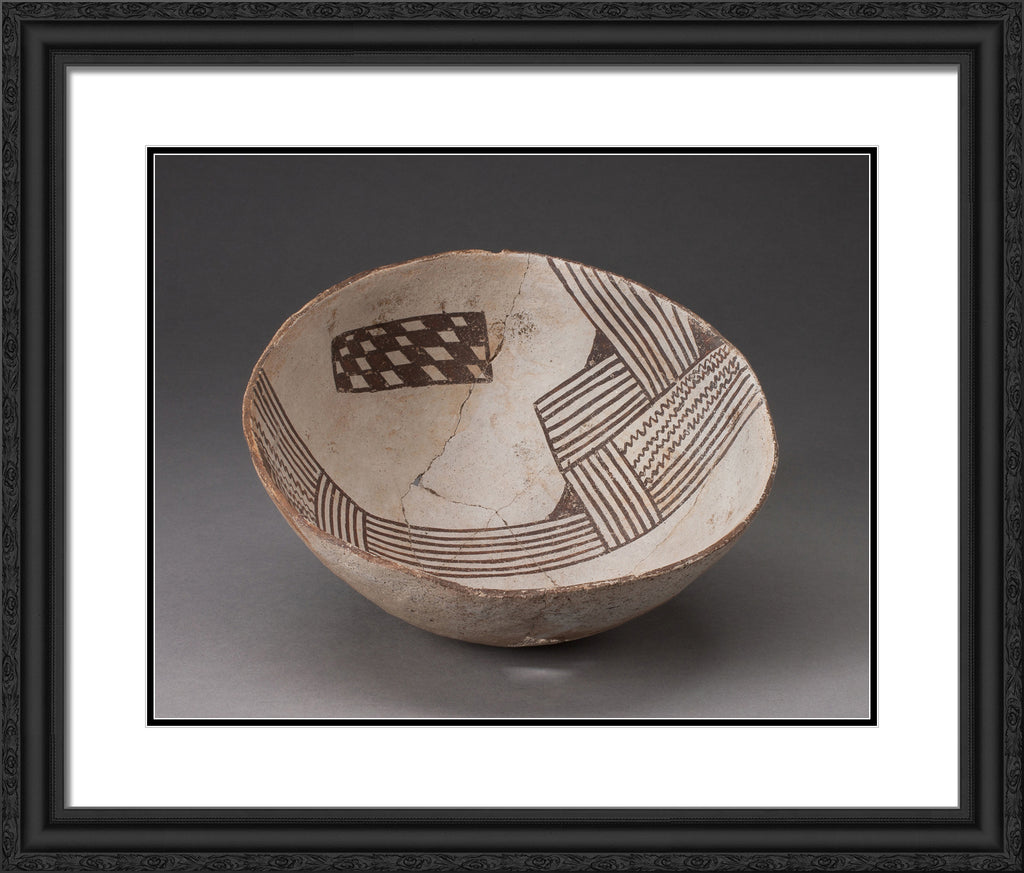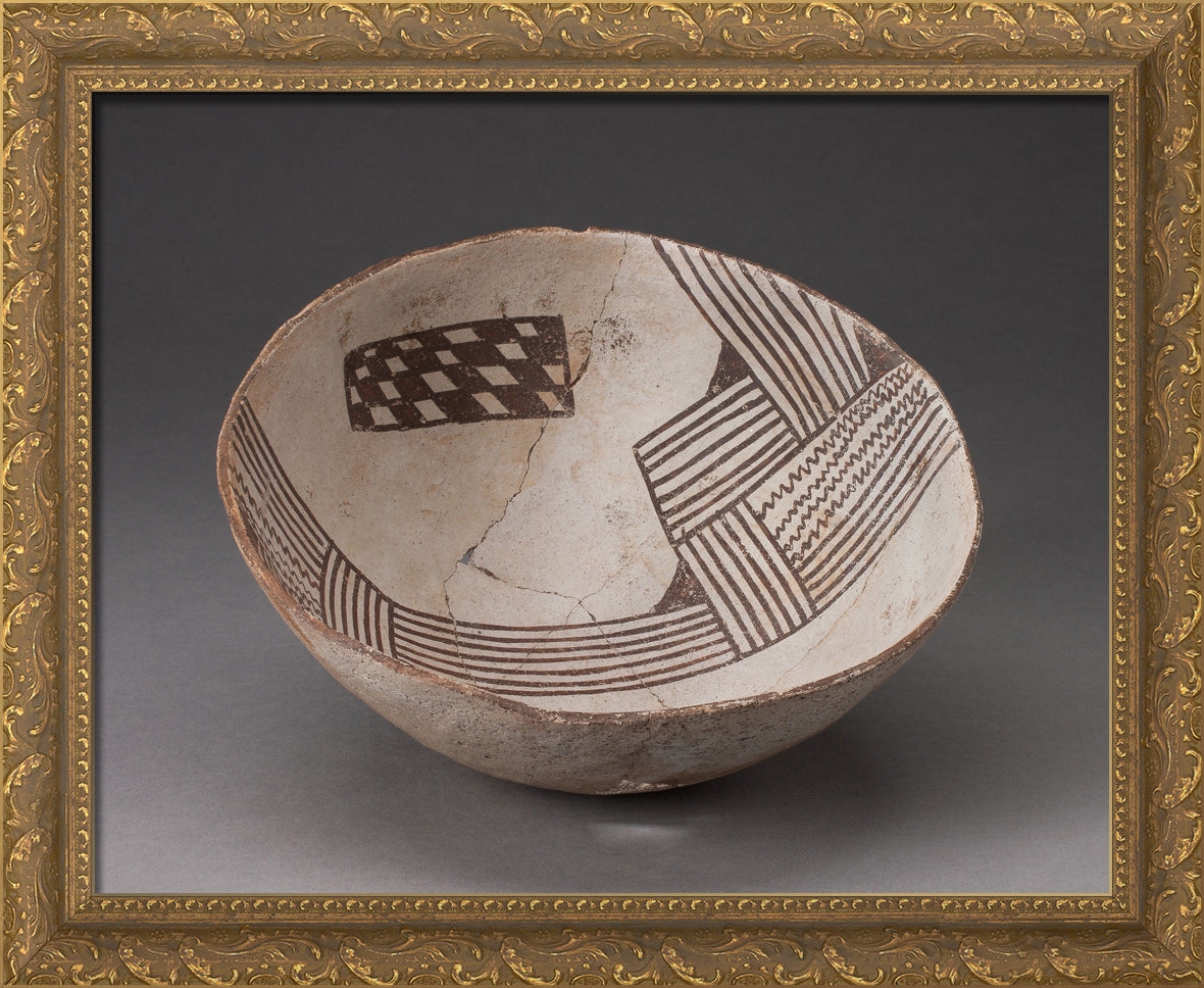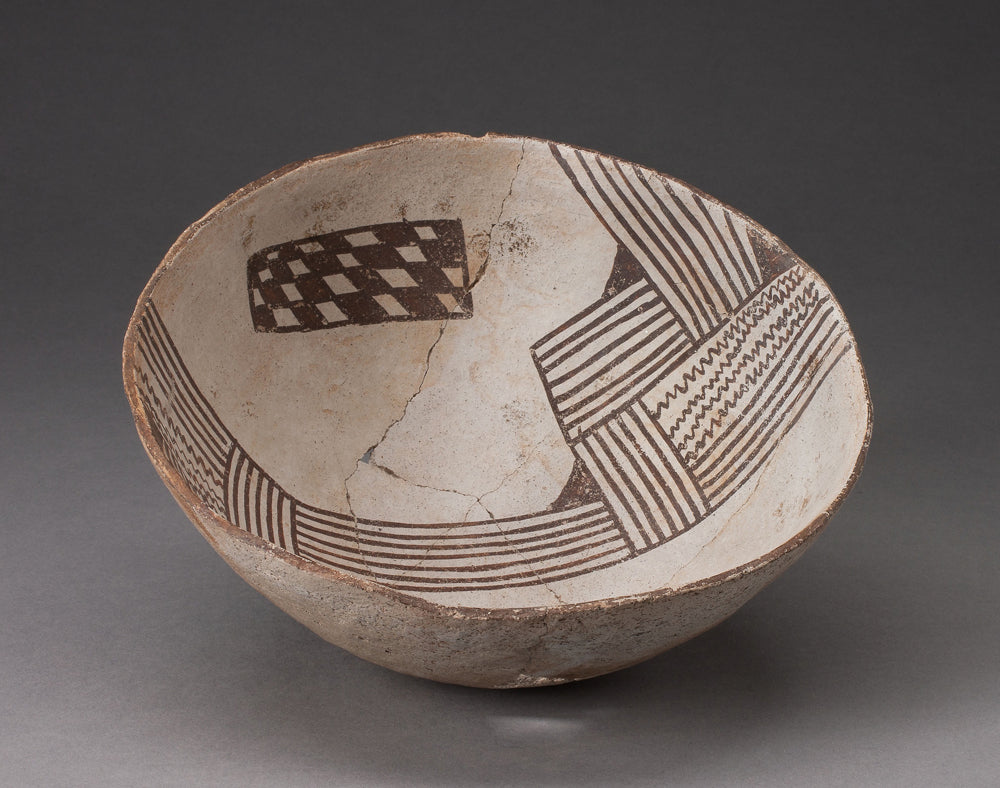 / Bowl with Bold, Irregular Geometric Bands of Stripes, Zigzag, and Checkerboard Motifs by Cibola