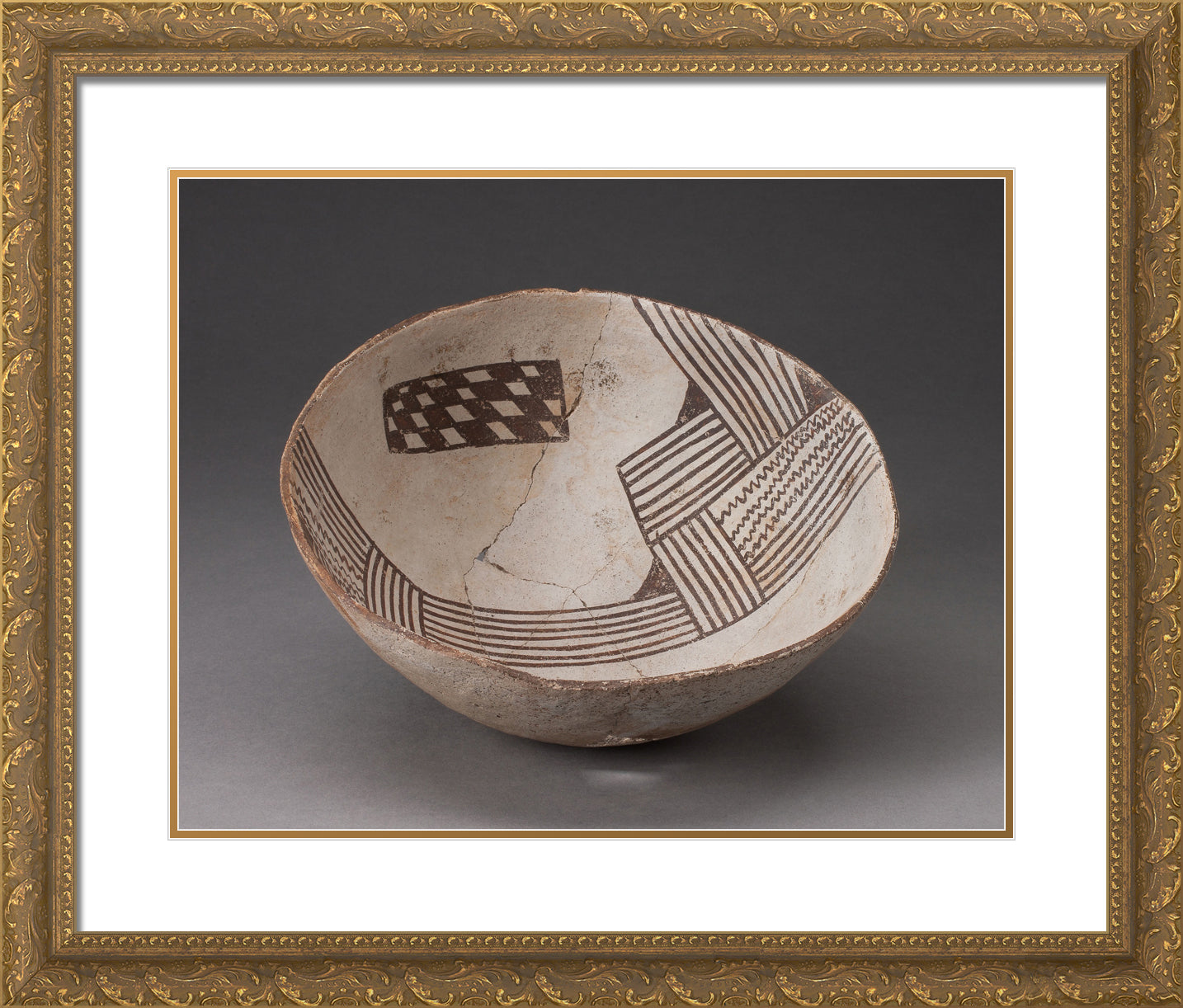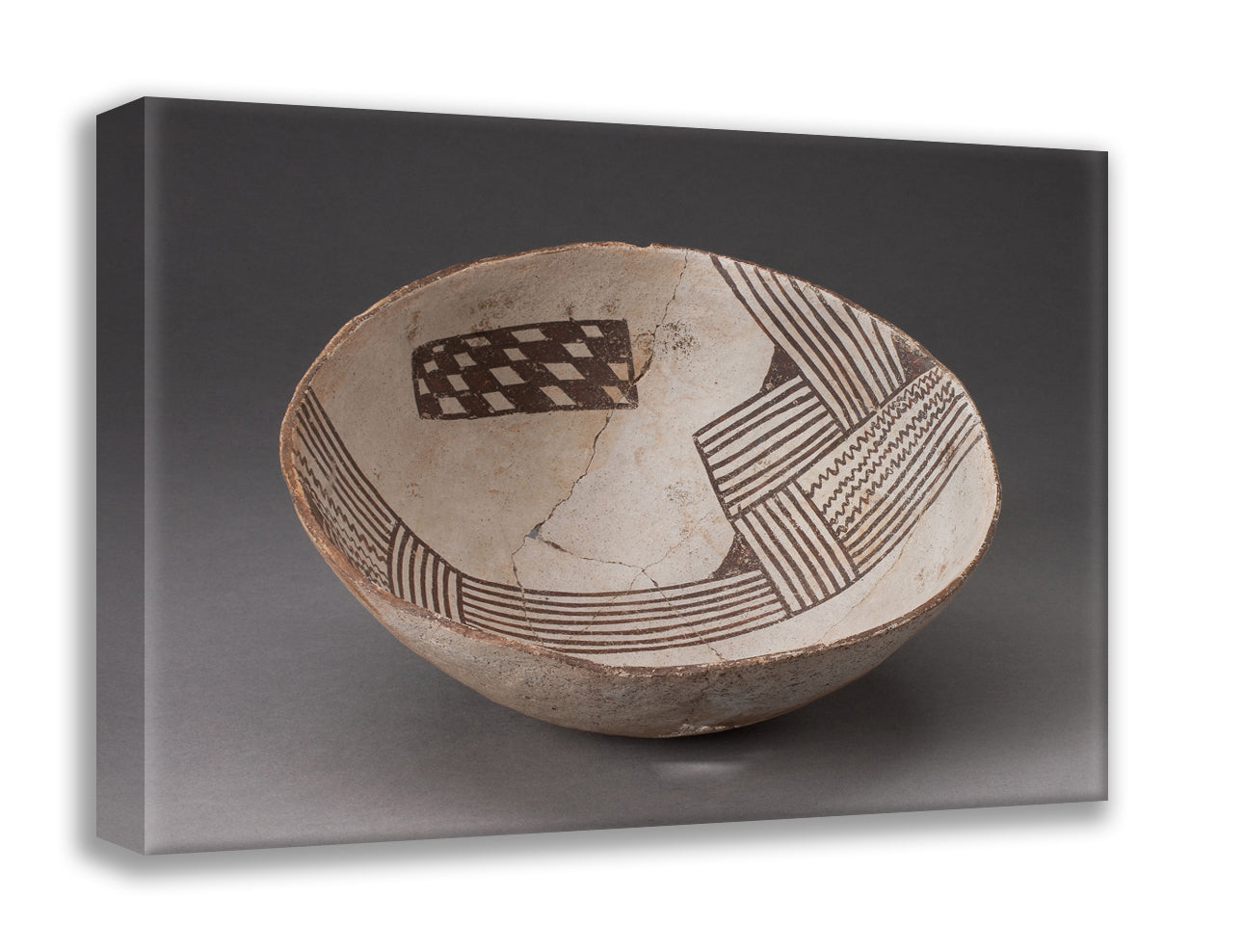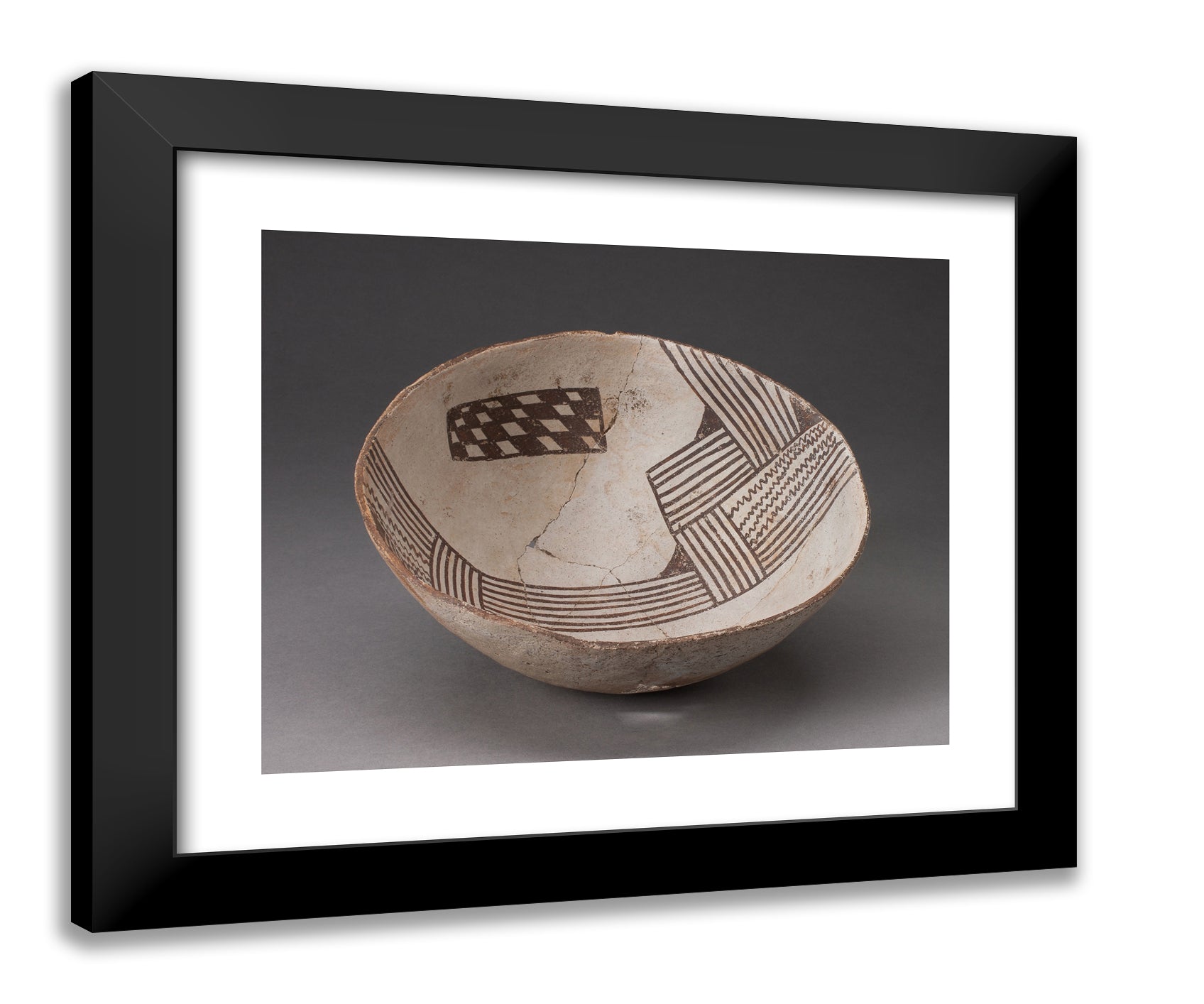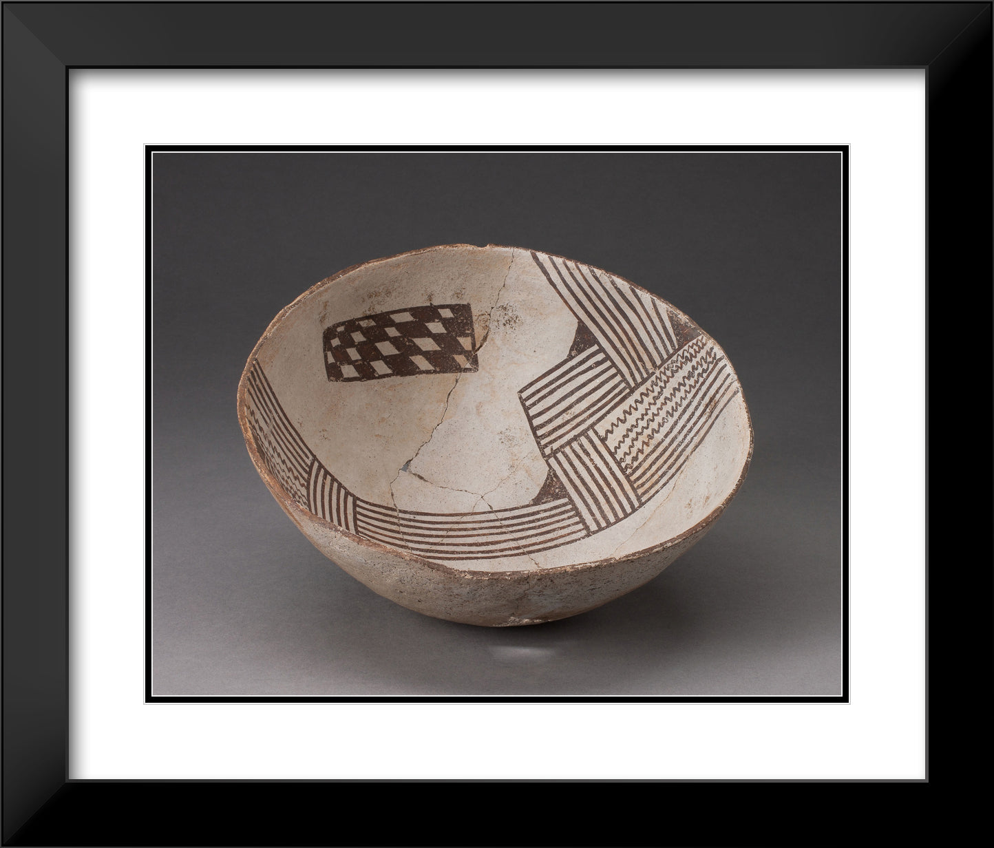 / Bowl with Bold, Irregular Geometric Bands of Stripes, Zigzag, and Checkerboard Motifs by Cibola