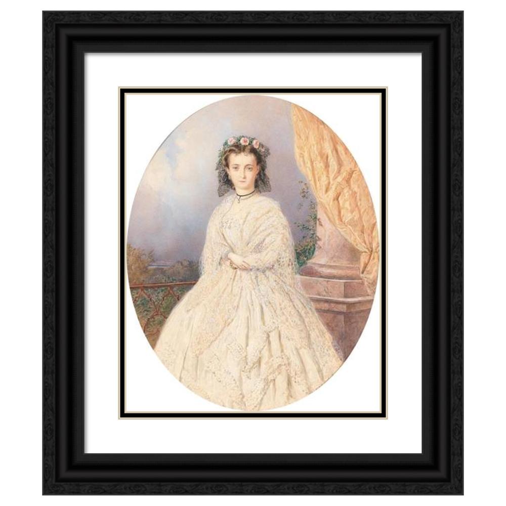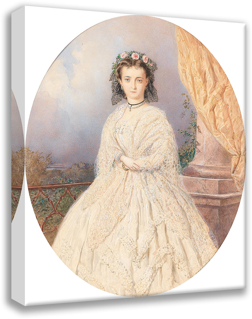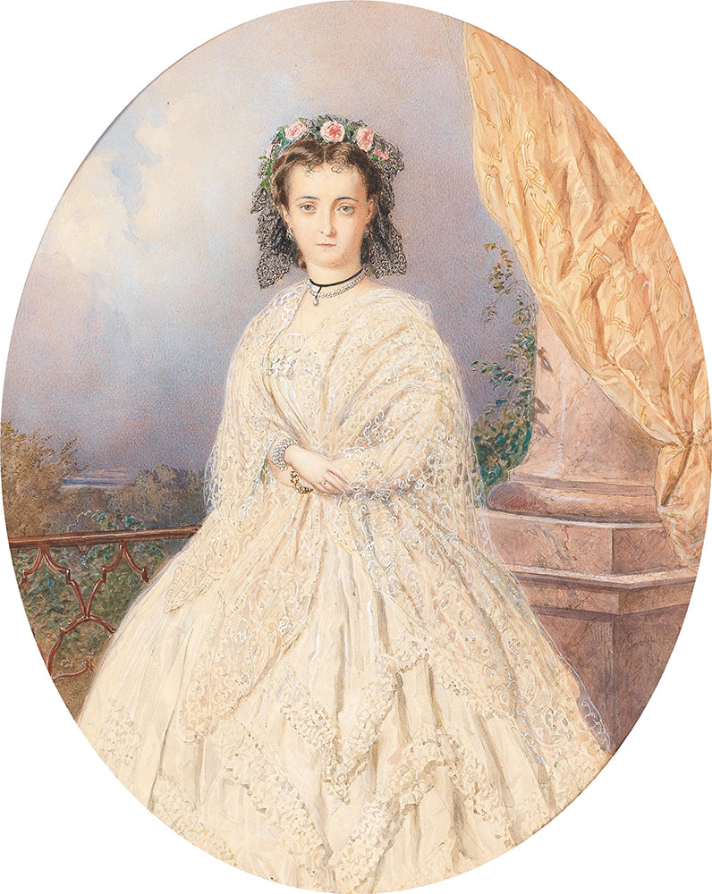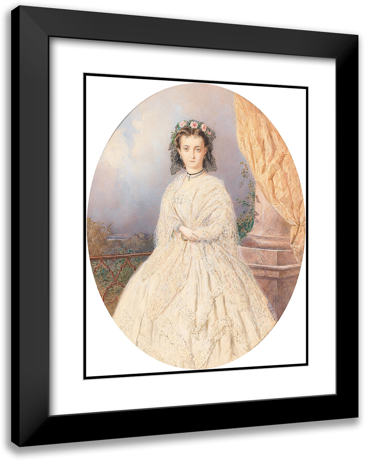 / A Portrait of a Bride with Roses in the Hair, Standing on a Balcony