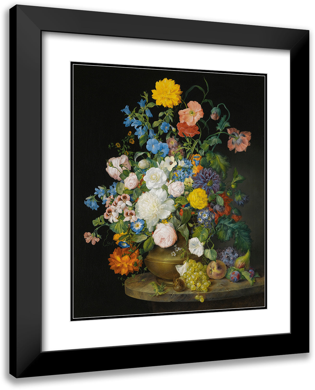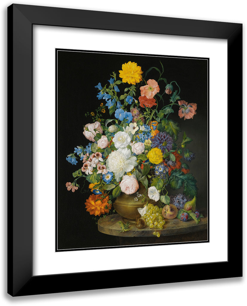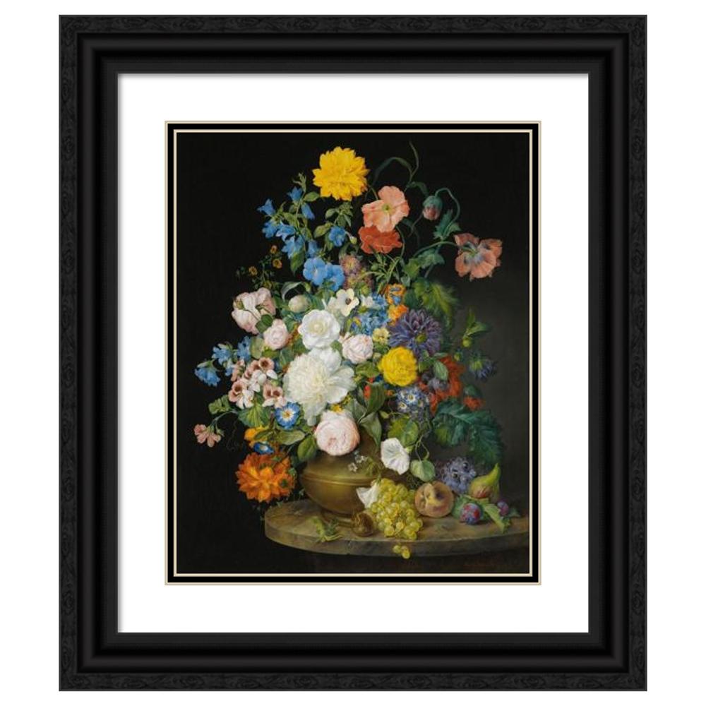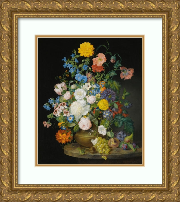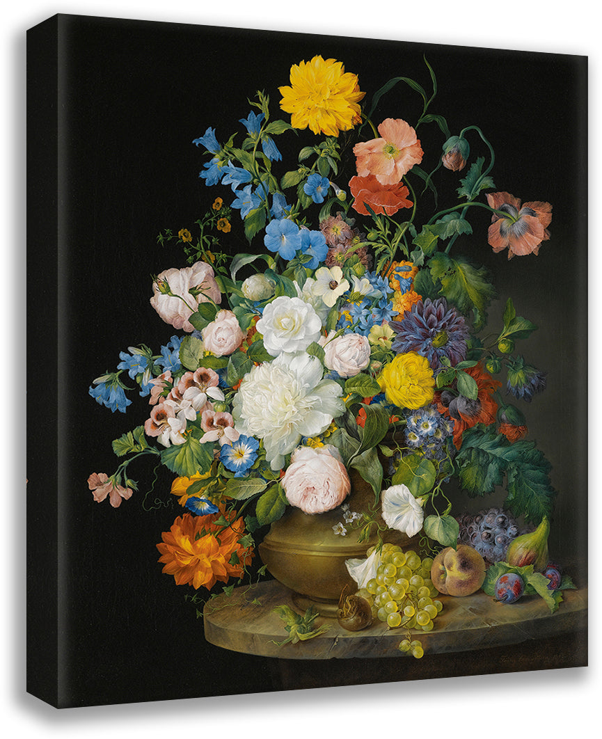 / A Vase of Camellias, Geraniums, Dahlias, a White Peony, Roses, Poppies and Other Flowers, with Fruit on a Stone Ledge (1845)
