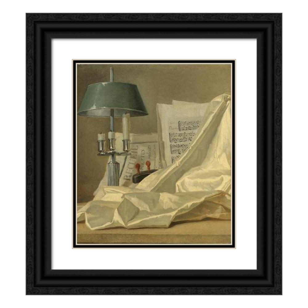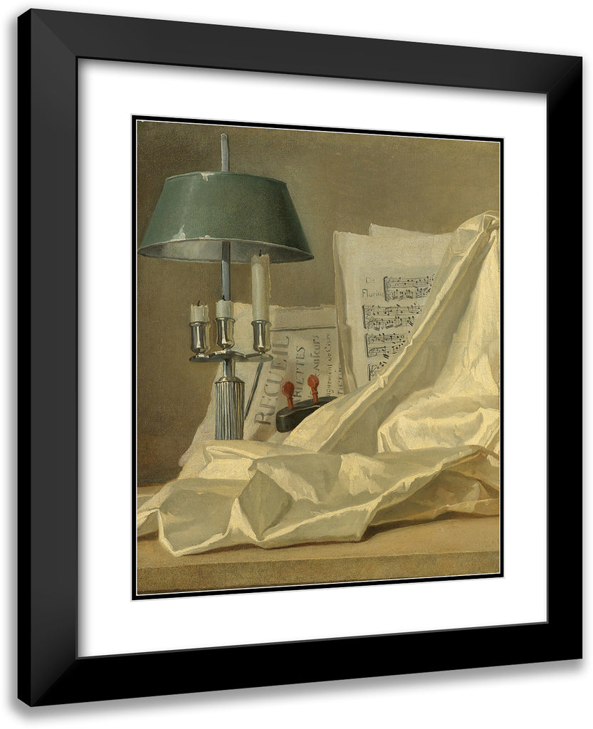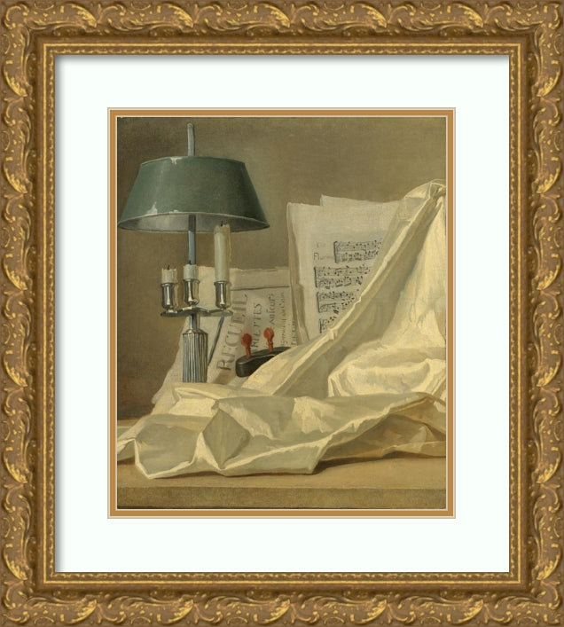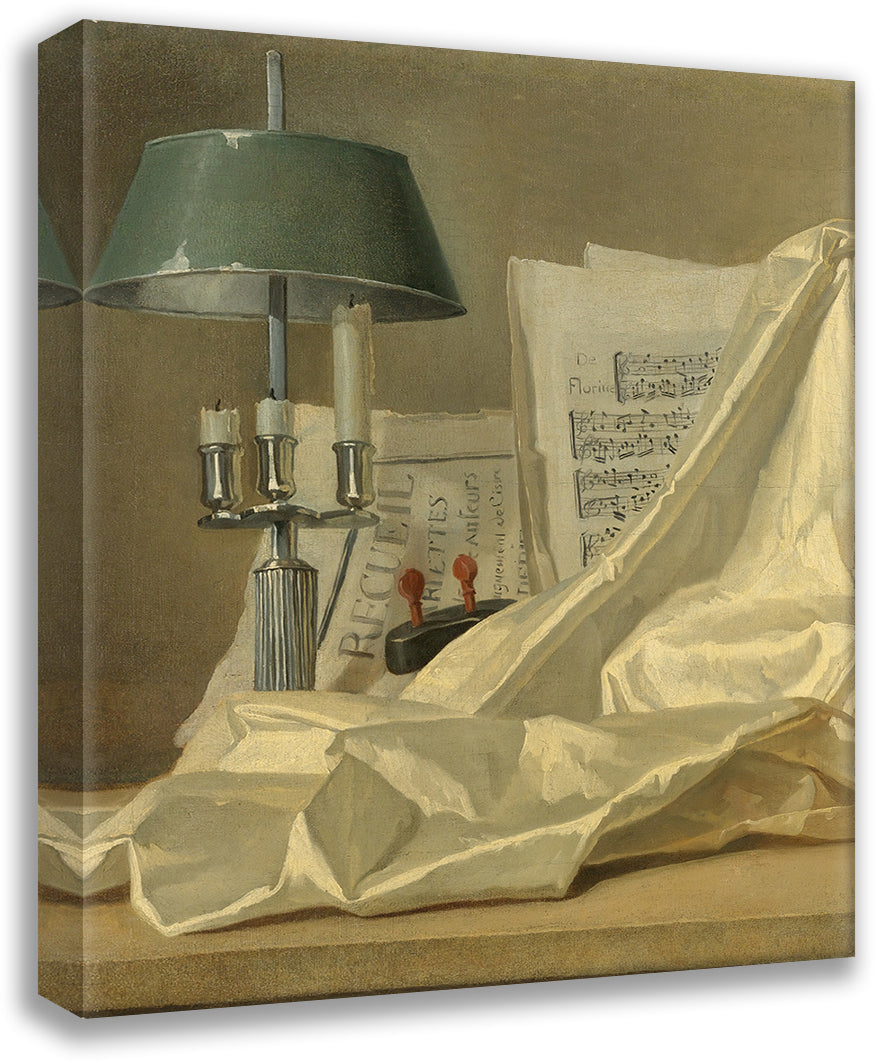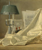 / A Still Life with a Bouillette Lamp, a Sheet of Music, a Violin or a Cittern, and a White Satin Cloth on a Stone Ledge