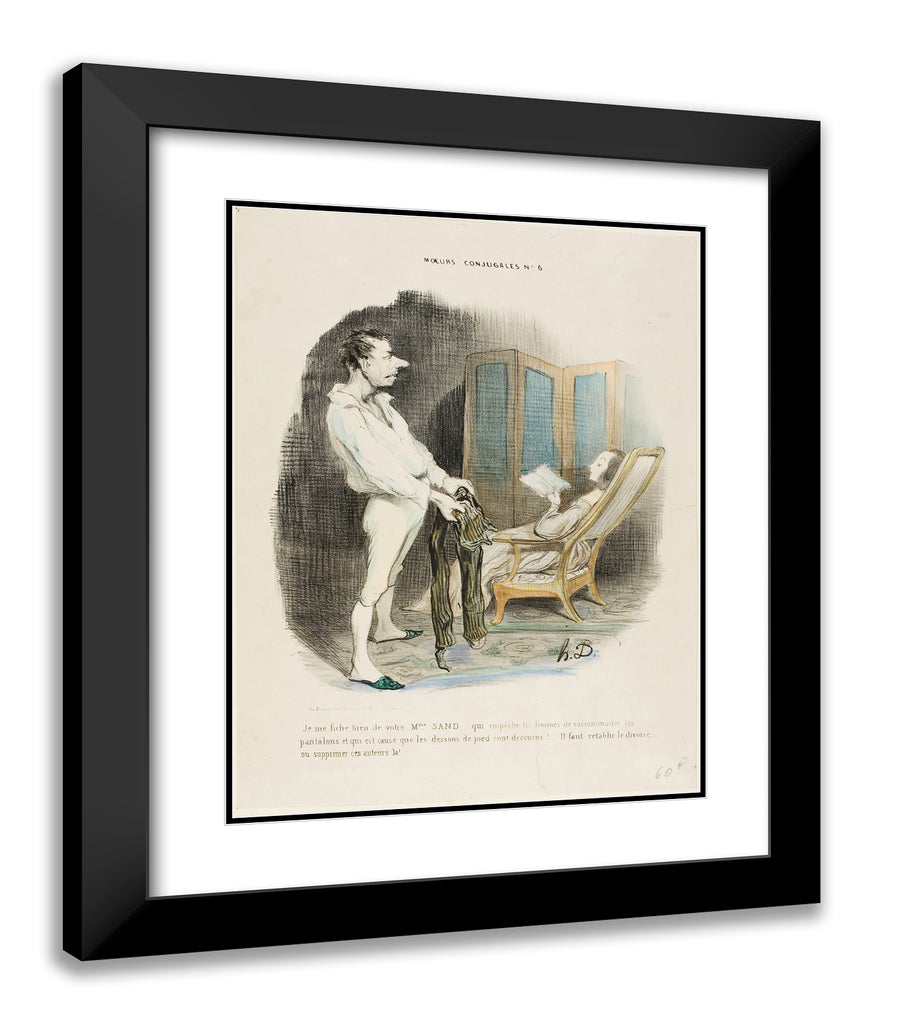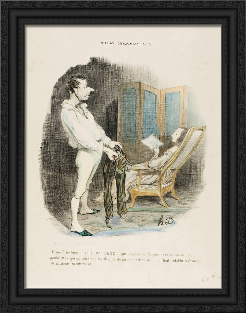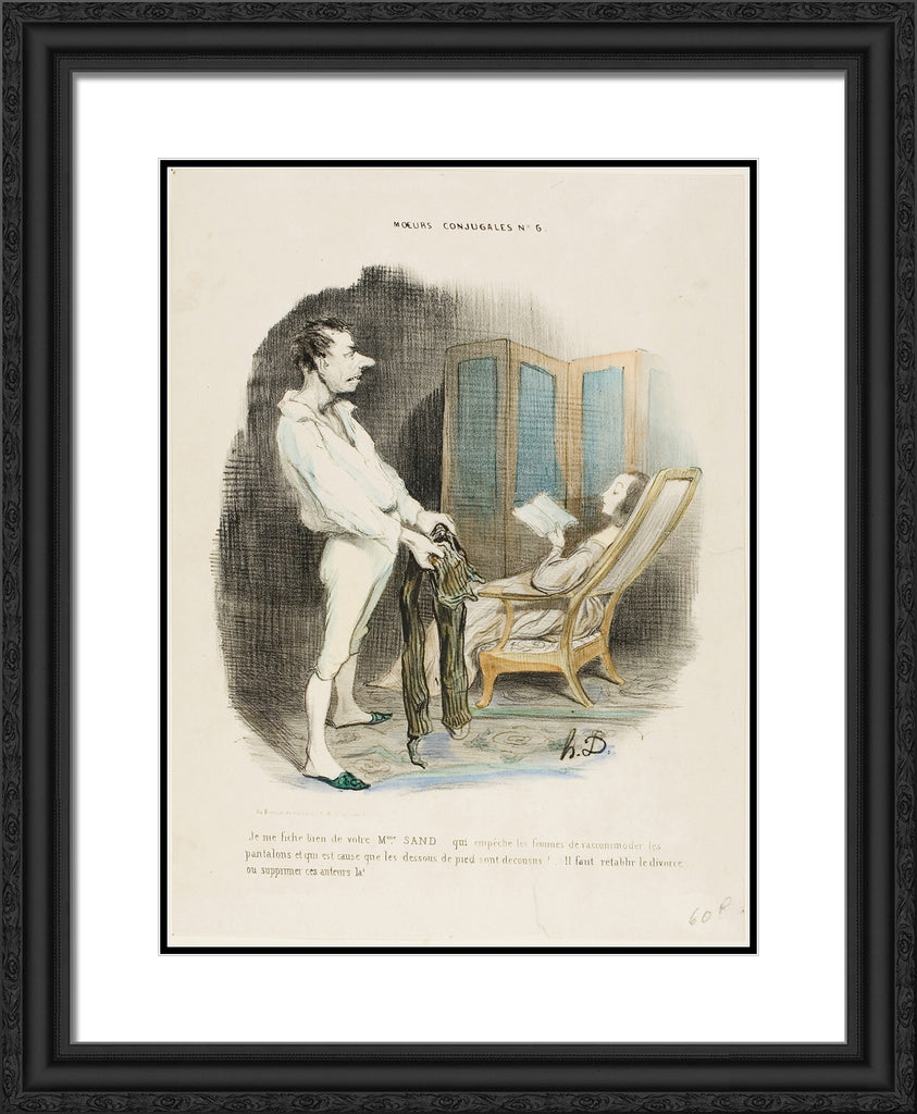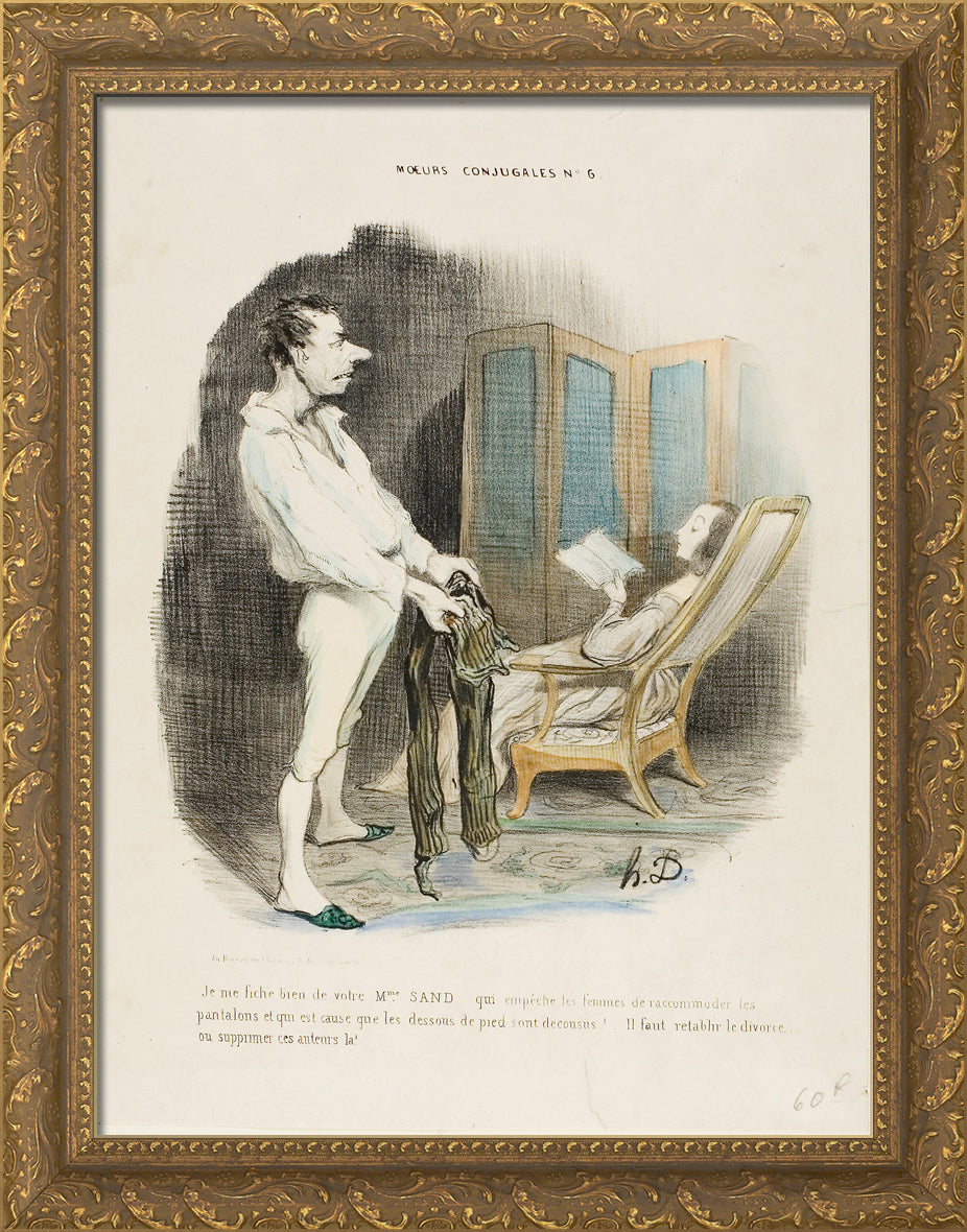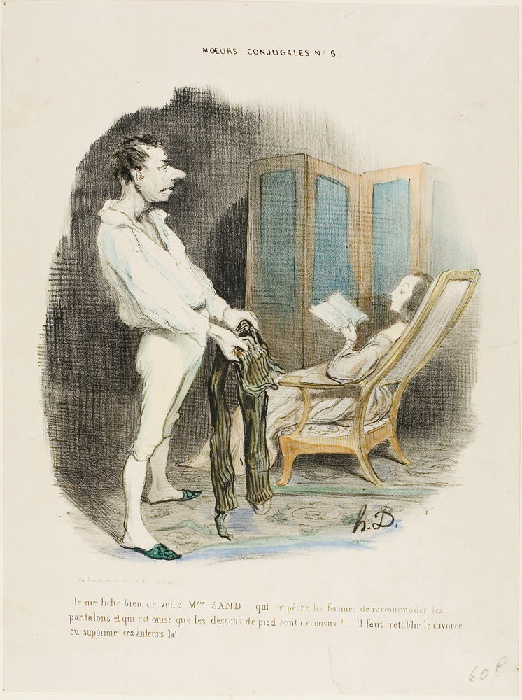/ I don't give a damn about your Miss Sand who prevents women from mending pants and darning socks! ... We must re-establish divorce or suppress those authors!, plate 6 from Moeurs Conjugales by Honore-Victorin Daumier