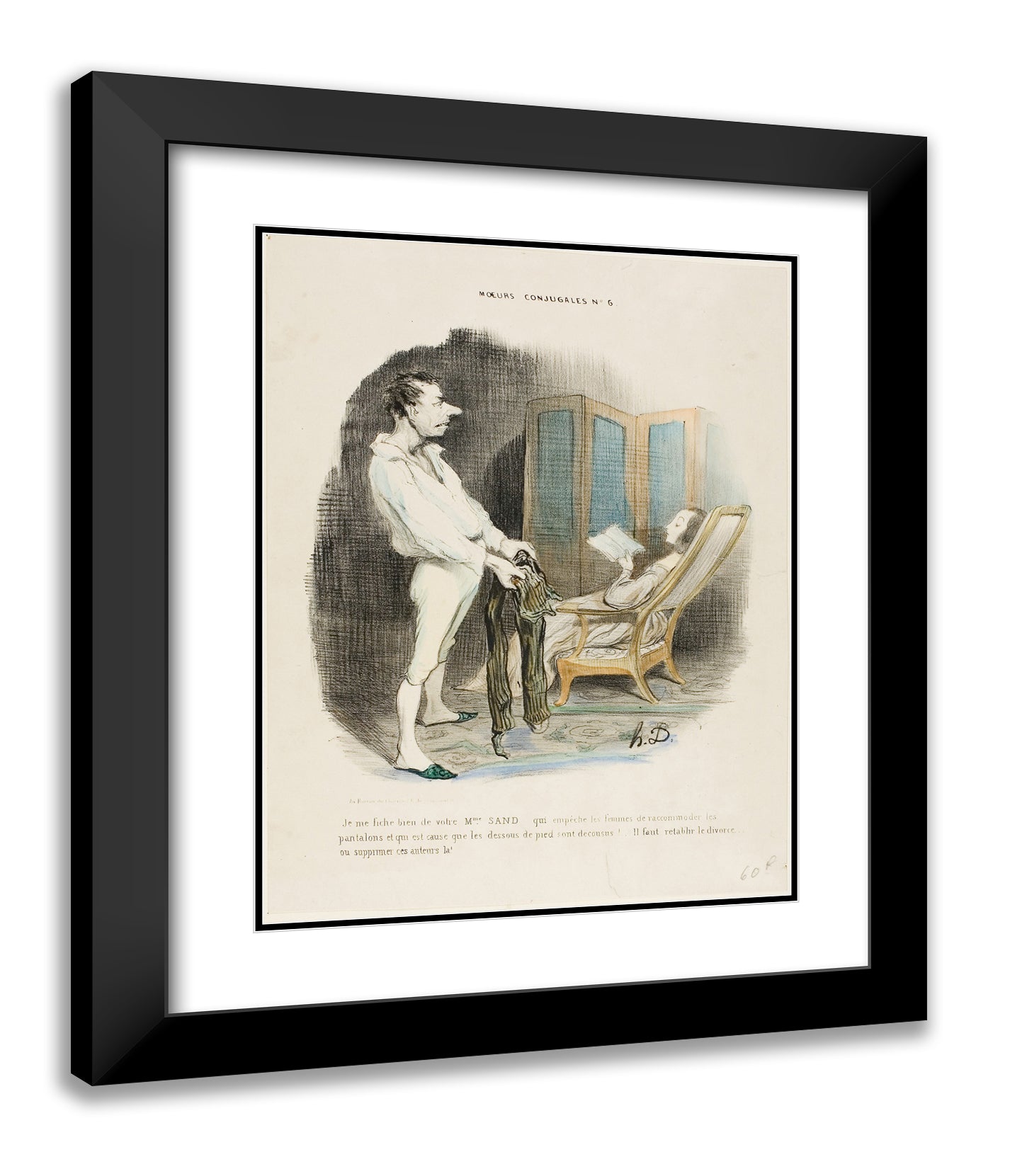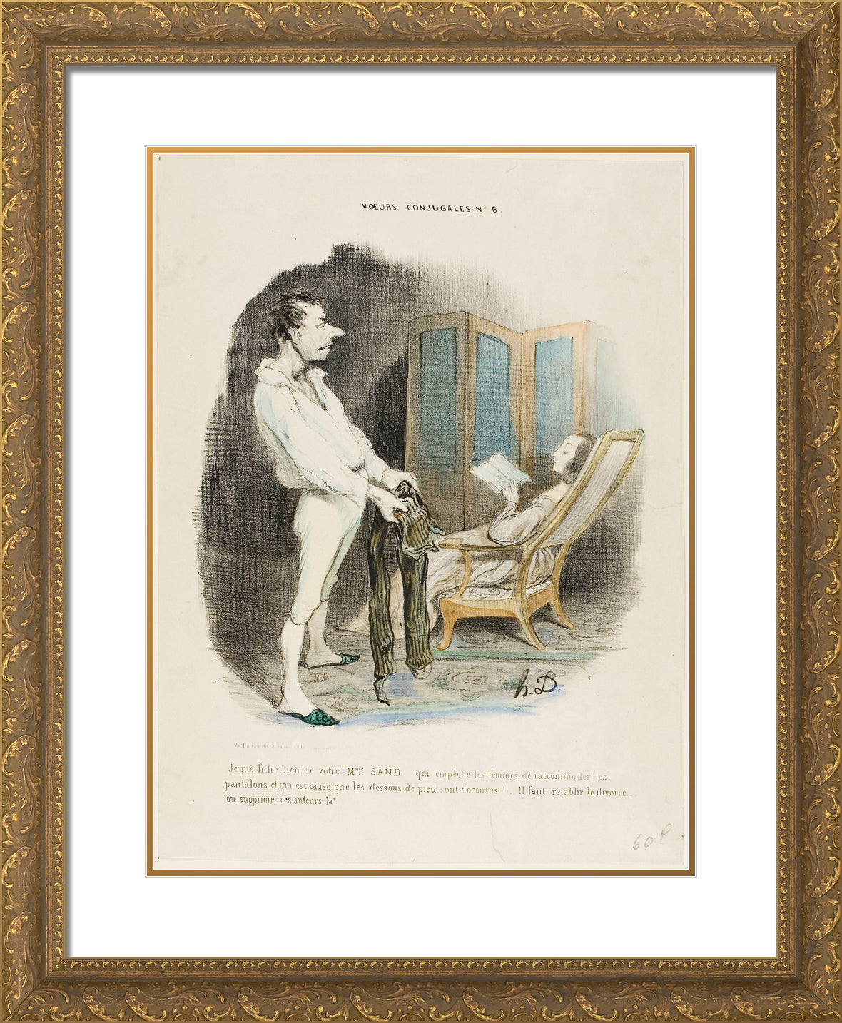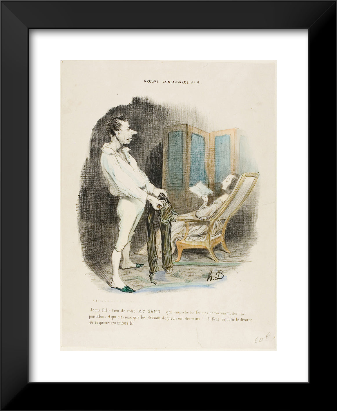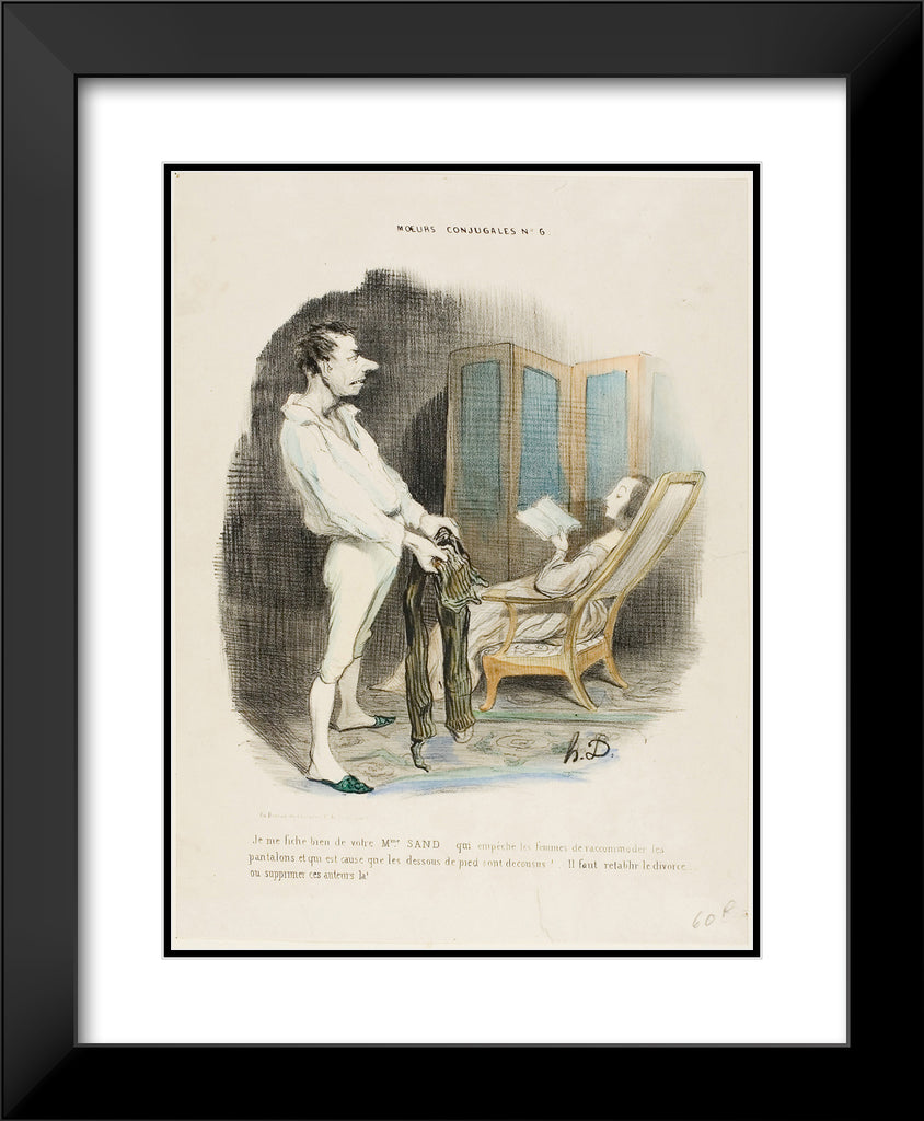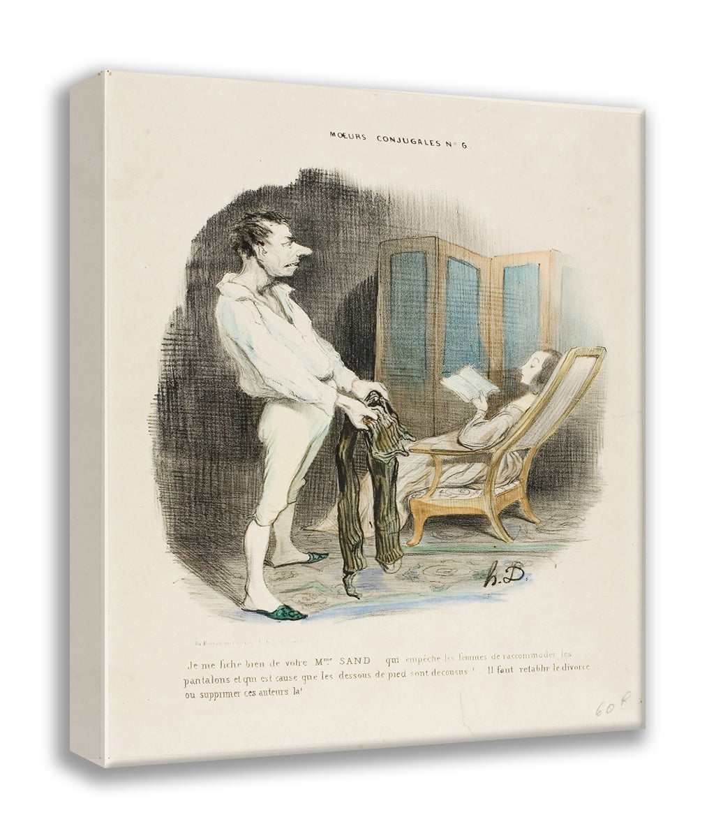 / I don't give a damn about your Miss Sand who prevents women from mending pants and darning socks! ... We must re-establish divorce or suppress those authors!, plate 6 from Moeurs Conjugales by Honore-Victorin Daumier