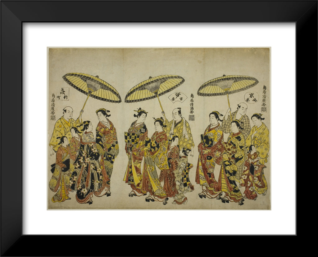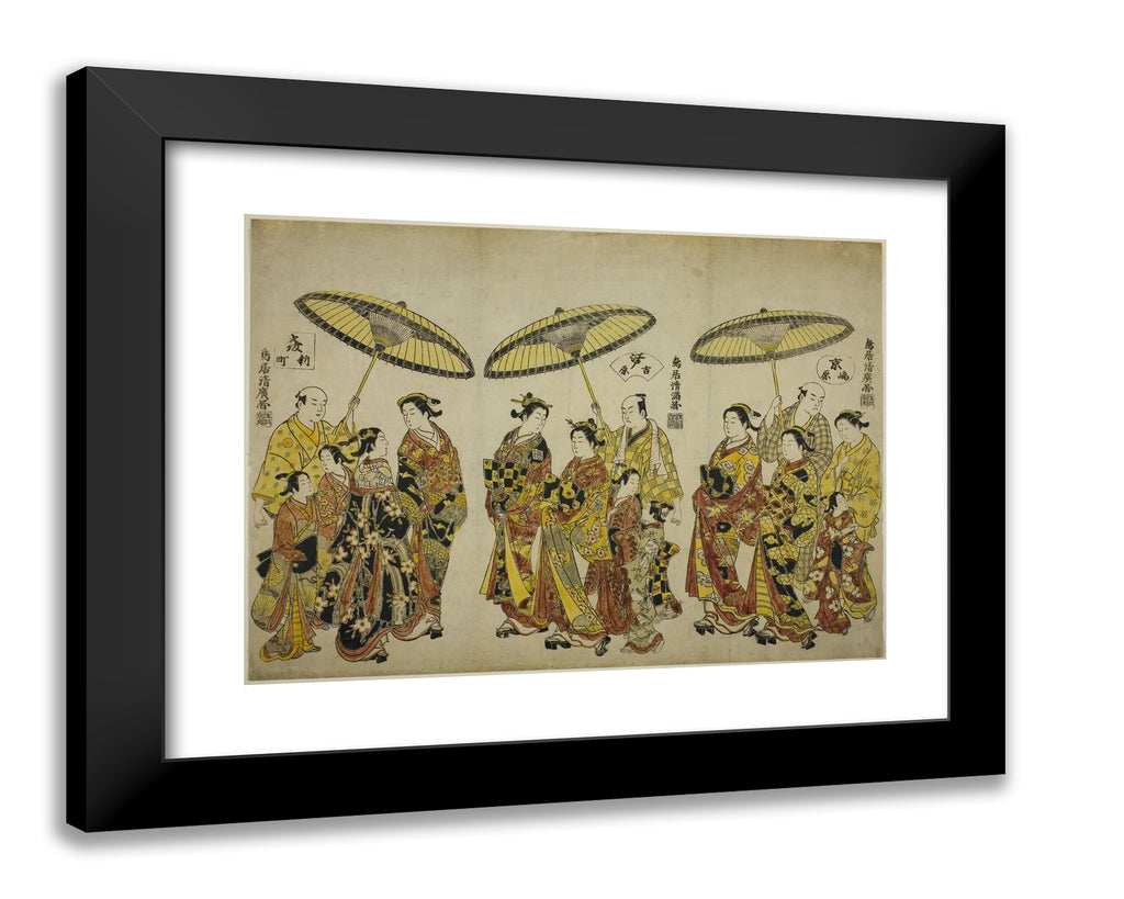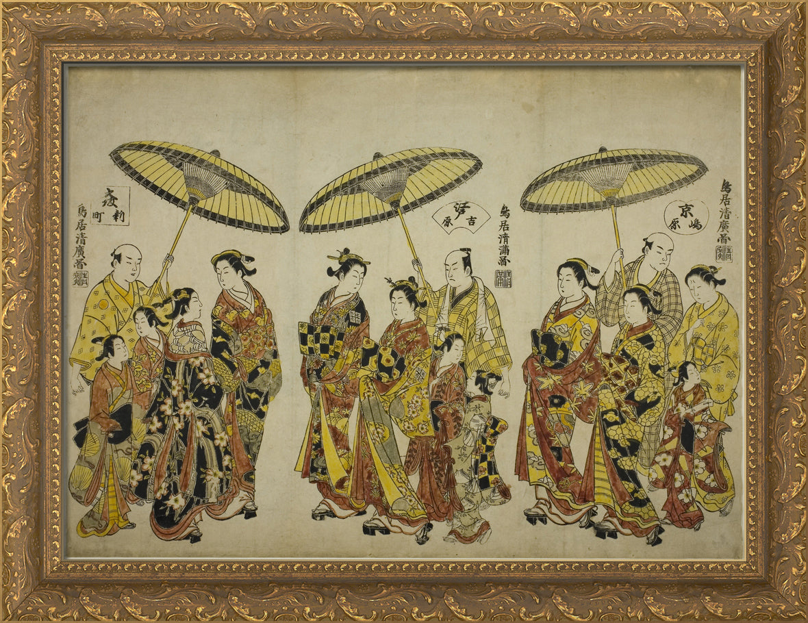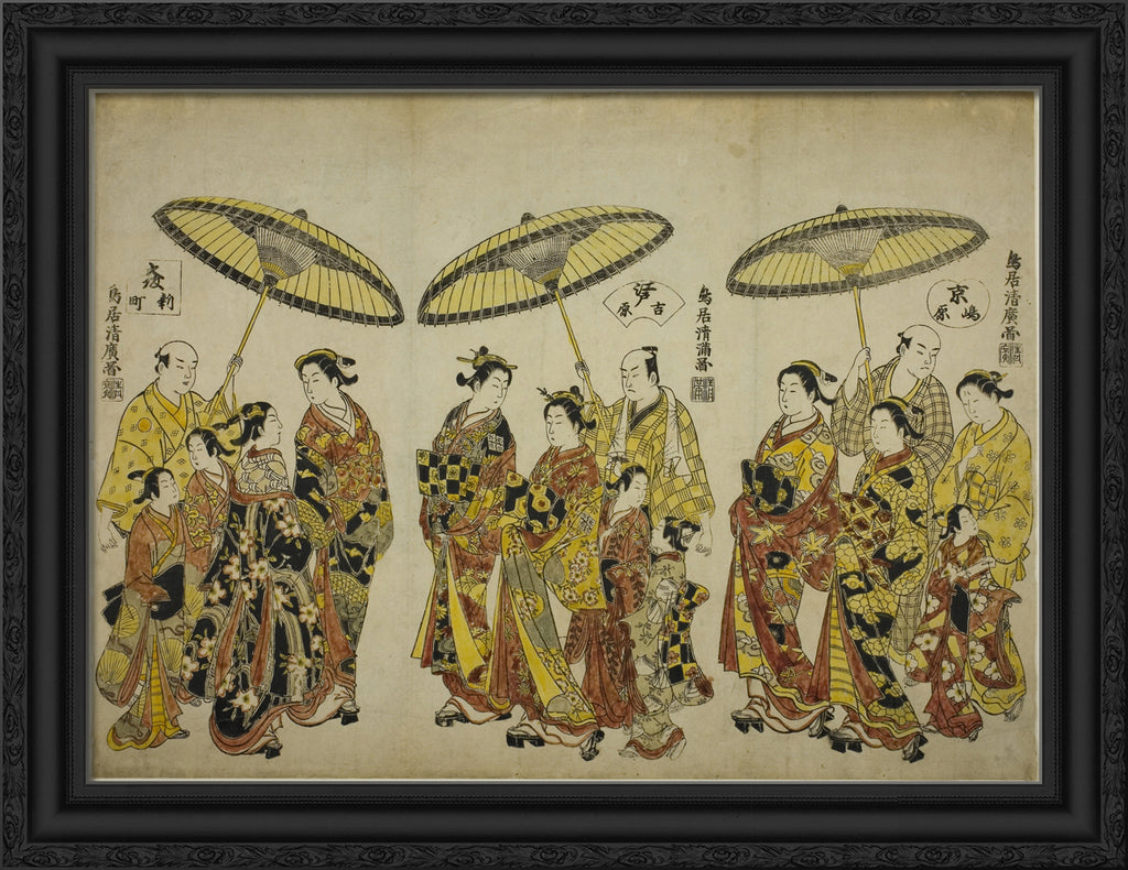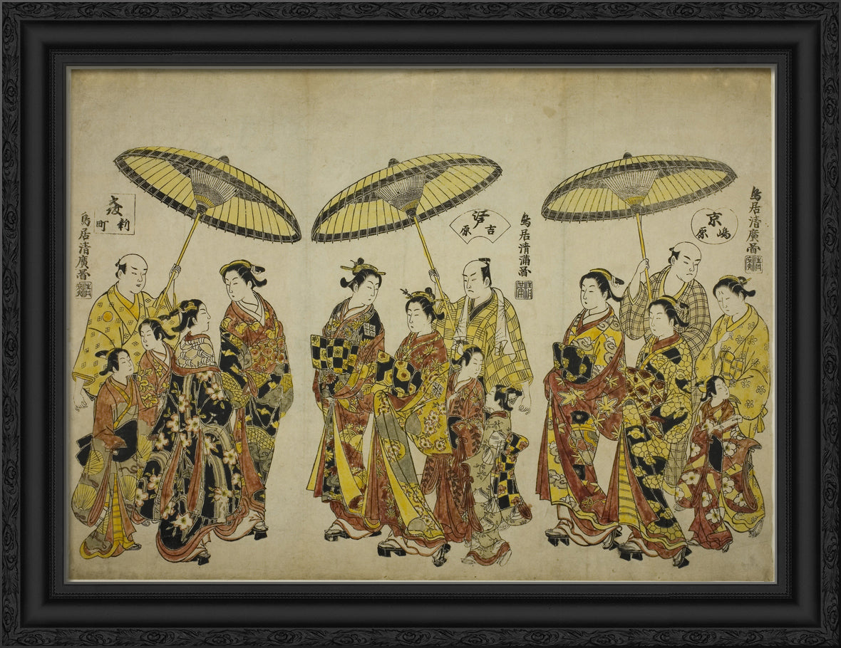 / Beauties of the Three Capitals: Shimabara in Kyoto (right), Yoshiwara in Edo (center), and Shinmachi in Osaka (left) by Torii Kiyohiro
