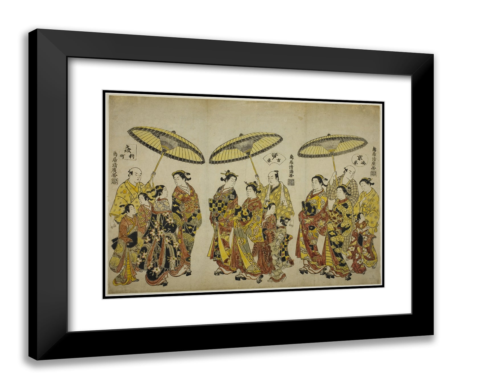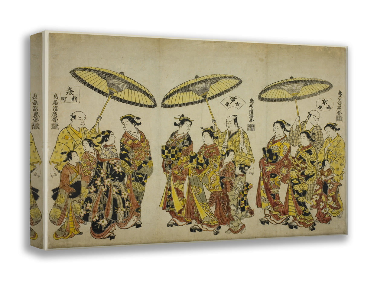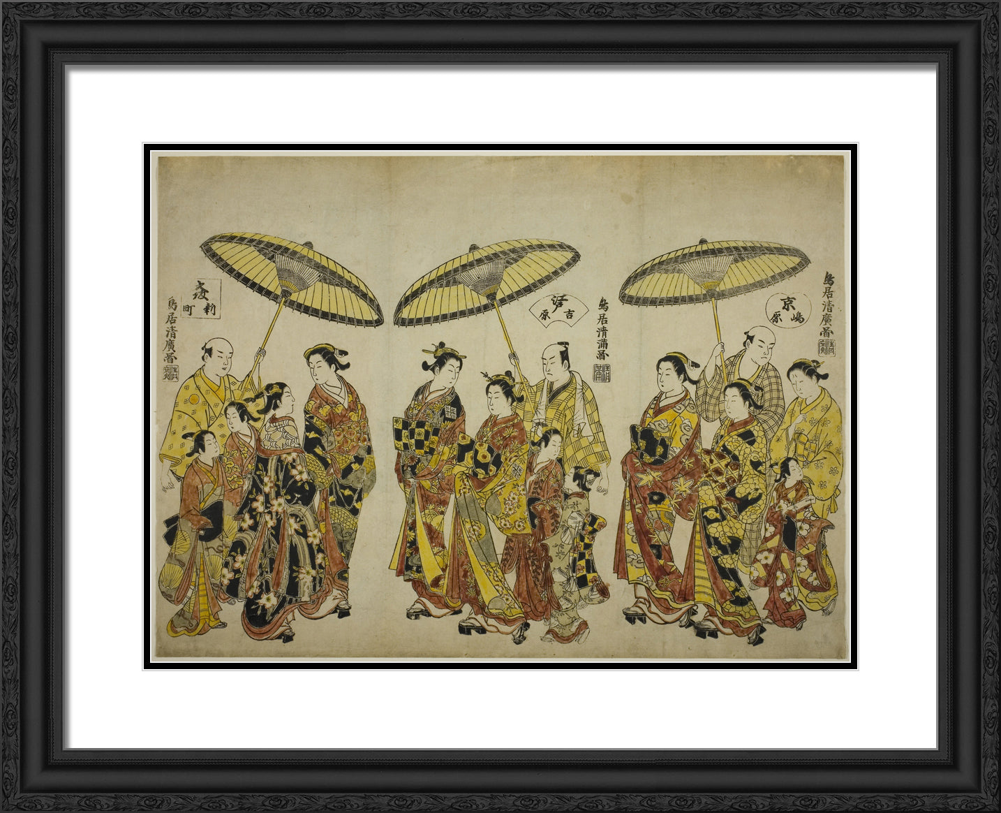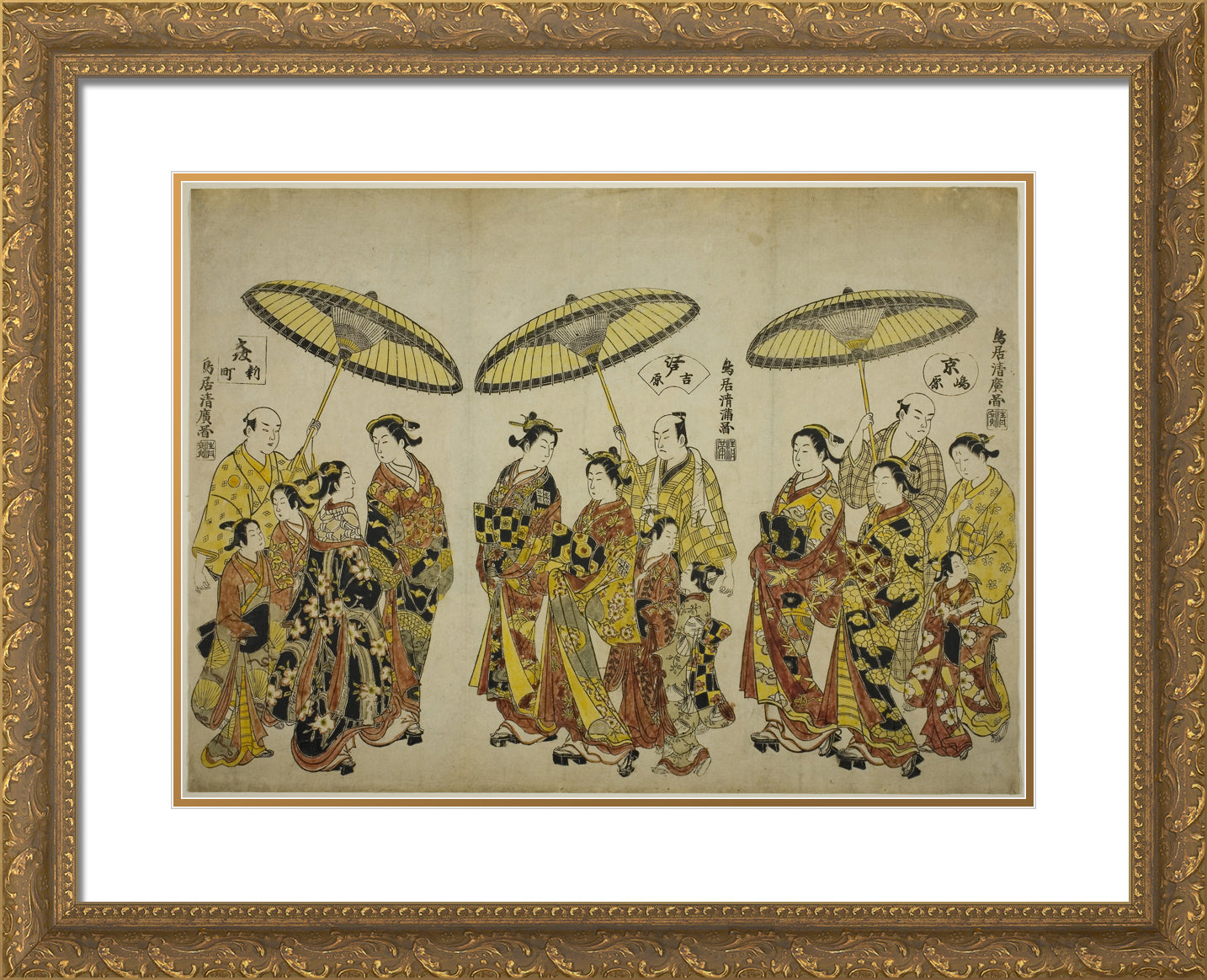 / Beauties of the Three Capitals: Shimabara in Kyoto (right), Yoshiwara in Edo (center), and Shinmachi in Osaka (left) by Torii Kiyohiro