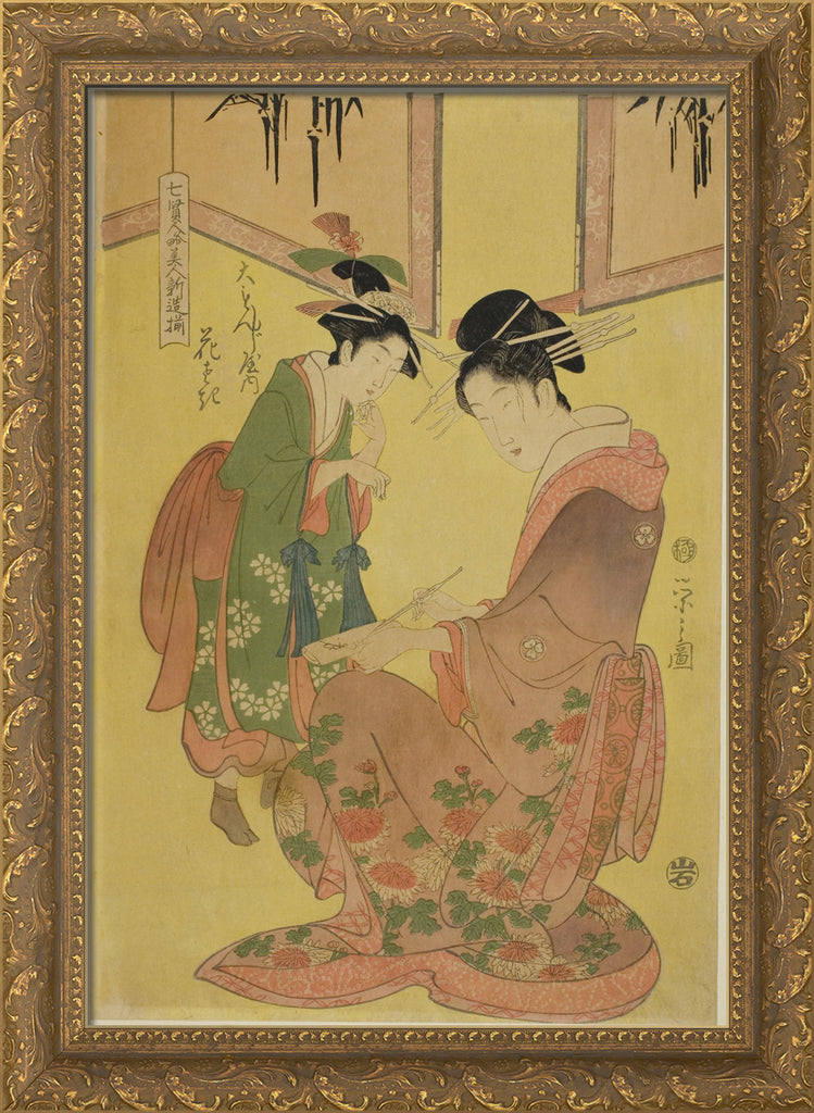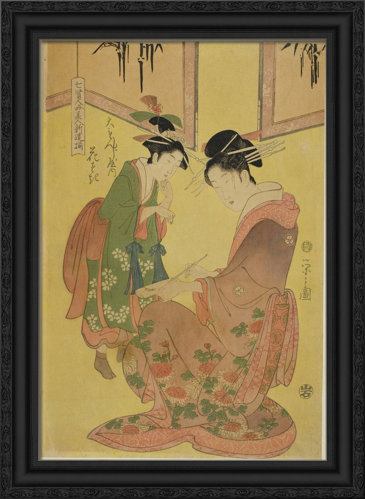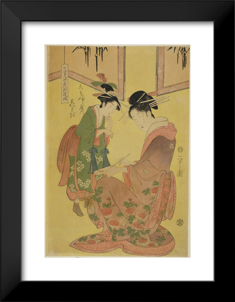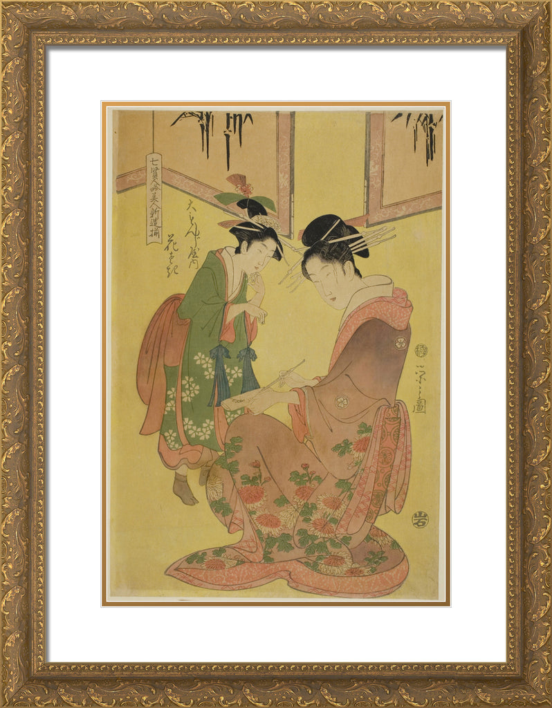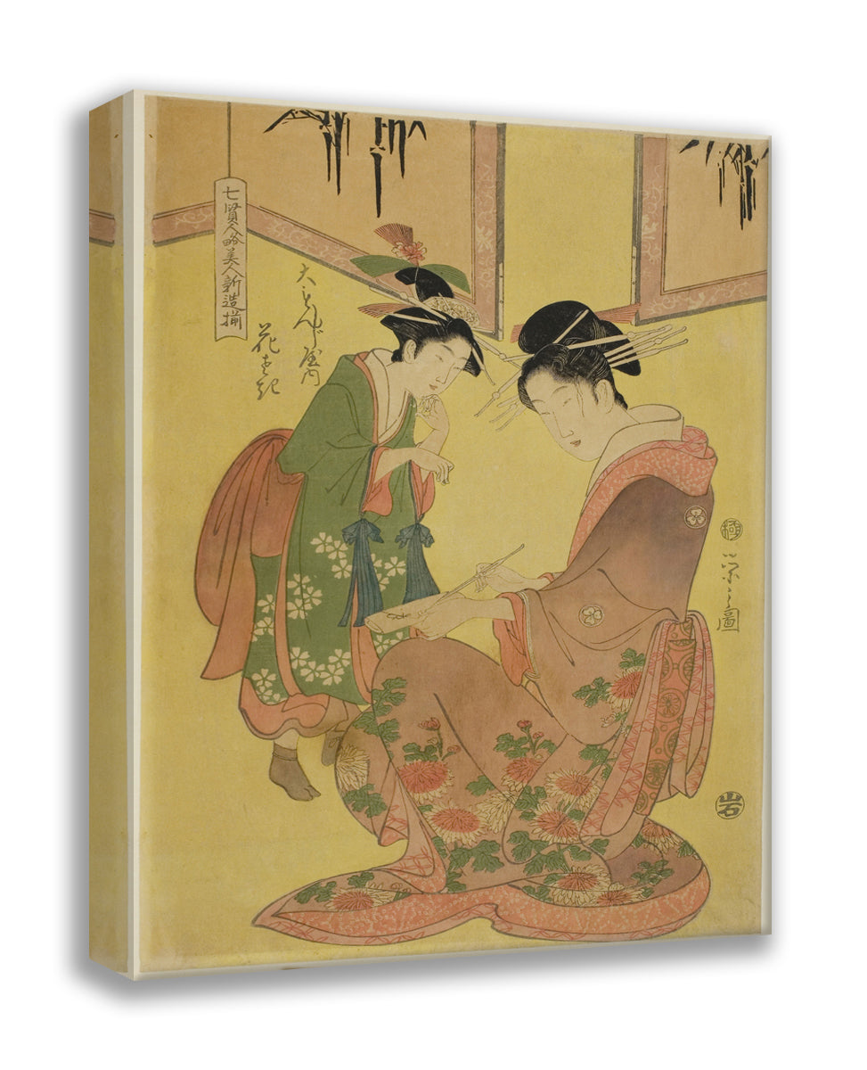 / Beauties Parodying the Seven Sages - A Selection of Younger Courtesans (Shichi kenjin yatsushi bijin shinzo zoroe): Hanasaki of the Daimonjiya by Chobunsai Eishi