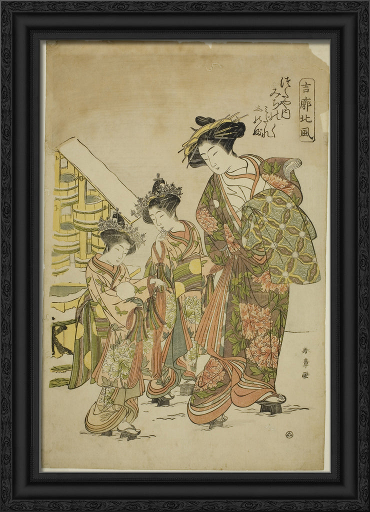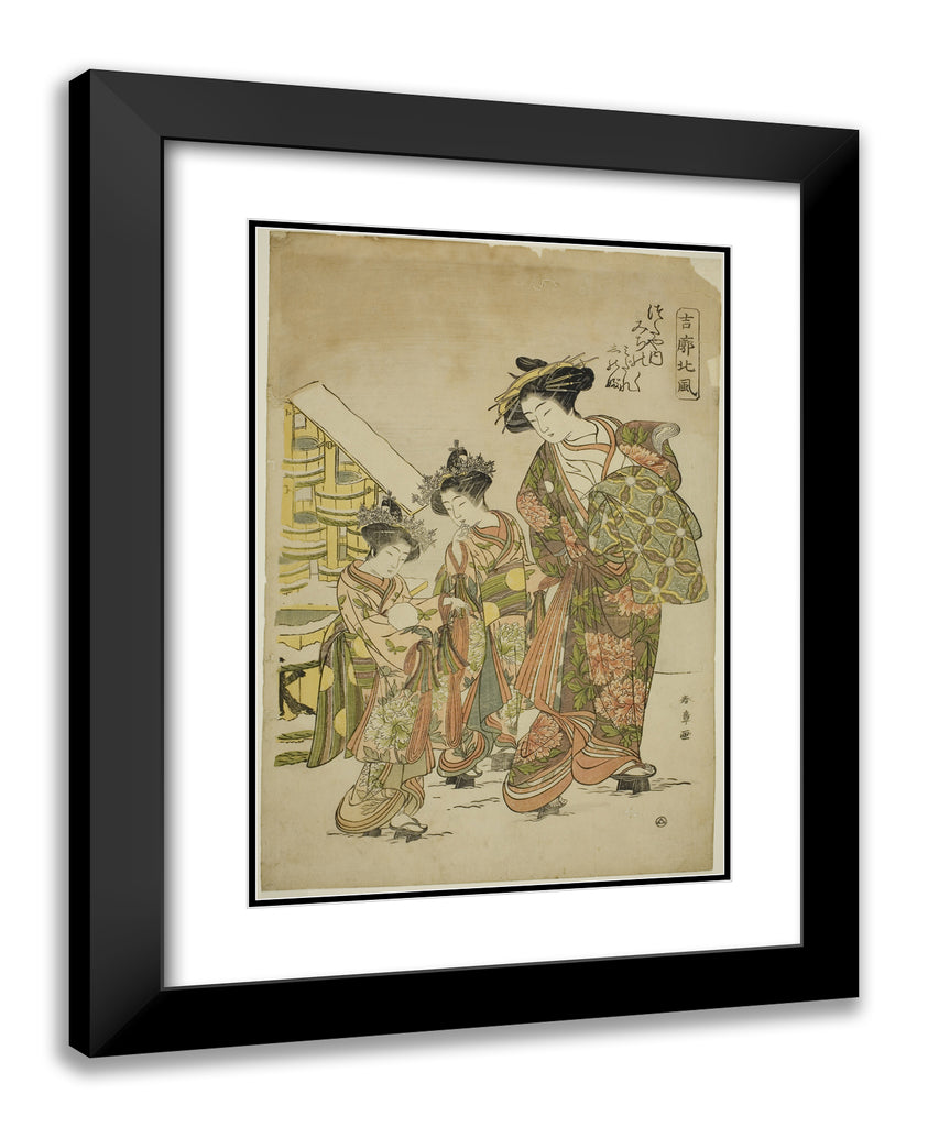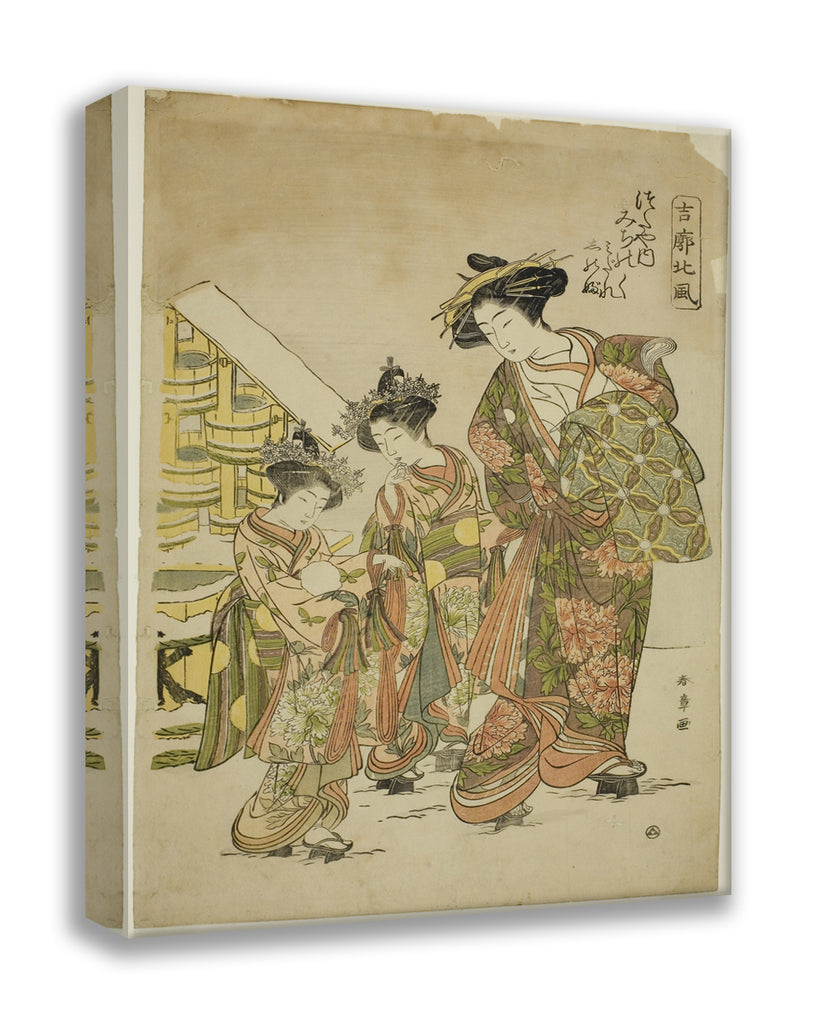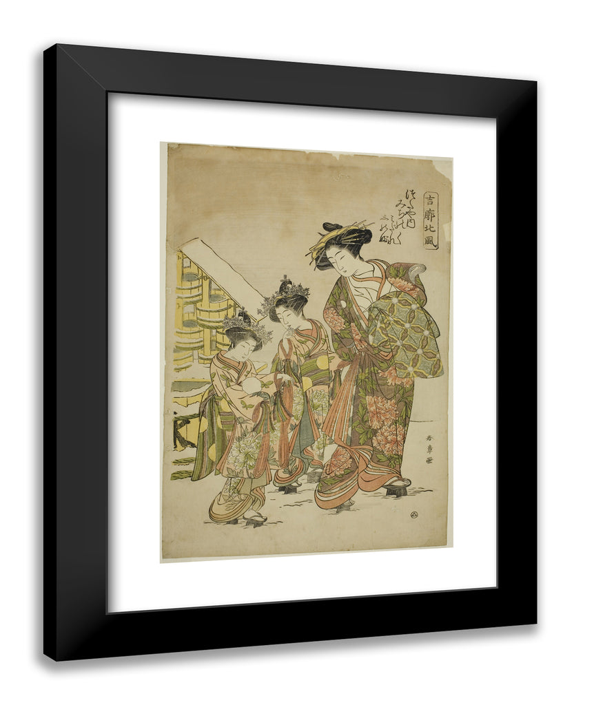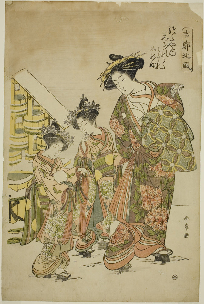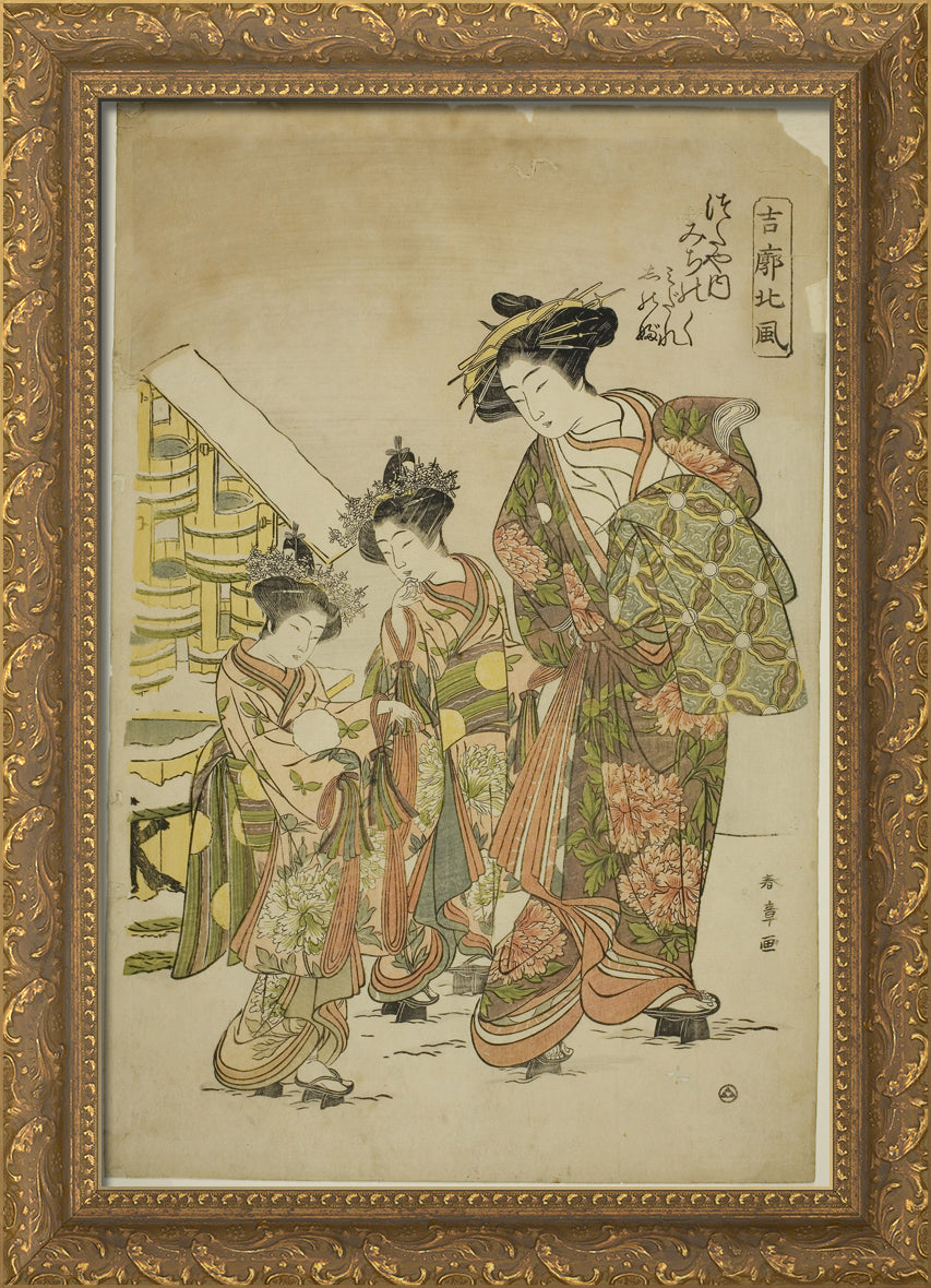 / The Courtesan Michinoku of the Tsutaya House with her Kamuro Midare and Shinobu, from the series "Kikkaku Hokufu" by Katsukawa Shunsho