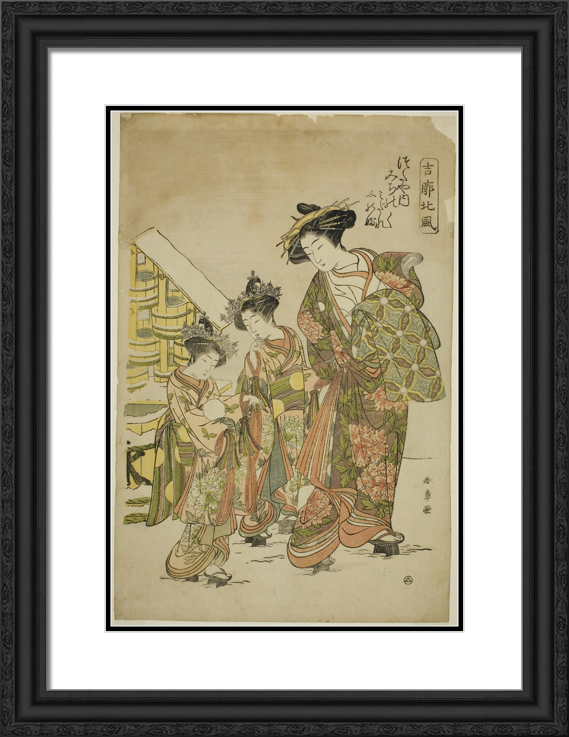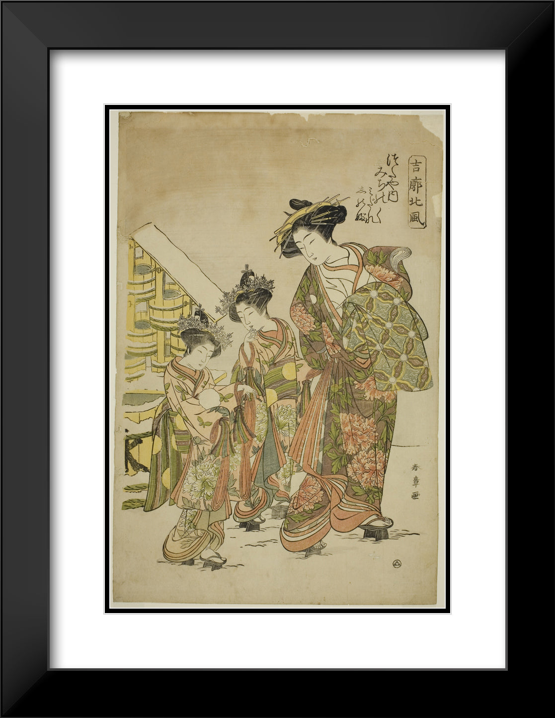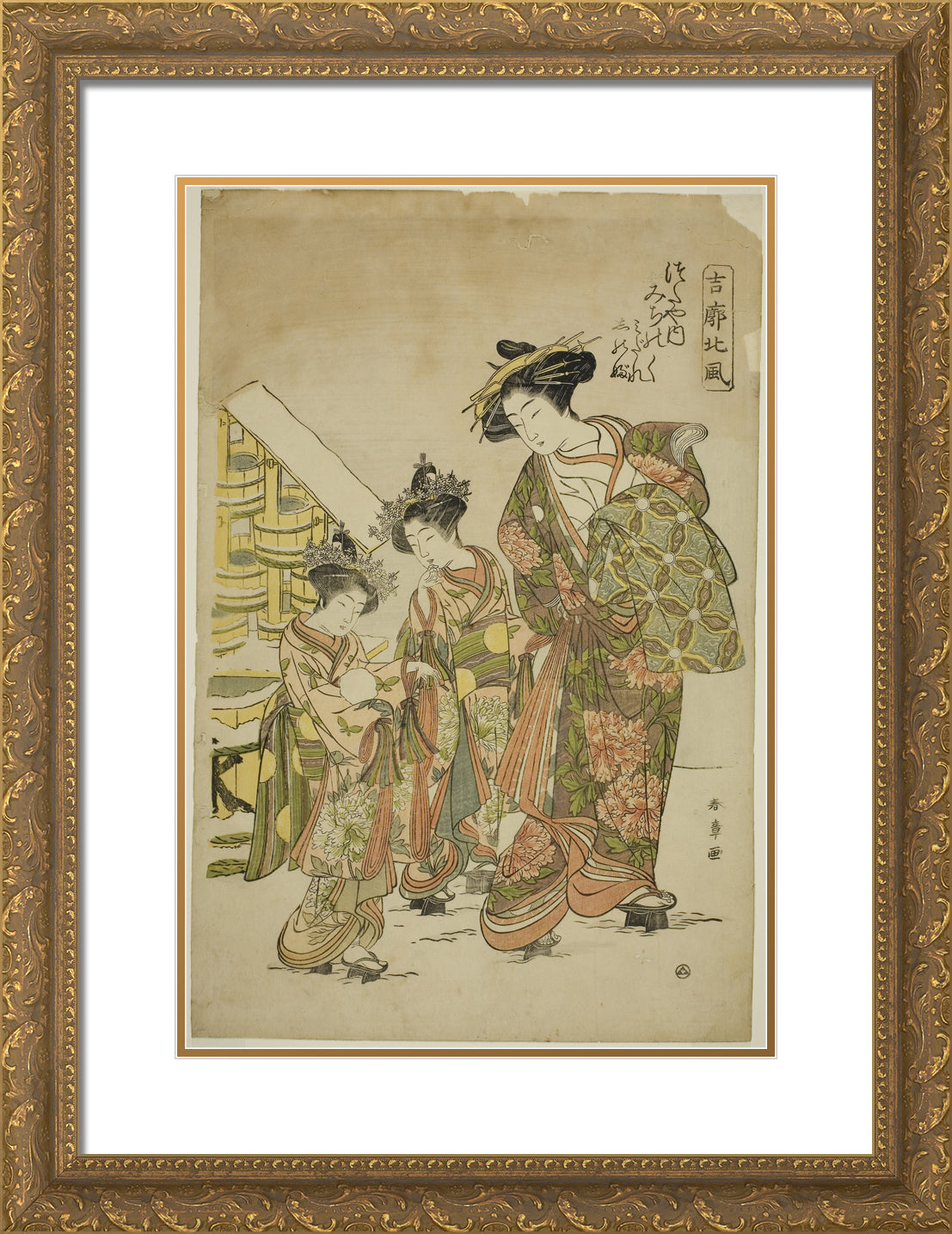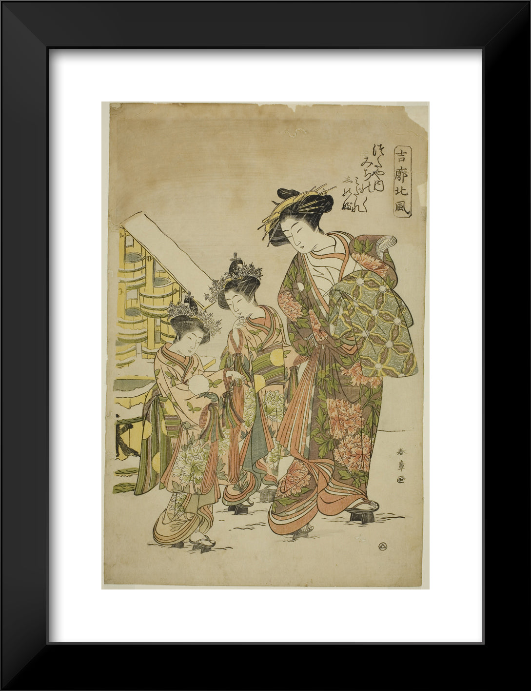 / The Courtesan Michinoku of the Tsutaya House with her Kamuro Midare and Shinobu, from the series "Kikkaku Hokufu" by Katsukawa Shunsho