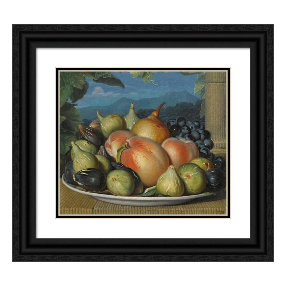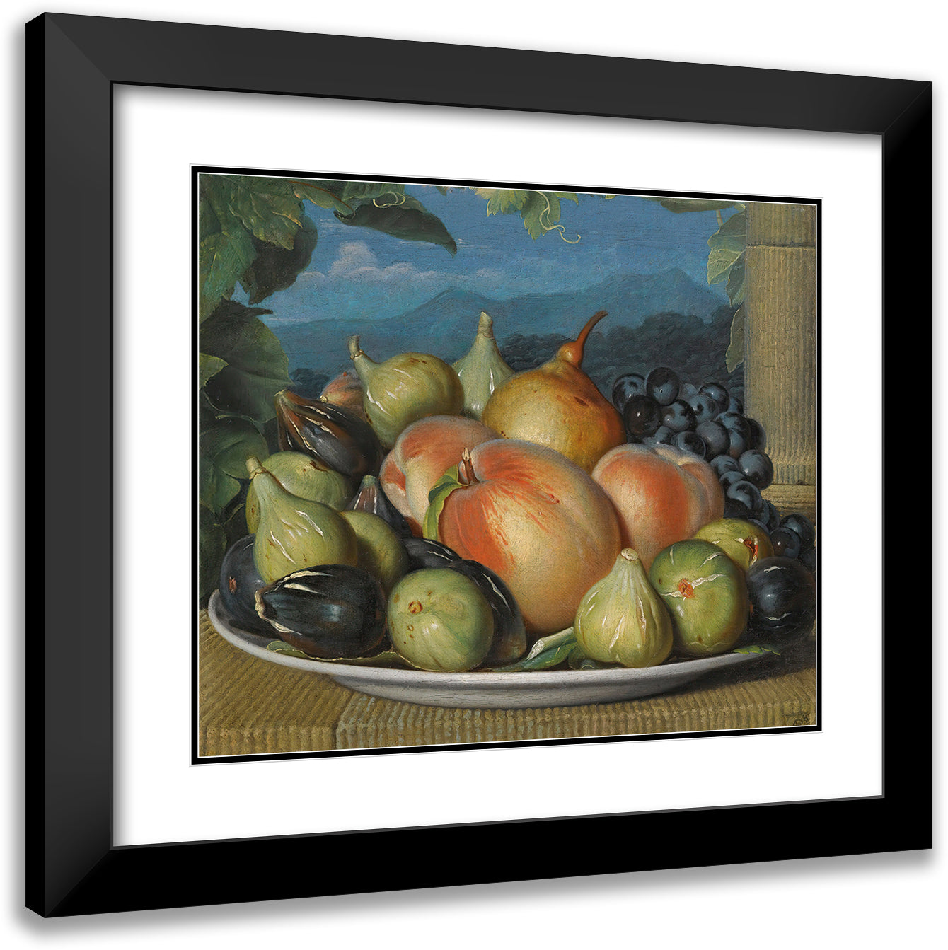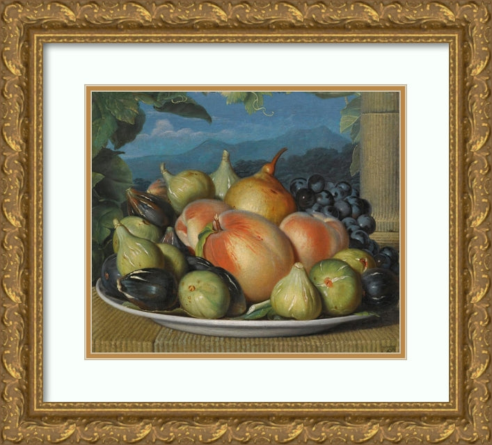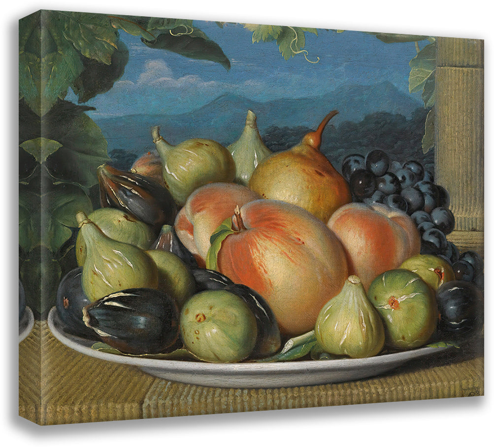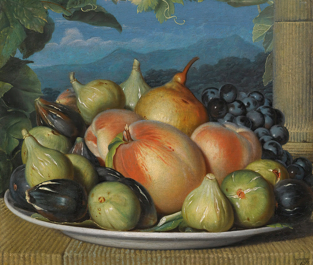 / A Still Life with Figs, Peaches, a Pear and Black Grapes on a White Dish, an Extensive Landscape Beyond (circa 1800)
