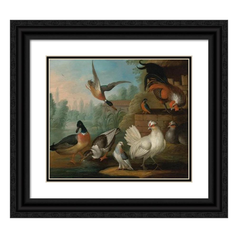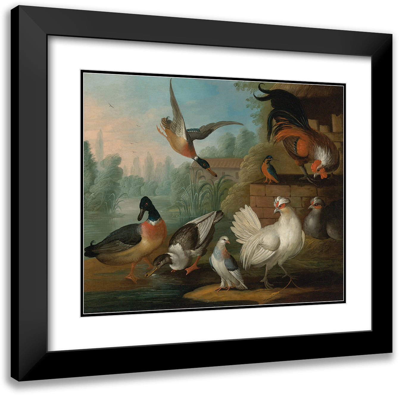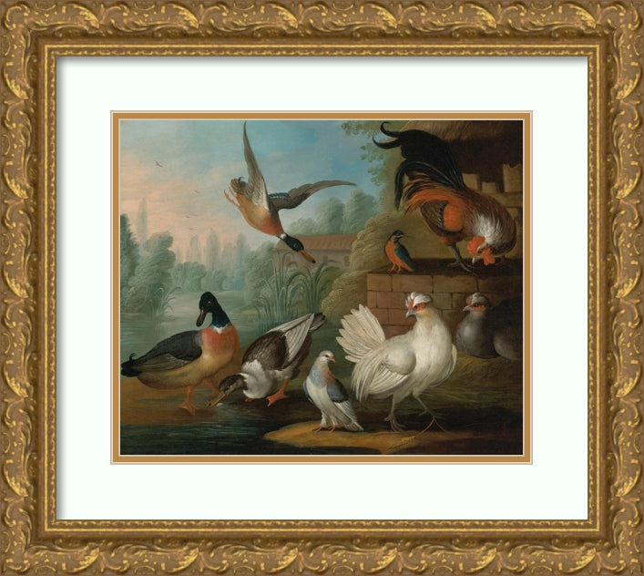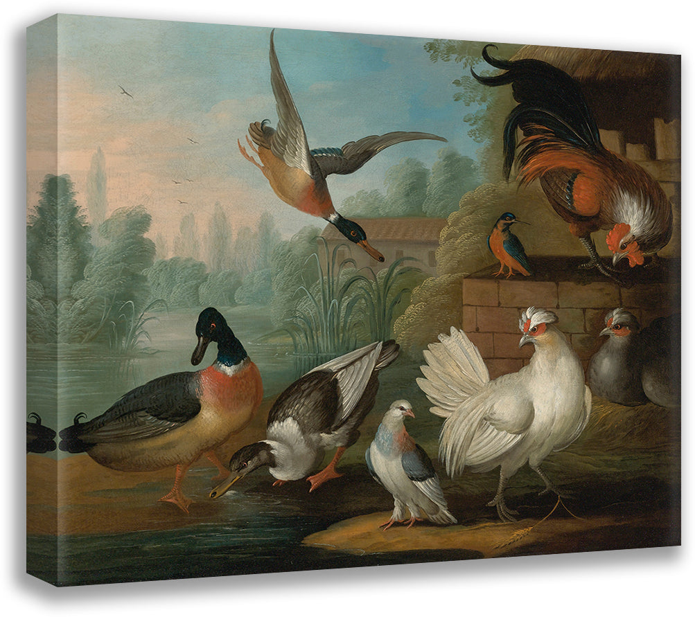 Still Life with Cockerels, Ducks, a Kingfisher and a Pigeon in a River Landscape