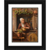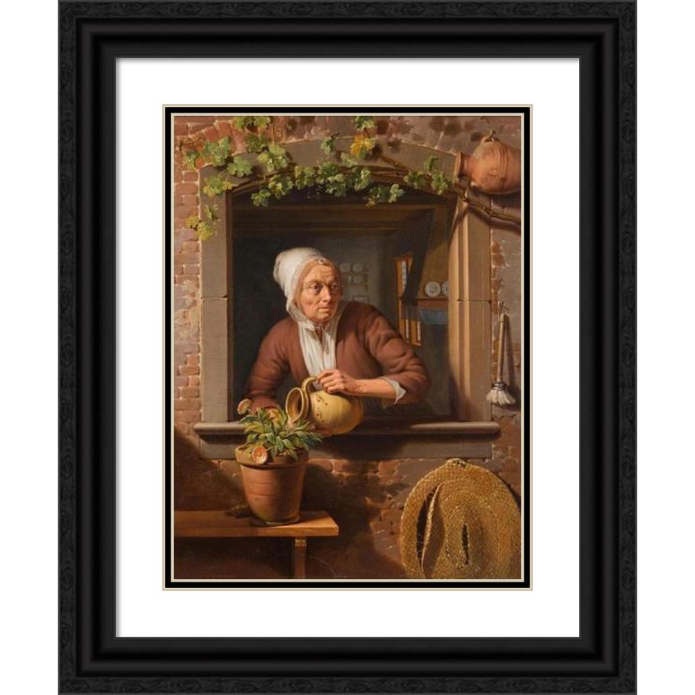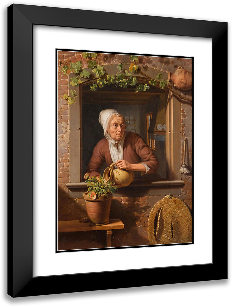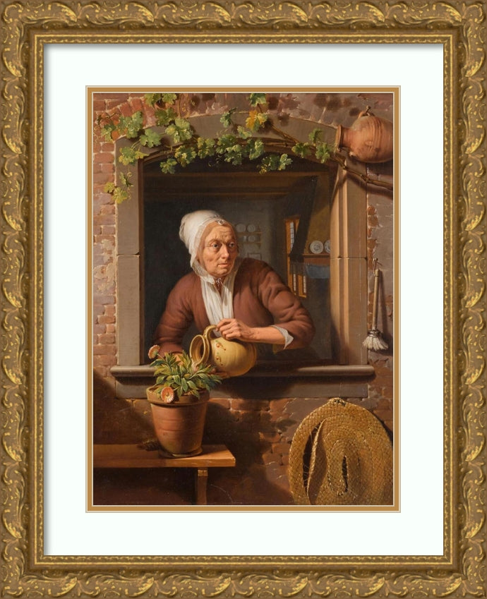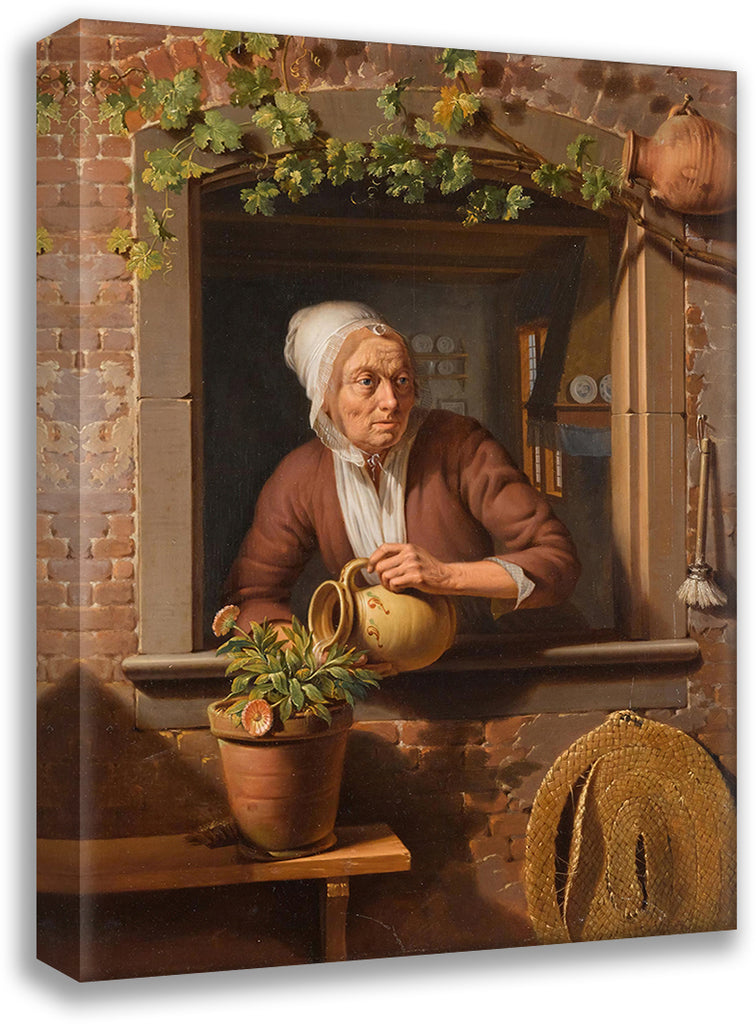 / A Peasant Lady Watering a Flower Pot on a Wooden Table with a View of the Interior of Her Home in the Background