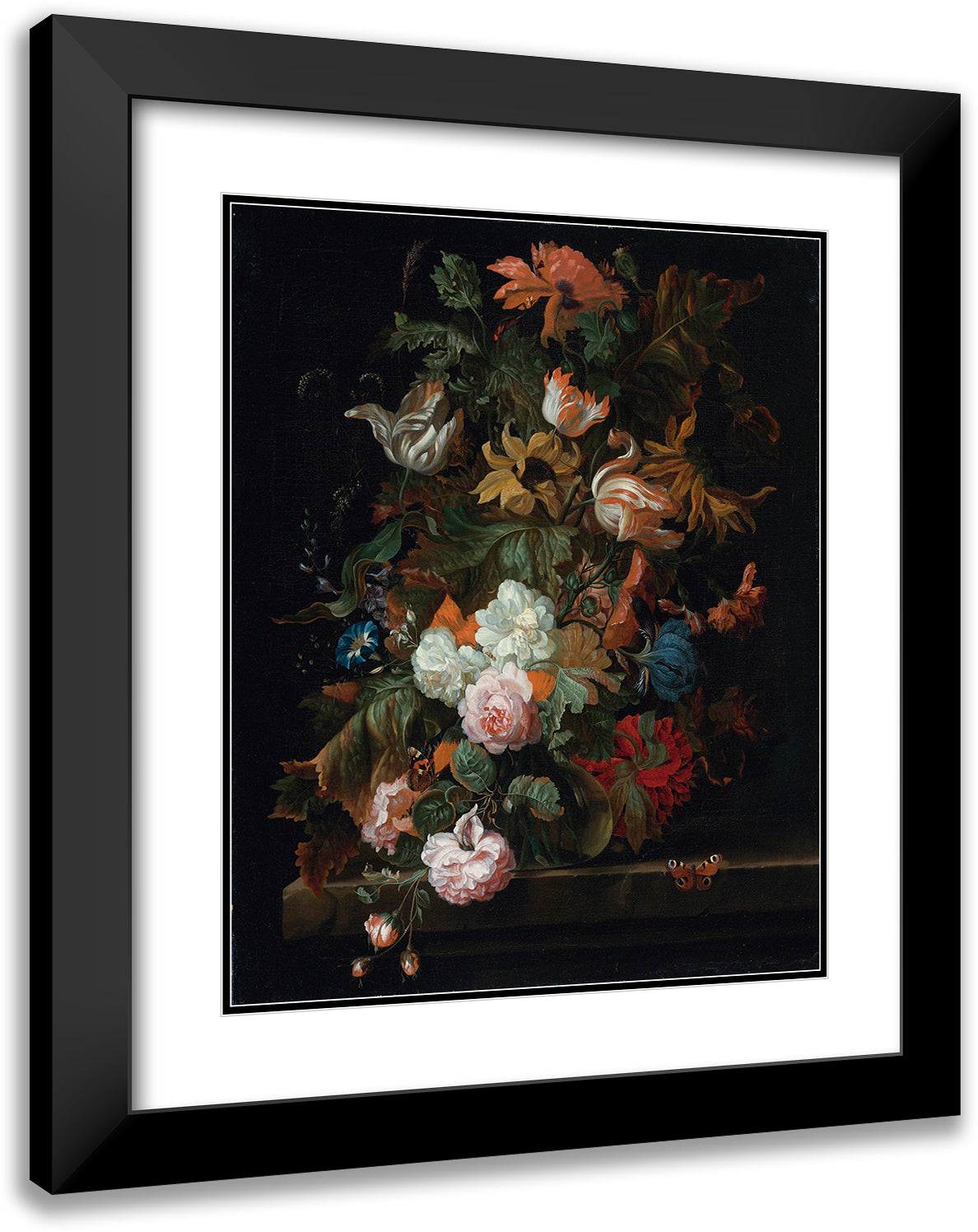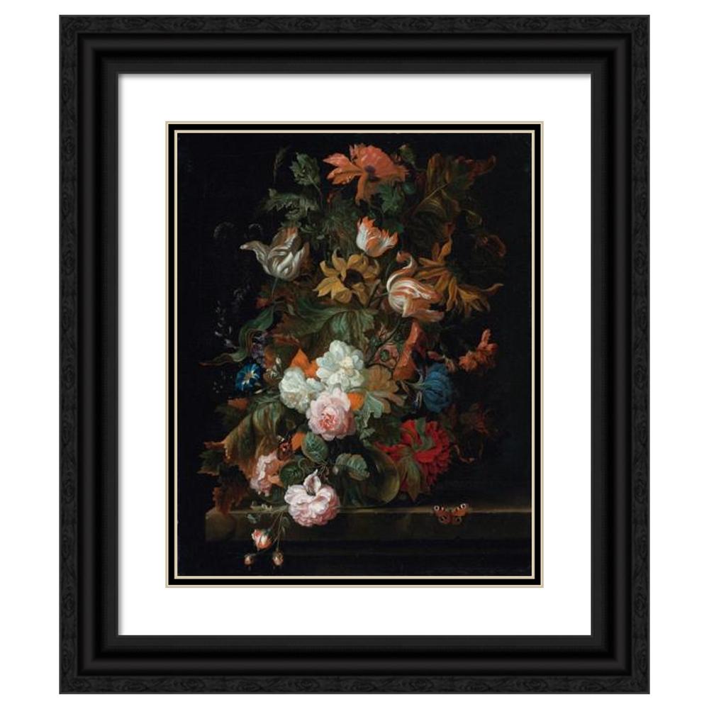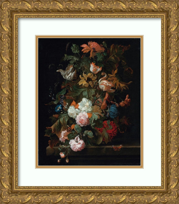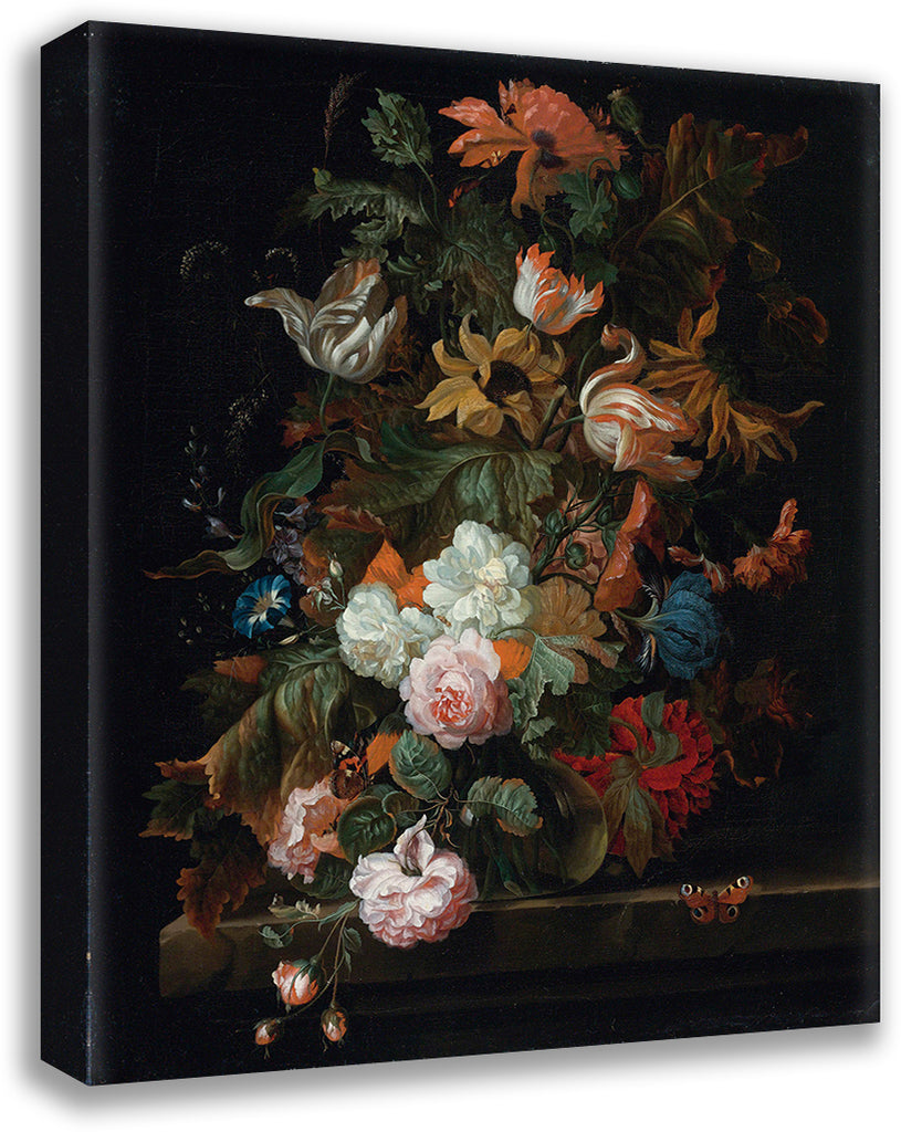 / Still Life of Flowers in a Glass Vase with a Butterfly, All on a Ledge