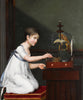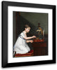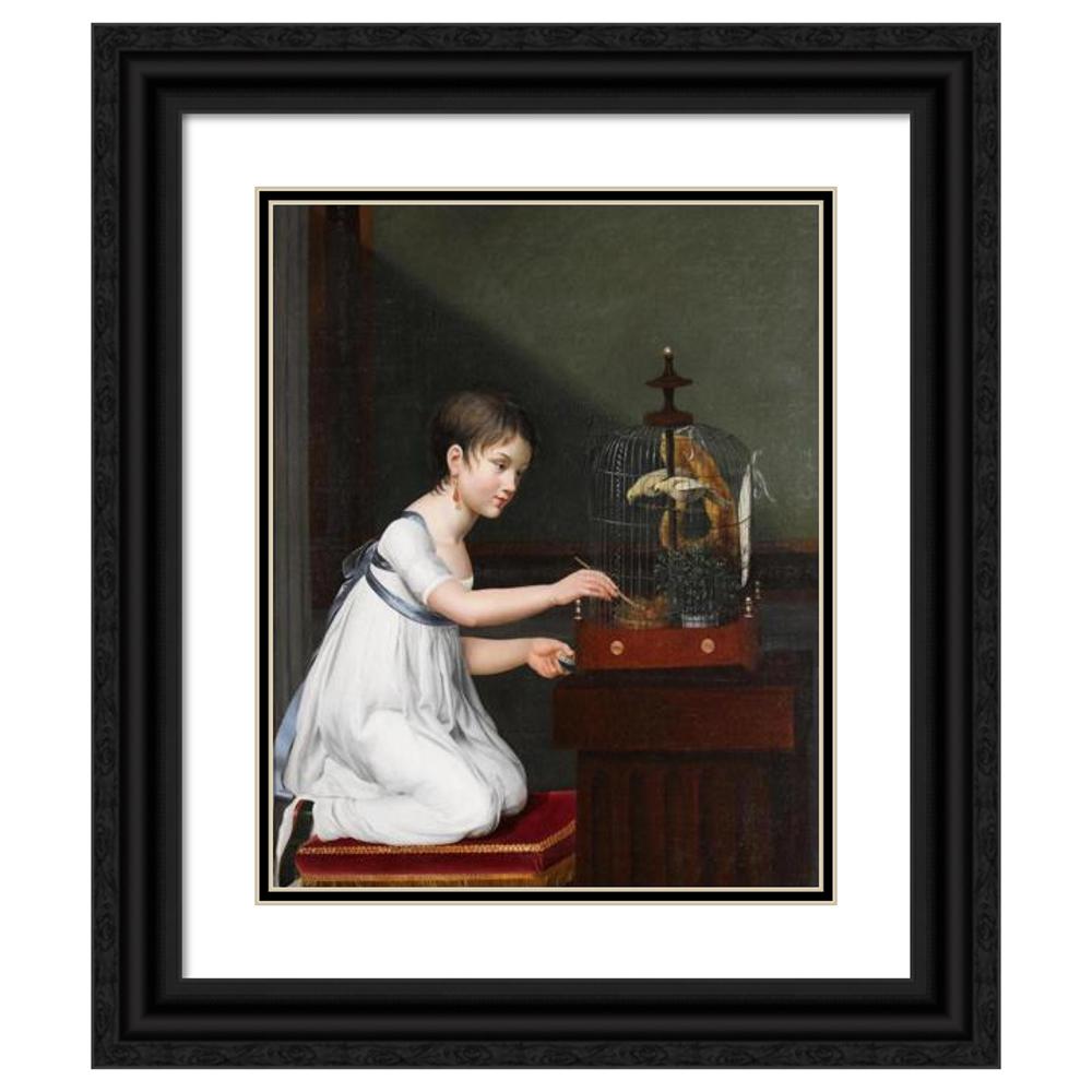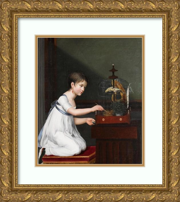 A Young Girl in a White Dress with a Green Sash, Kneeling by a Bird Cage While Tending to Her Birds