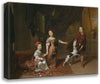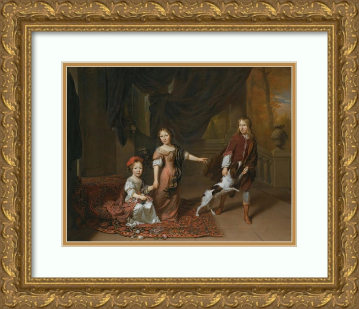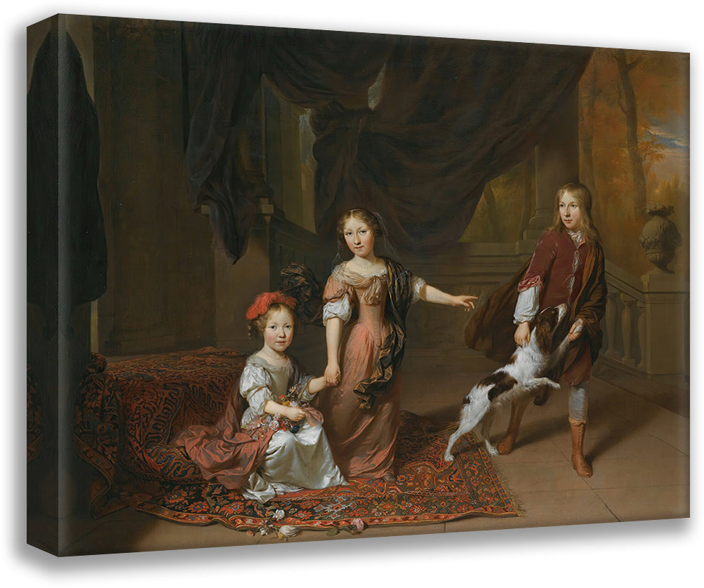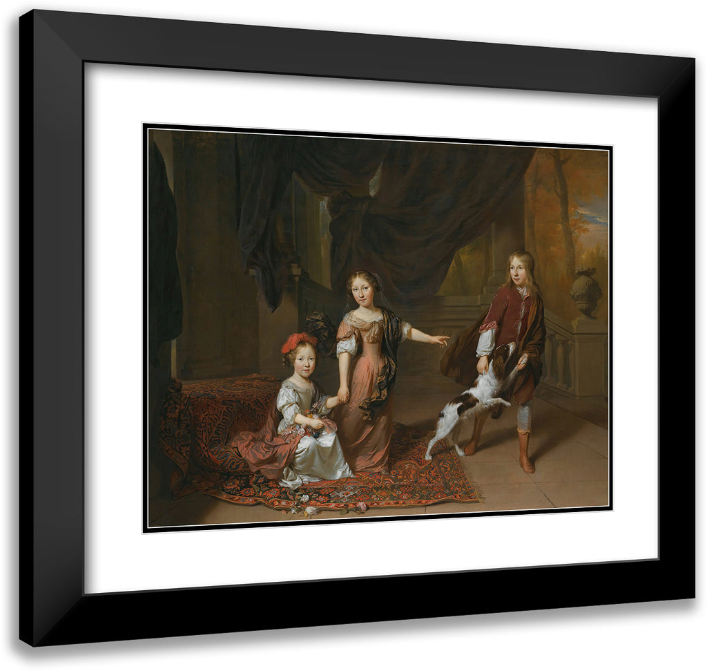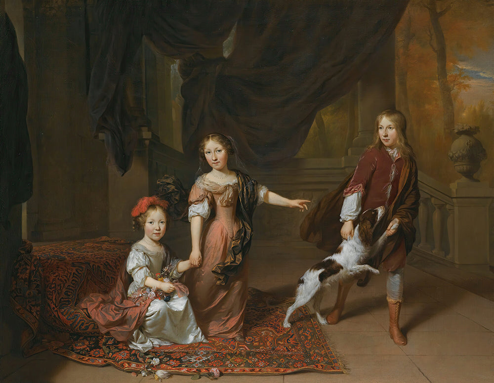 A Portrait of Two Sisters and Their Brother Playing with a Dog