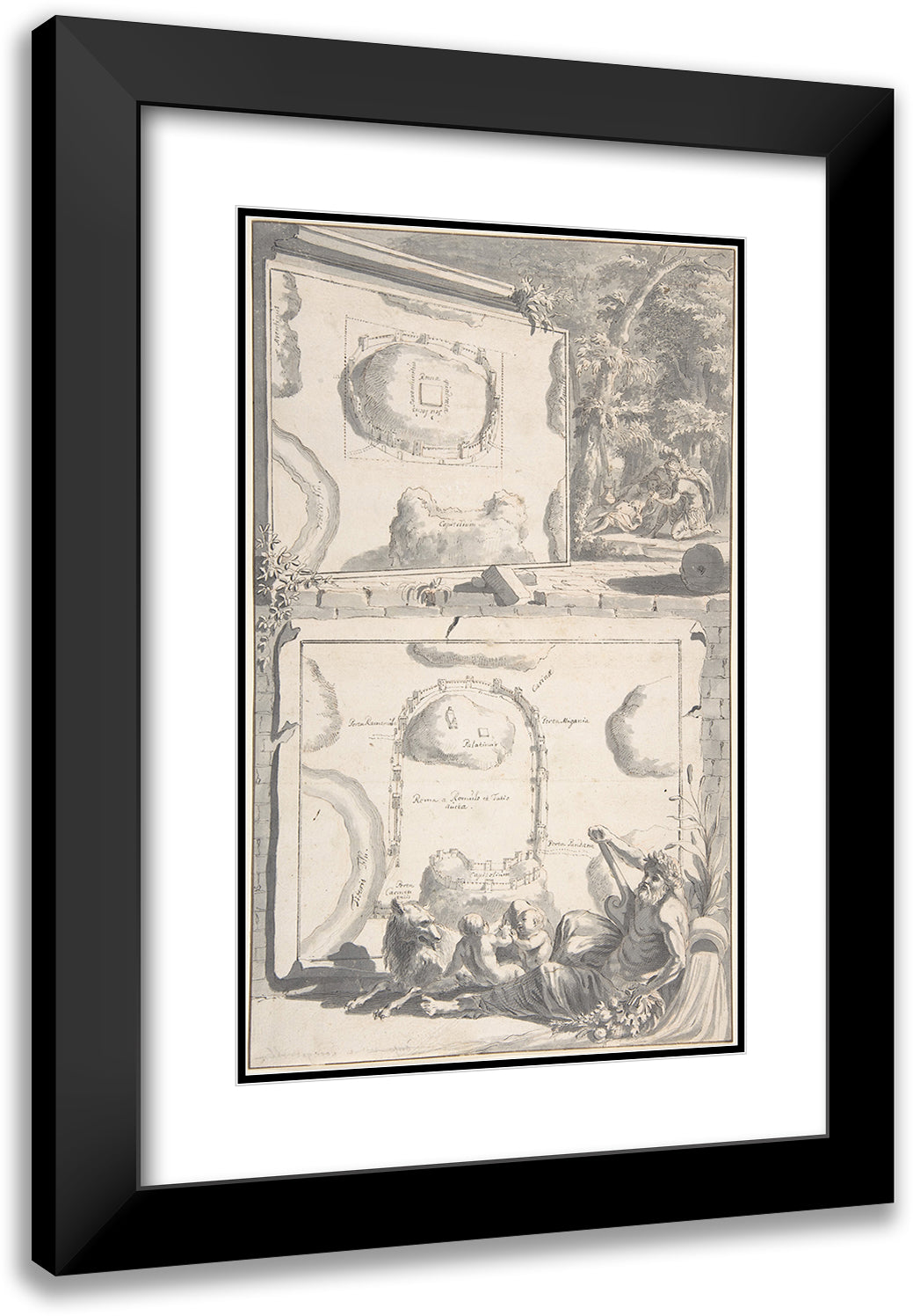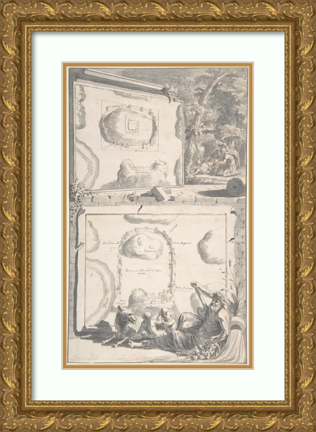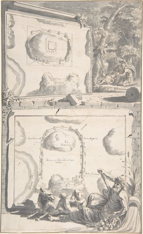 / Two Maps of Ancient Rome with a River God and Romulus and Remus (Before 1704)