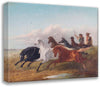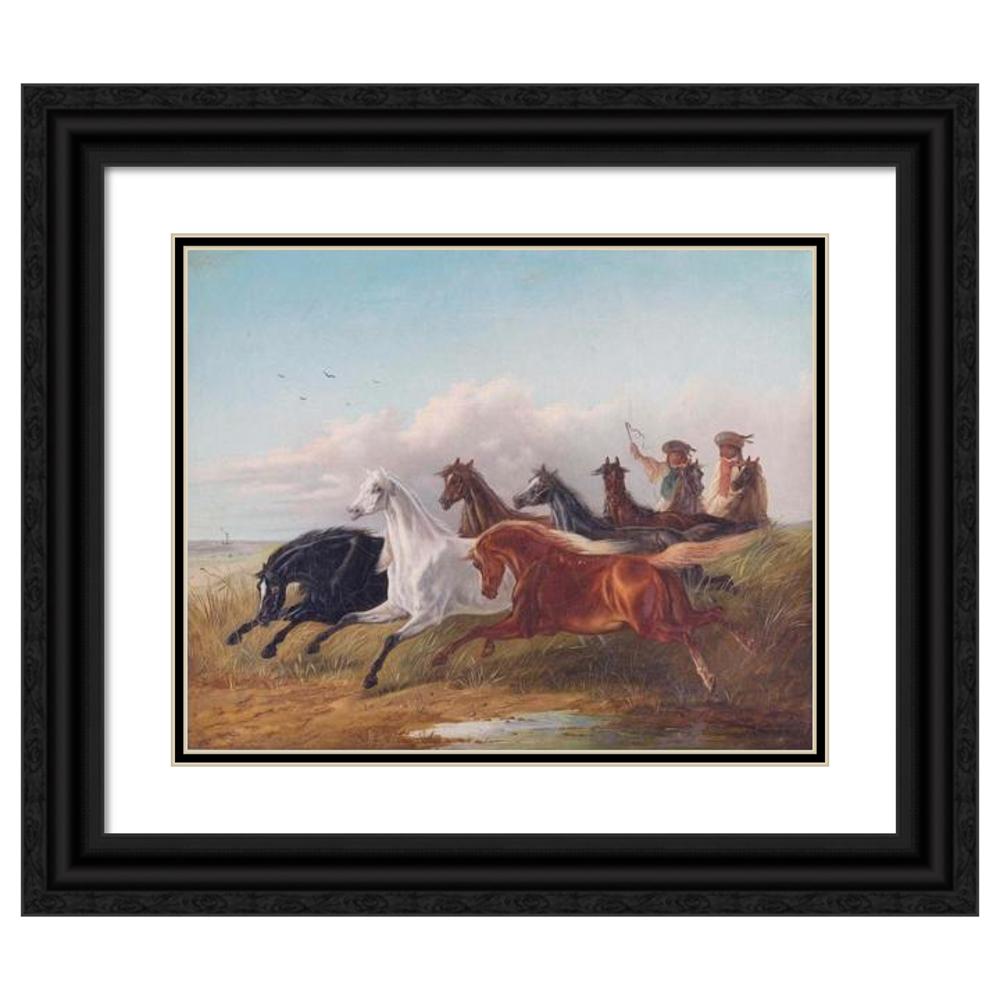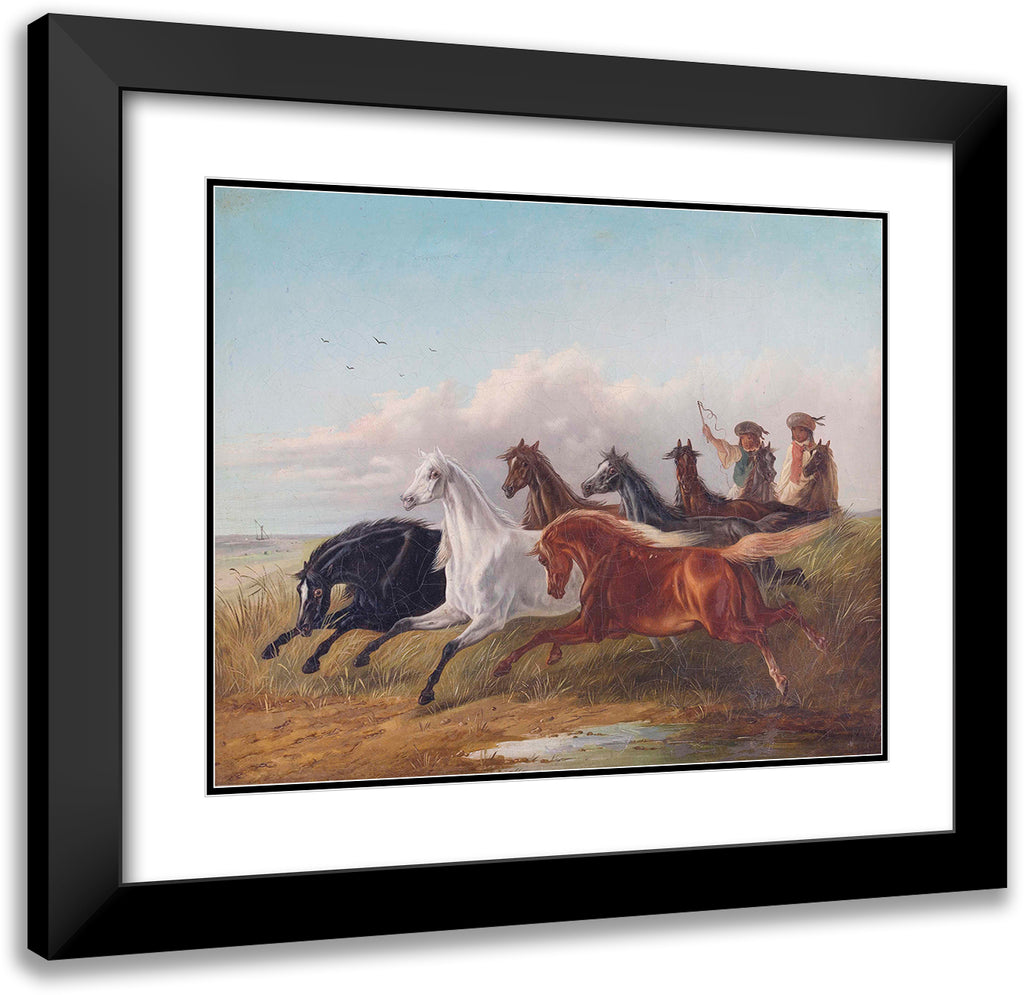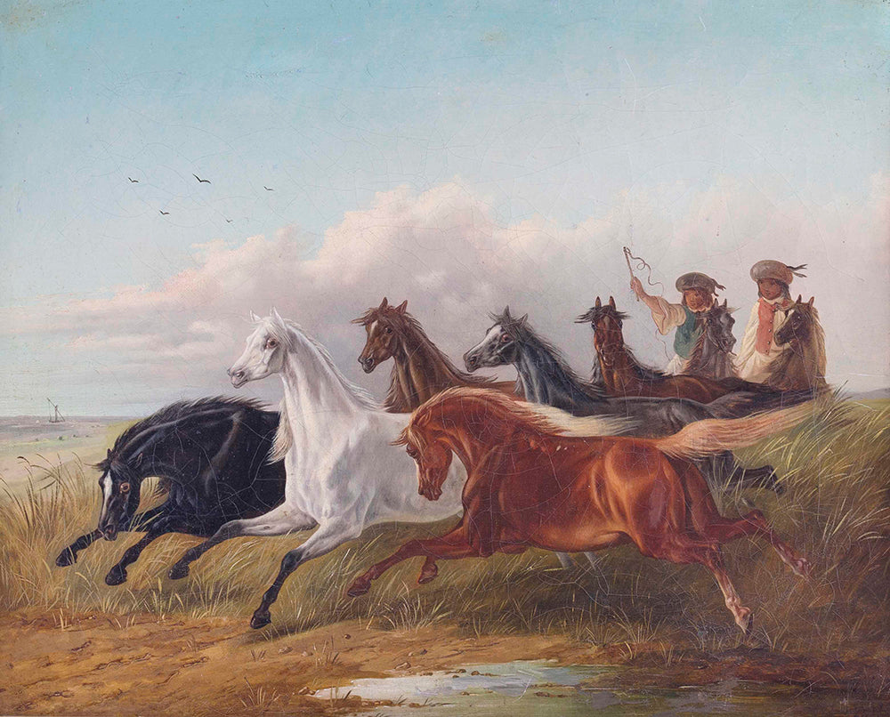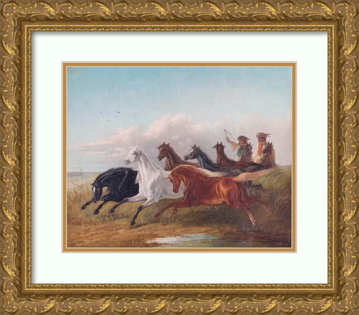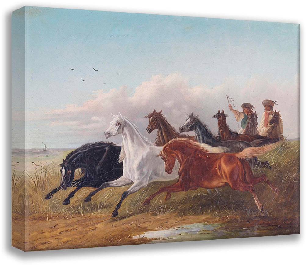 / Two Young Hungarian Riders Drive Wild Horses in the Puszta in Front of Them