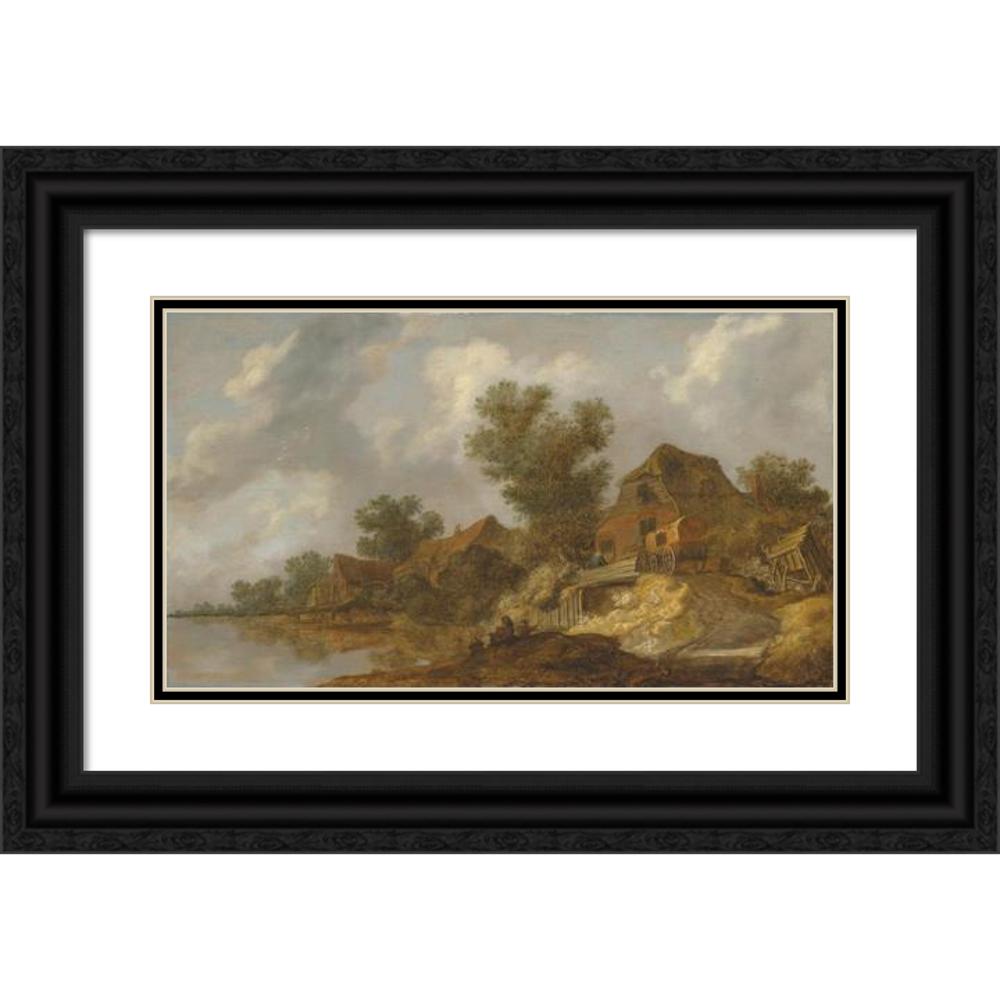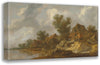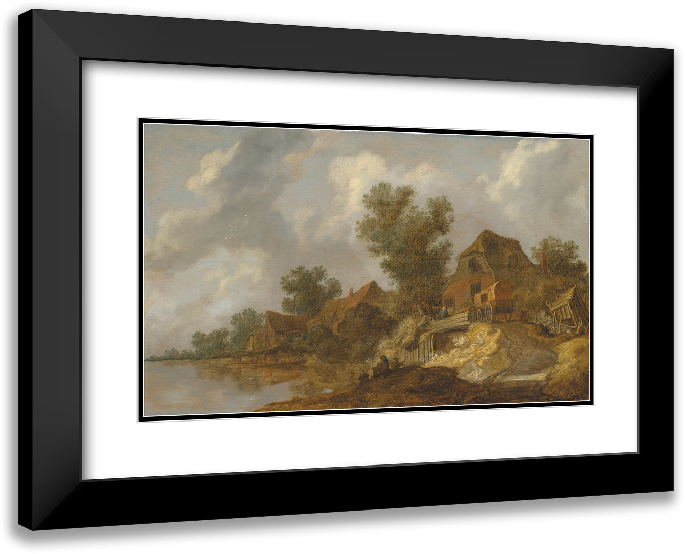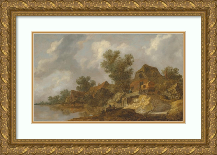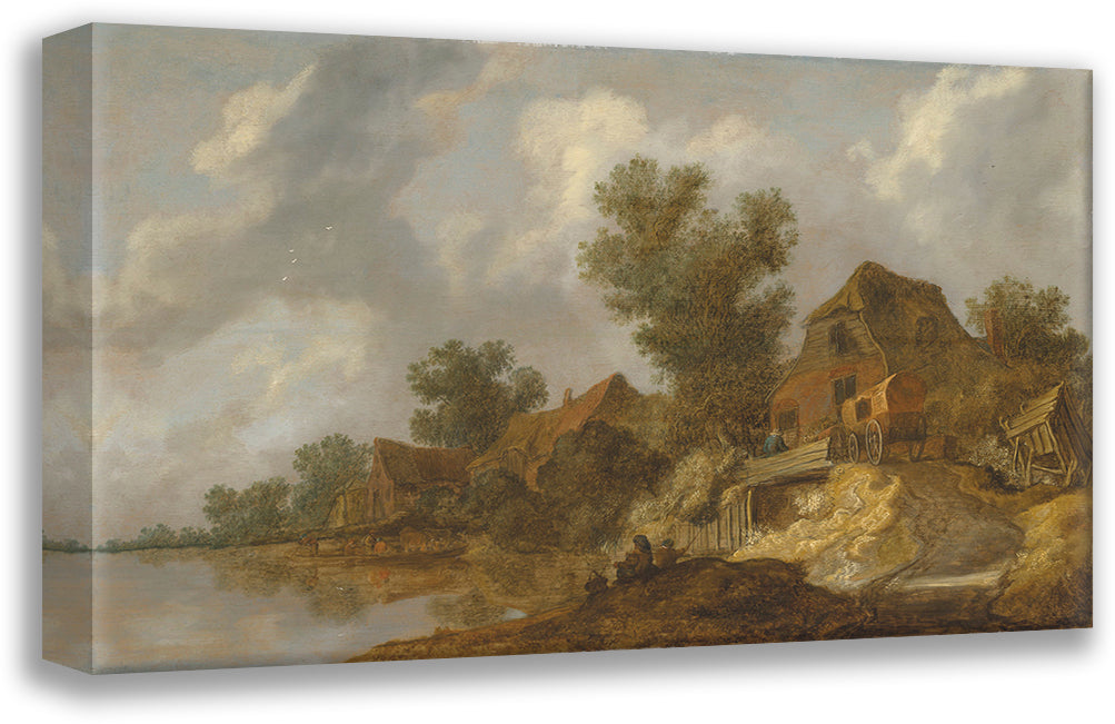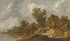 / A River Landscape with a Ferry and Fisherfolk, a Carriage on a Bridge Near Houses to the Right