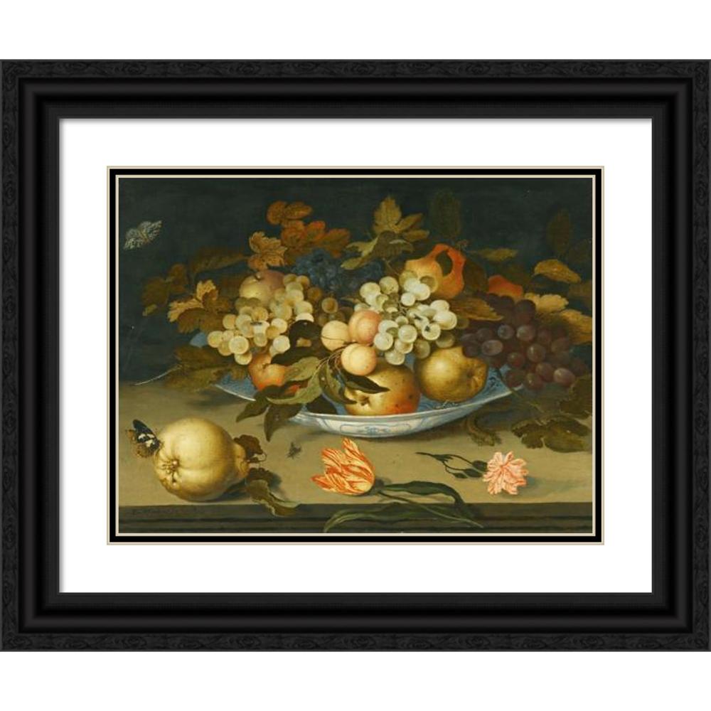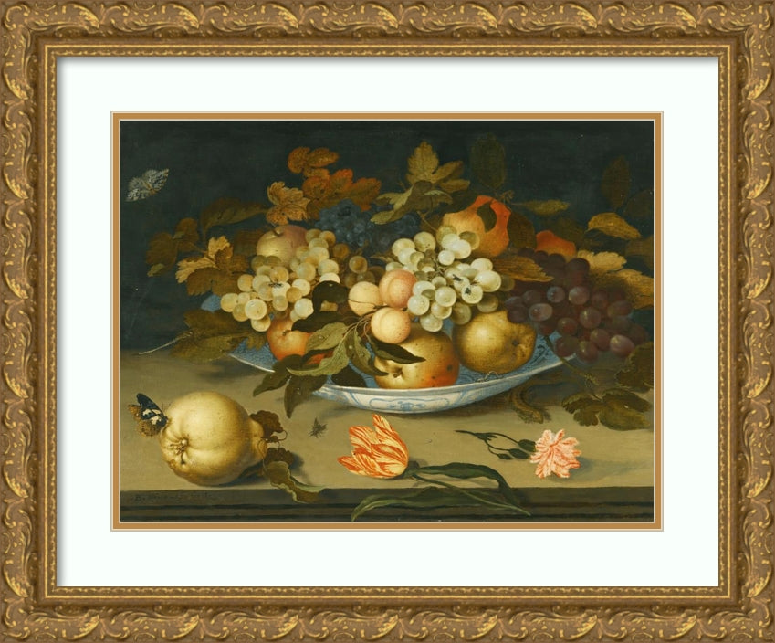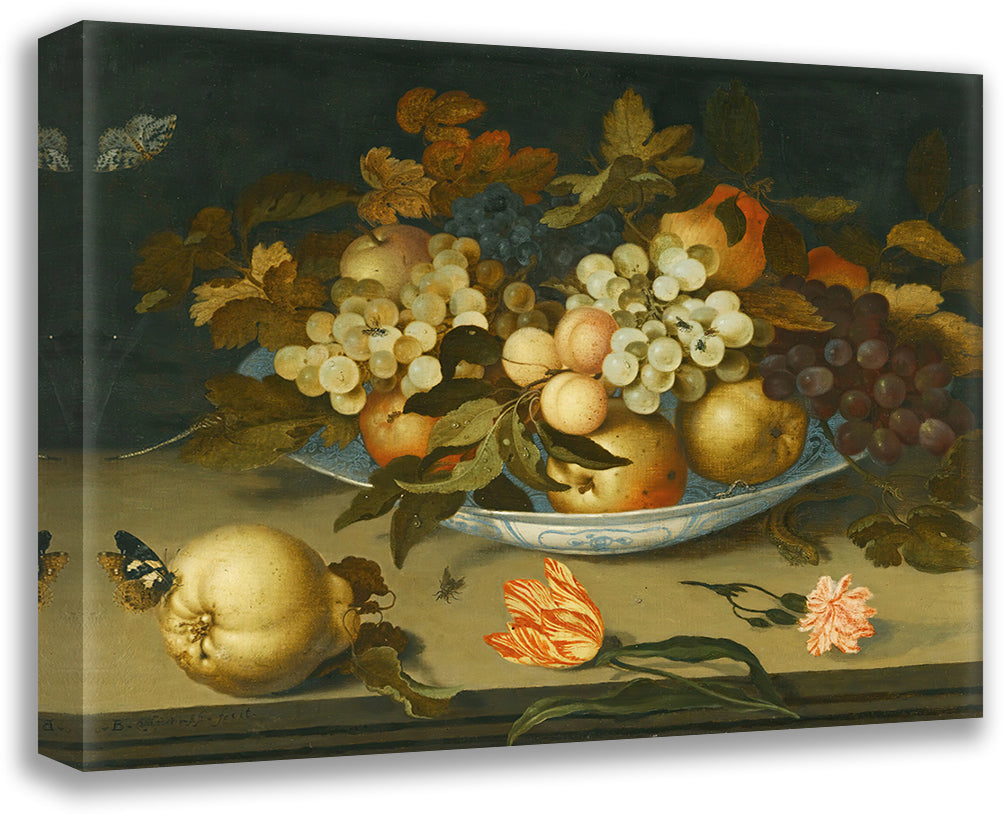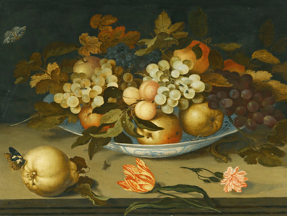 / A Still Life with a Delft Bowl Containing Fruit, on a Ledge with Flowers, Insects and a Lizard