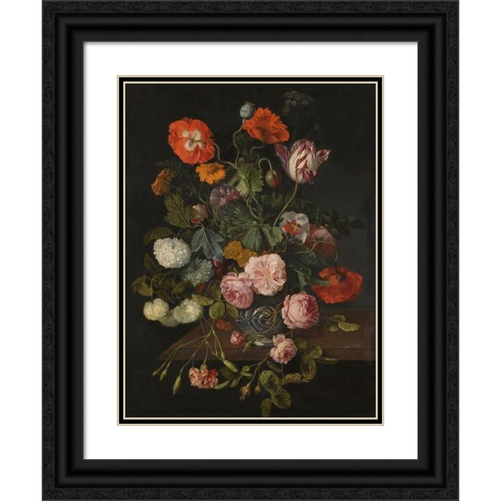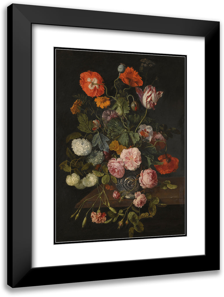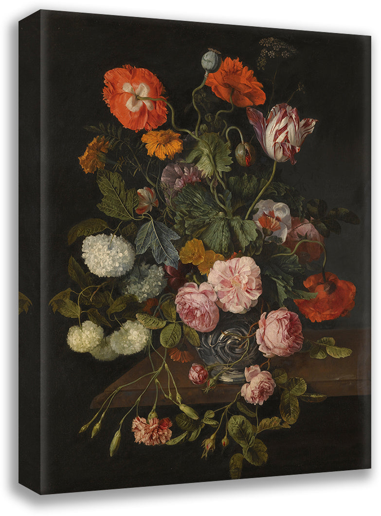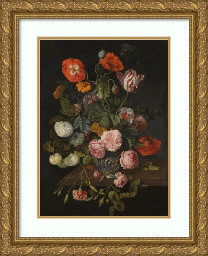 / A Still Life with Parrot Tulips, Poppies, Roses, Snow Balls, and Other Flowers in a Glass Vase Over A Stone Ledge