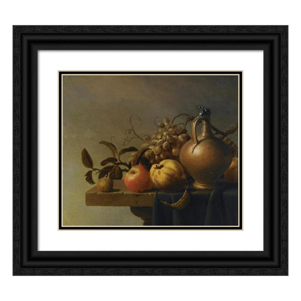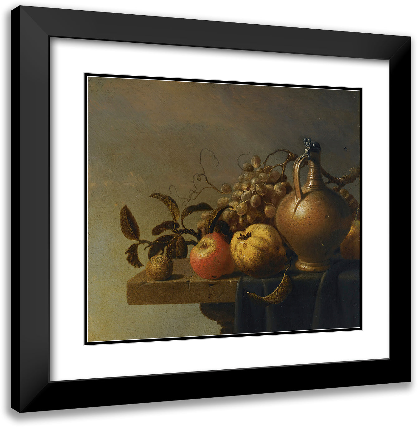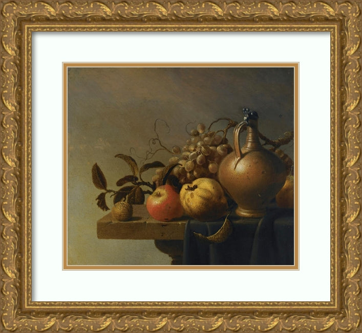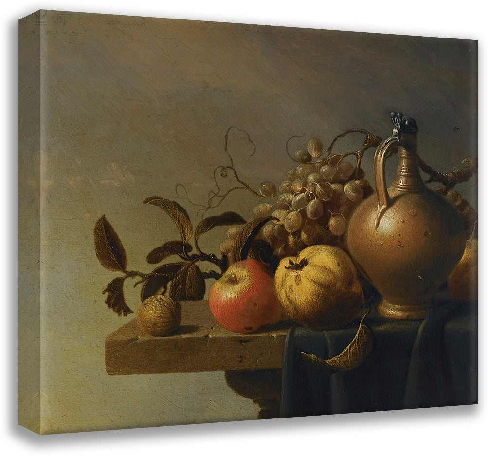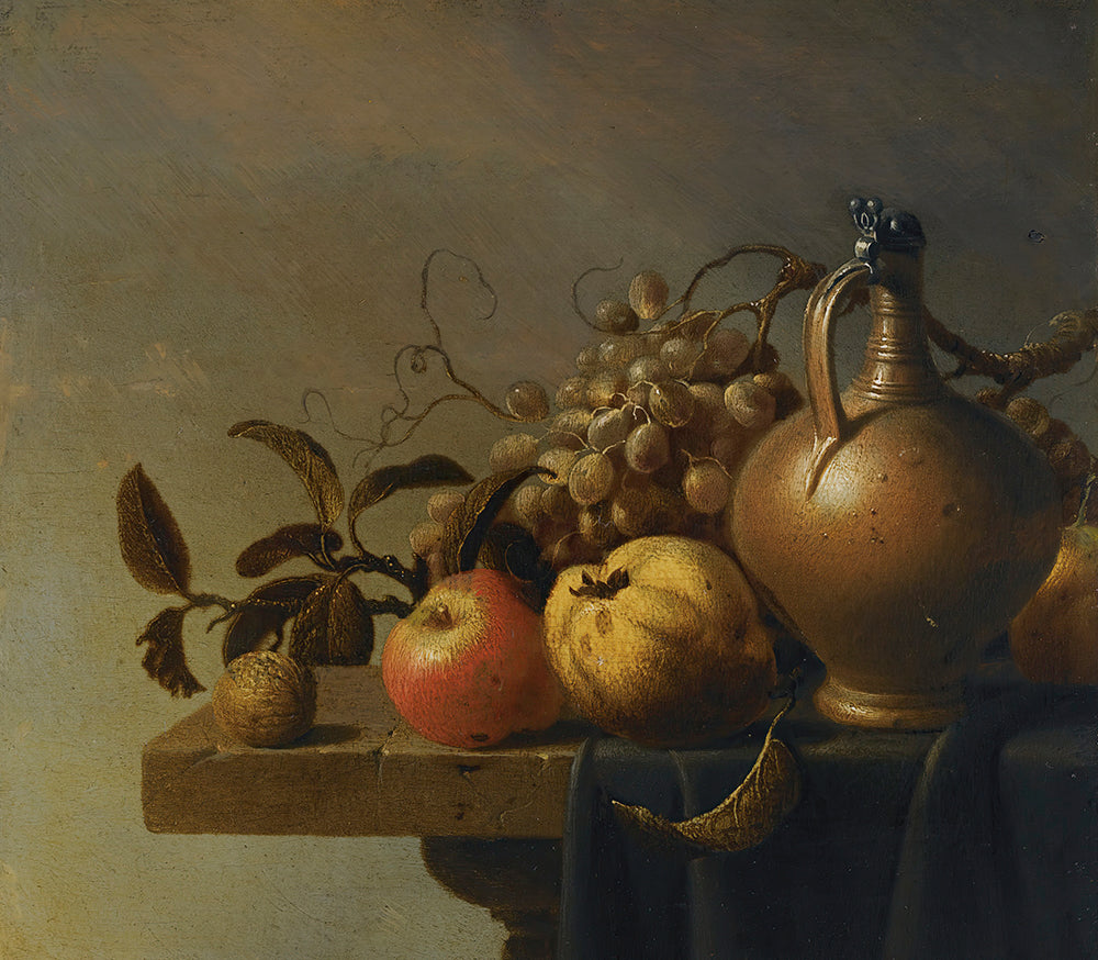 Still Life with a Ewer and Some Fruit on a Partly-Draped Stone Ledge