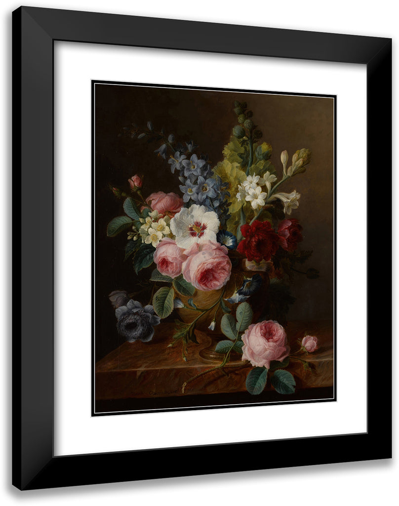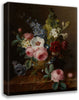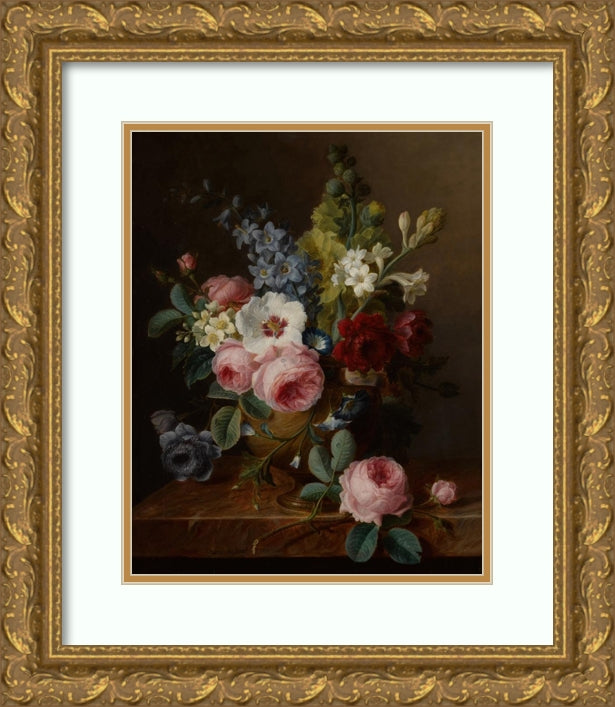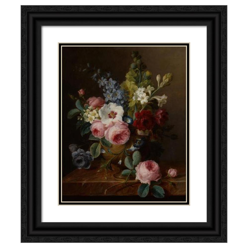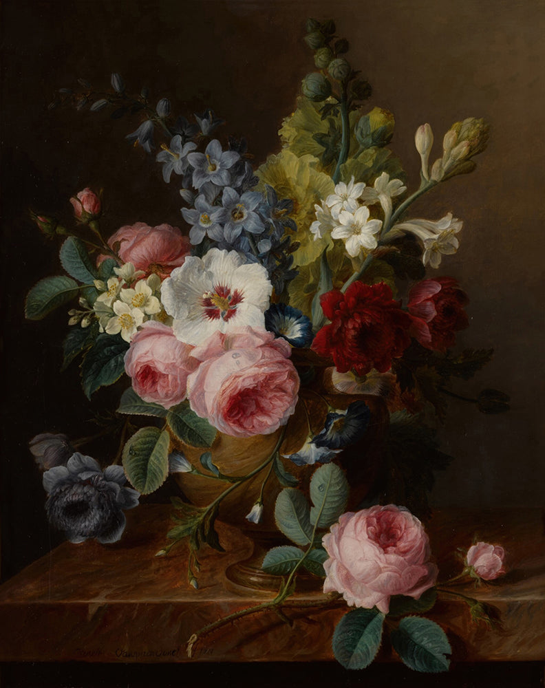 / Still Life of Flowers in a Vase on a Marble Ledge, Including Roses, Hibiscus, Bellflowers, Hollyhocks, and Anenomes
