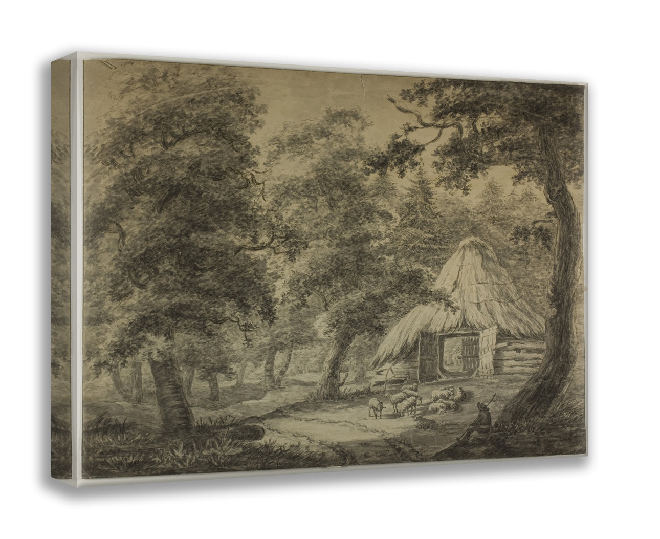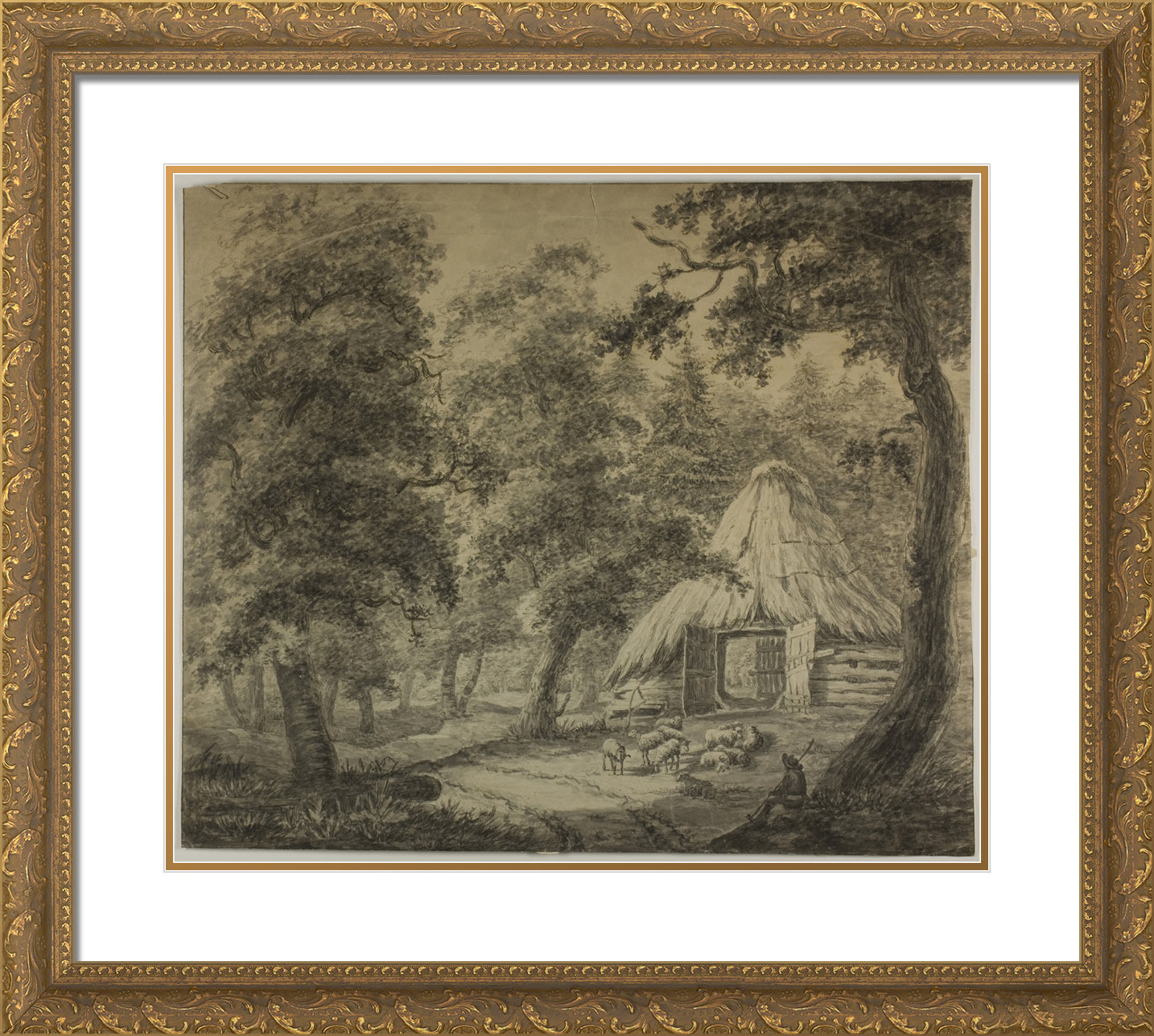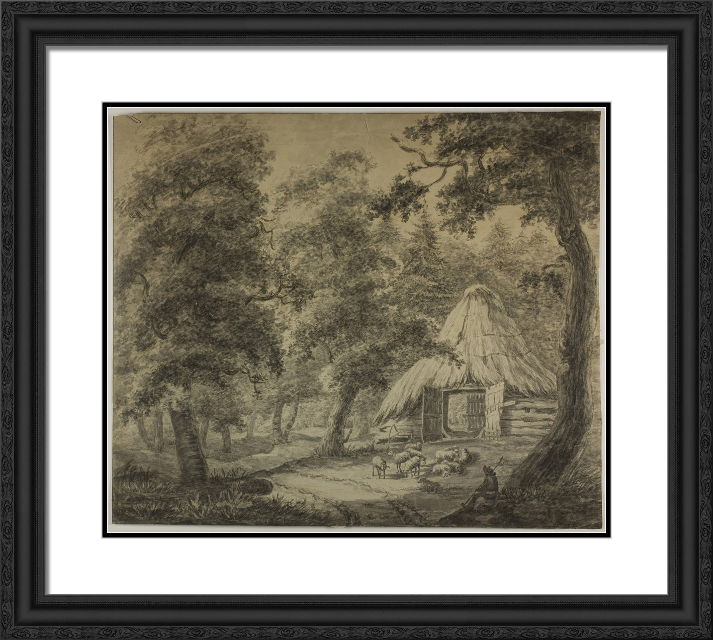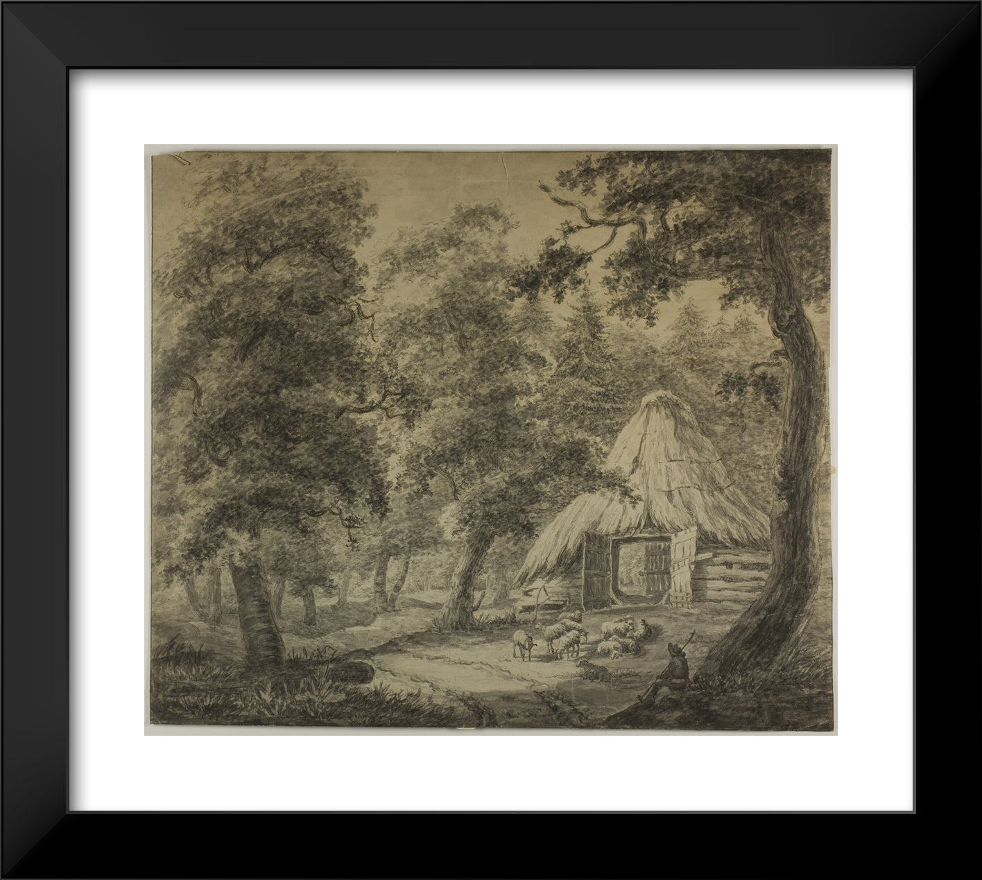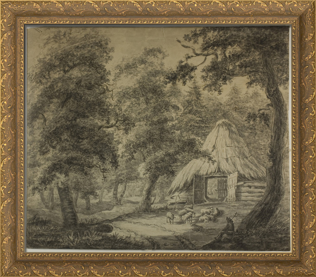 • Thatched Hut in Woods with Shepherd and Sheep by Anthonie Waterloo