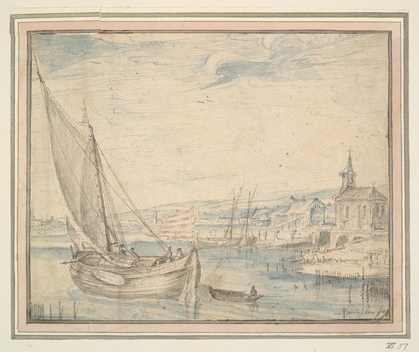 Jacob de Heusch A Harbour Scene with Fishermen Returning to Shore, Some Travellers Setting Up Camp and Two Riders on a Pass, Mountains Beyond from $9.99