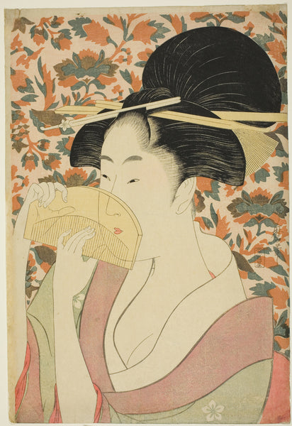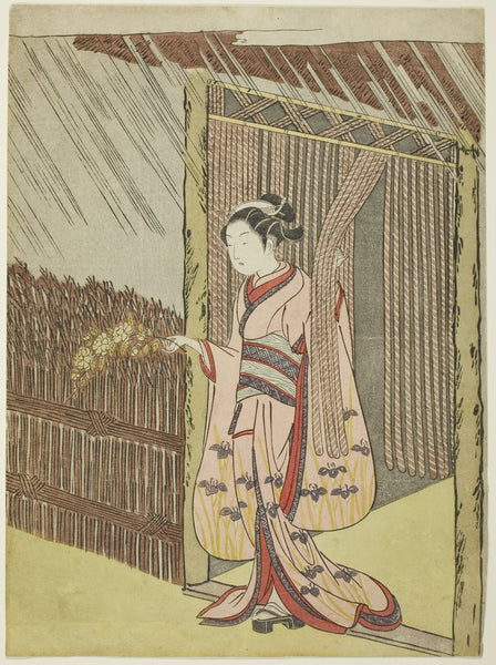 MuseumPrints Woman Holding a Branch of Kerria Flowers in the Rain (parody of Ota Dokan) by Suzuki Harunobu from $49.99 $64.99