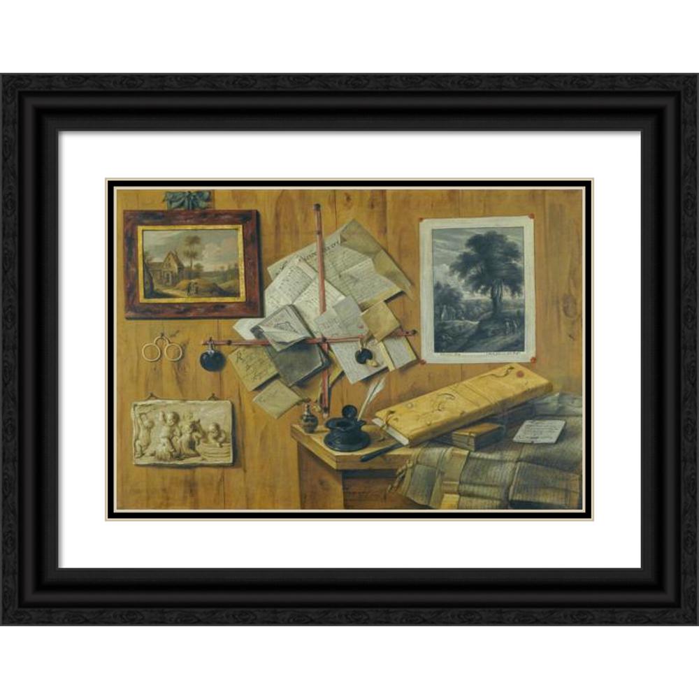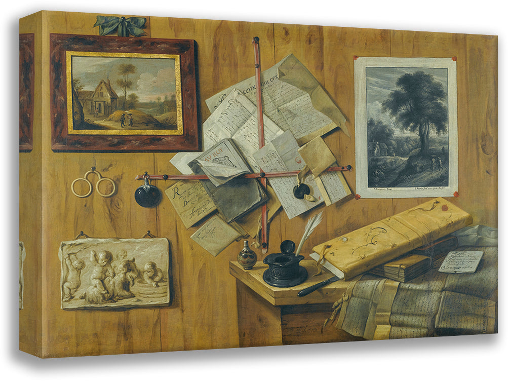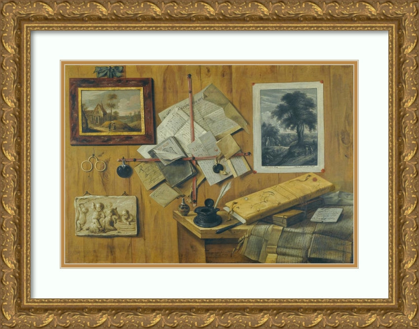 / A Trompe L’Oeil Still Life, with a Painted Landscape, a Relief and a Mezzotint of Peasants by a Cottage