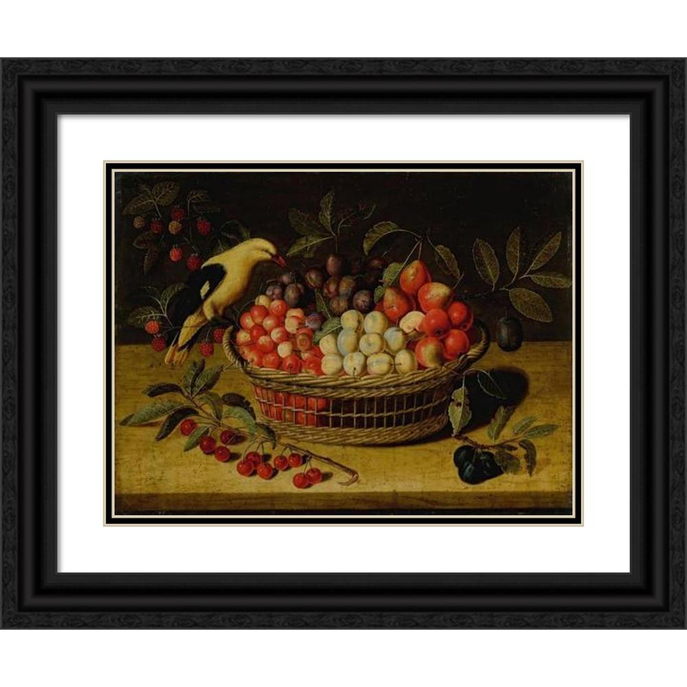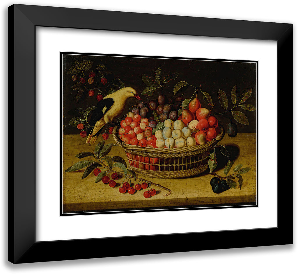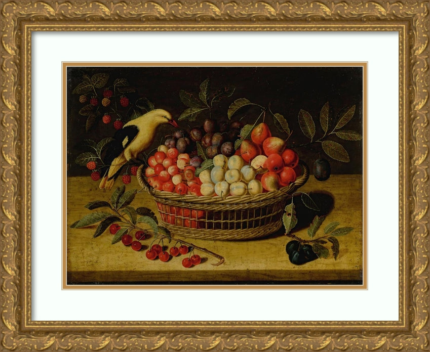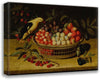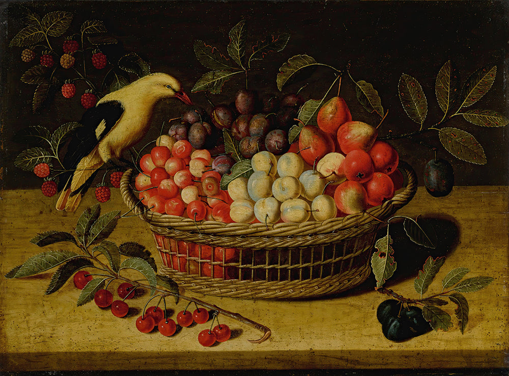 / Still Life with Cherries, Plums, Raspberries and Other Fruits in a Basket, with a Yellow Bird
