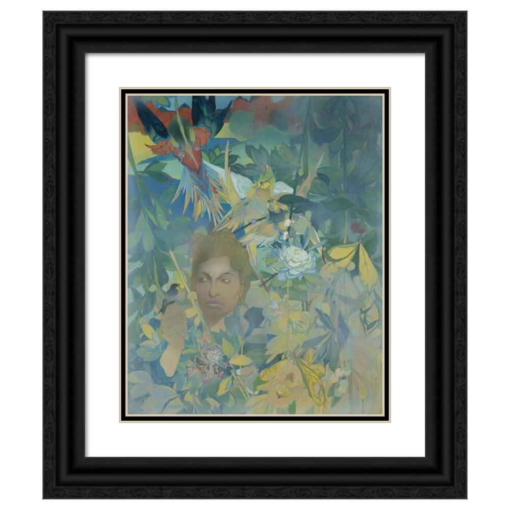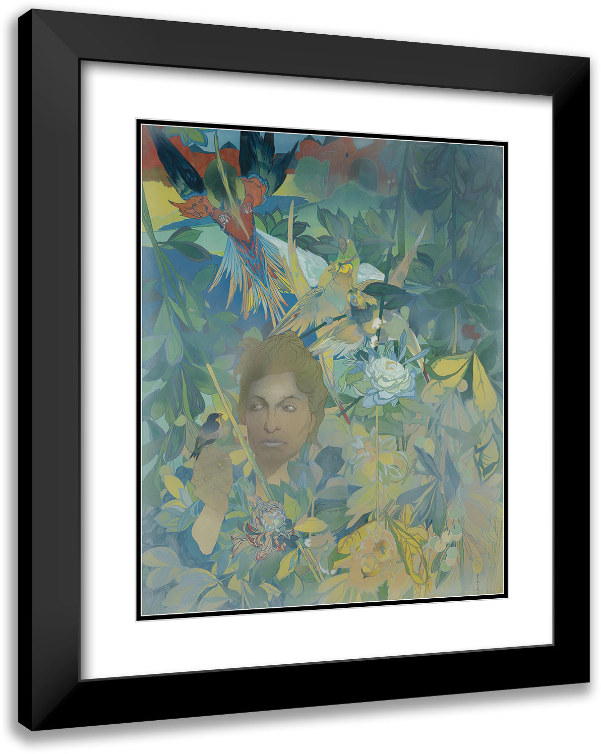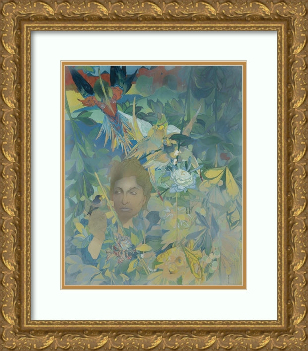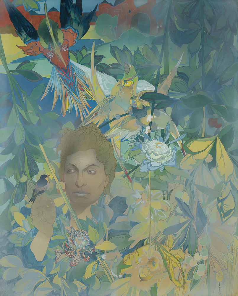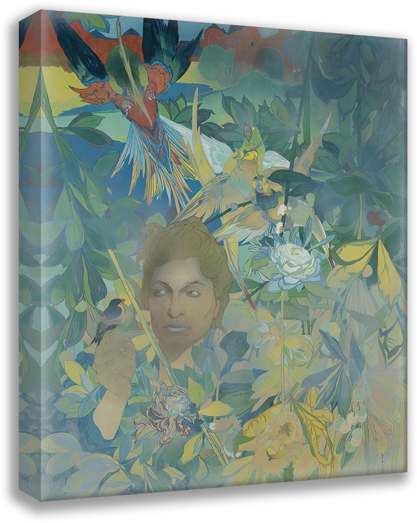 Face of a Woman on the Background of Lush Vegetation and Fantastic Birds