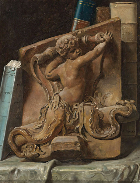 Jean François de La Motte A Trompe L’Oeil Still Life, with a Painted Landscape, a Relief and a Mezzotint of Peasants by a Cottage from $9.99