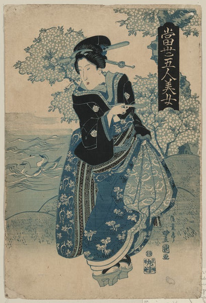 Toyokuni Utagawa Woman Holding Bowl and Tray Before Window (Cherry Trees Blooming Outside) (Late 18th Century - Early 19th Century) from $9.99