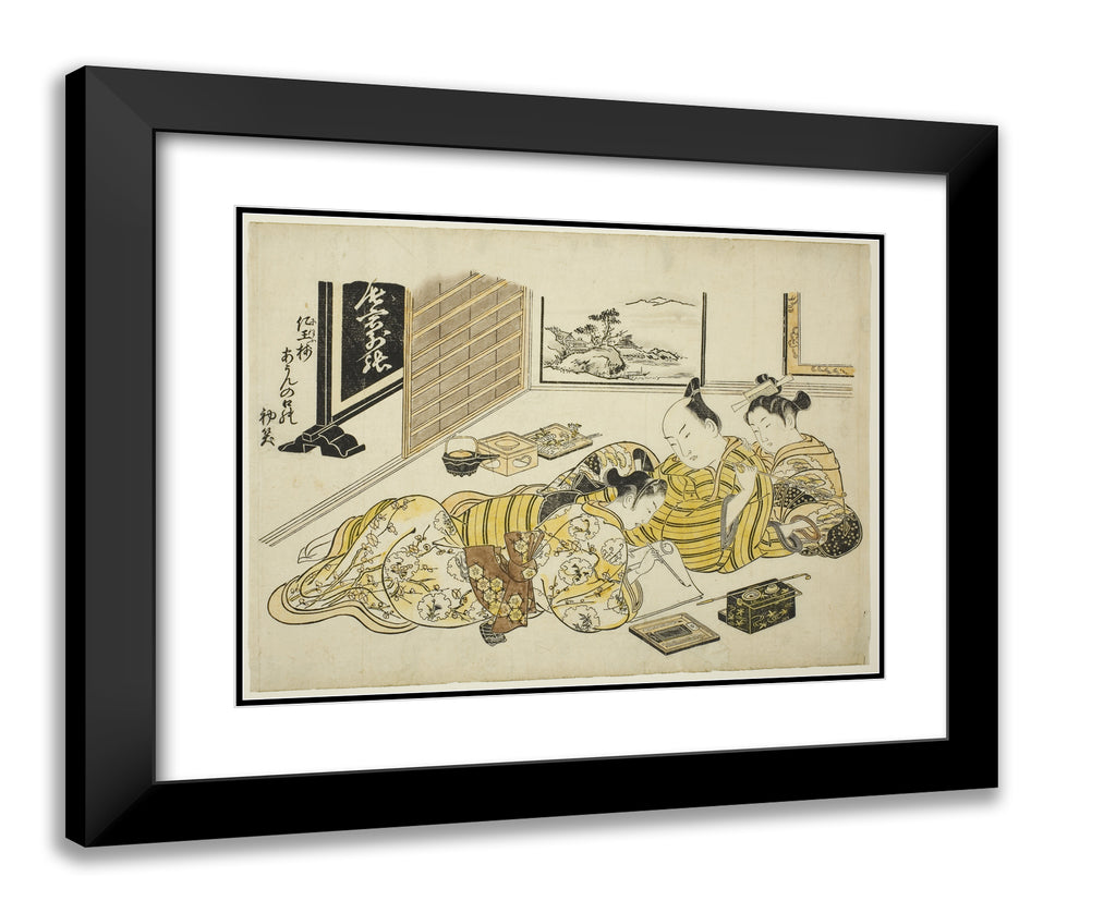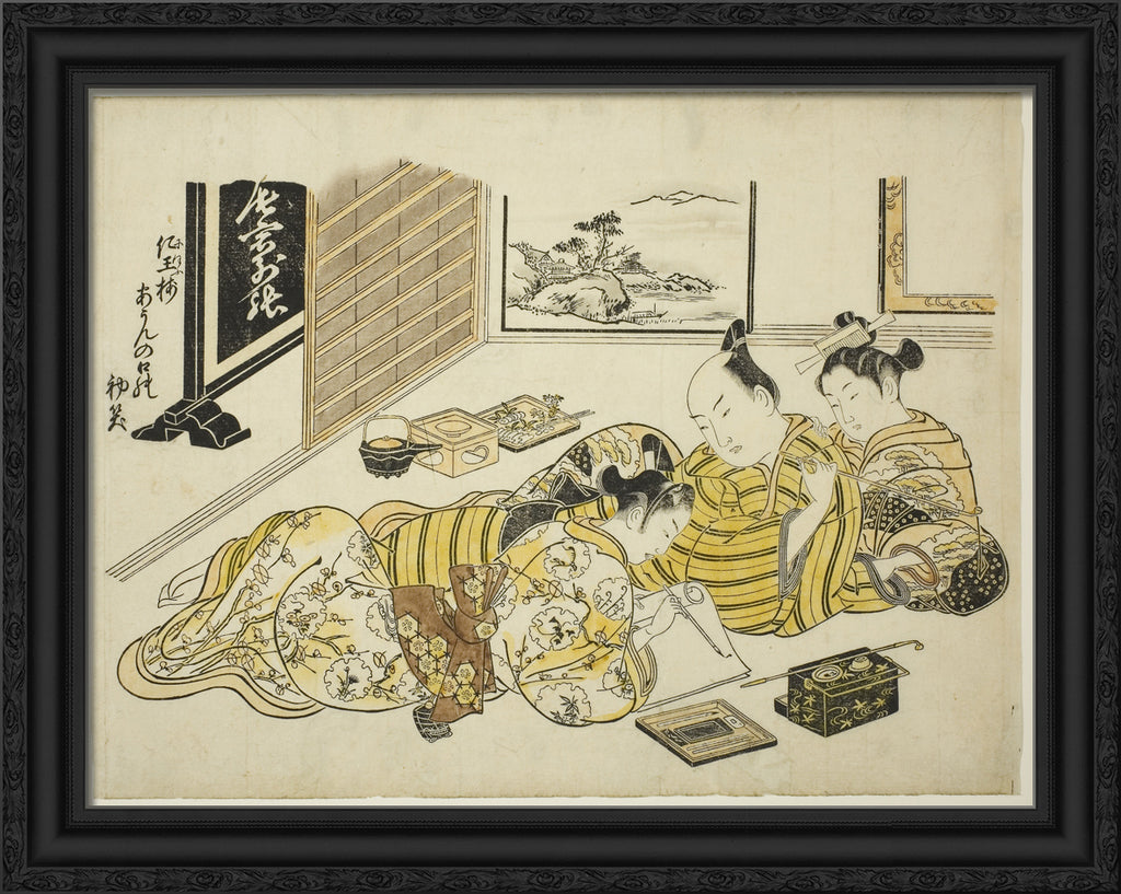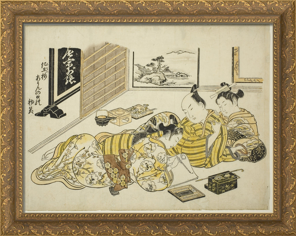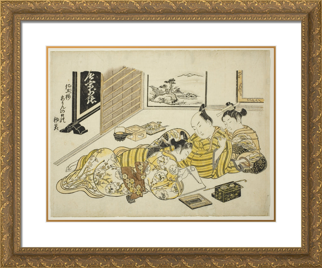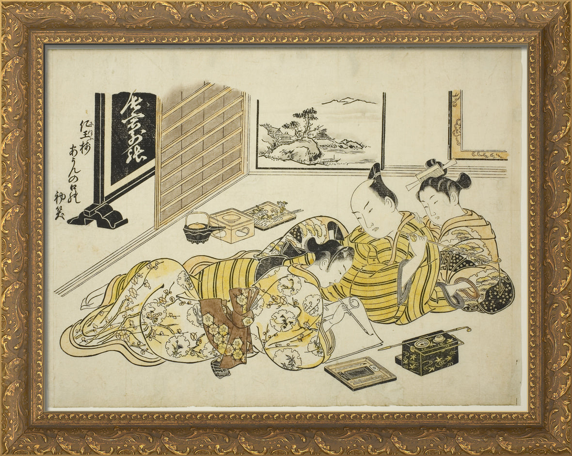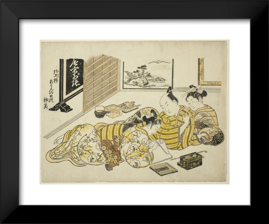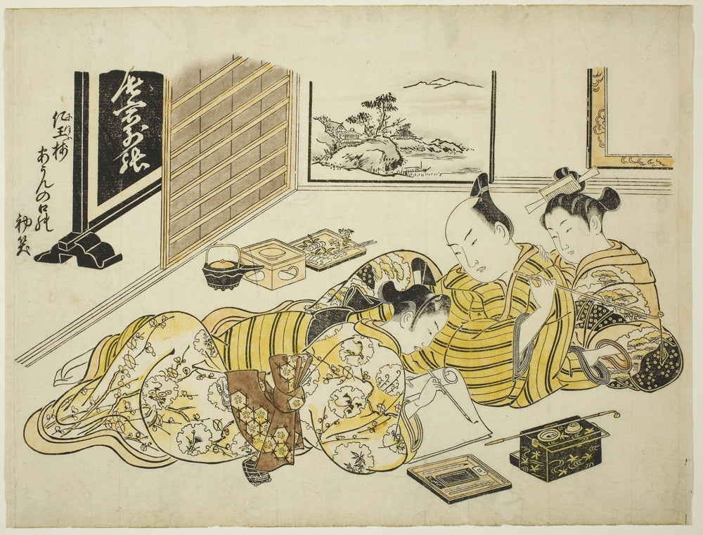 / A Man and a Courtesan Watching a Young Man Writing, first sheet of the album "Mountain of Dyed Color, Specimens of Bedrooms (Someiro no yama neya no hinagata)" by Okumura Masanobu