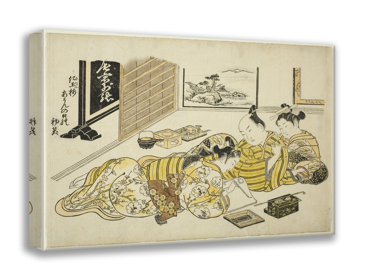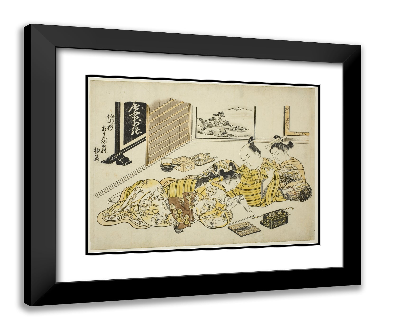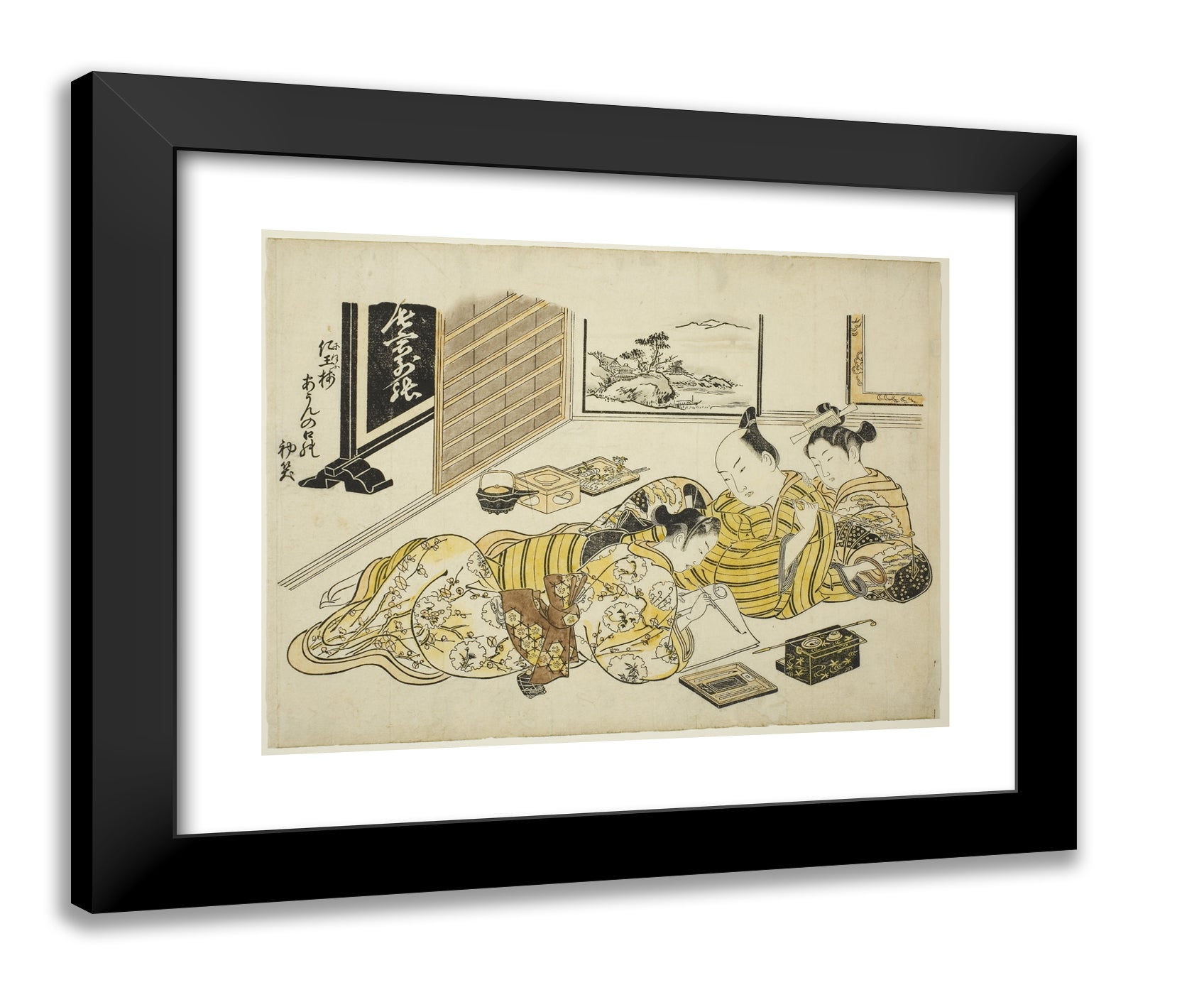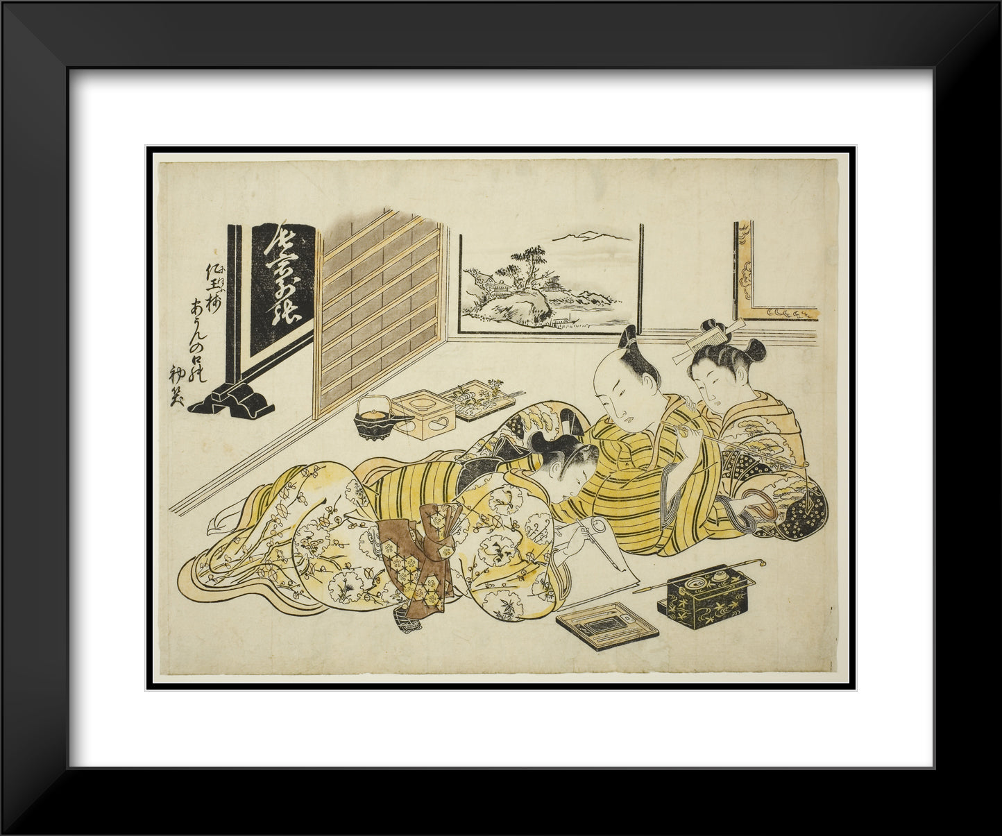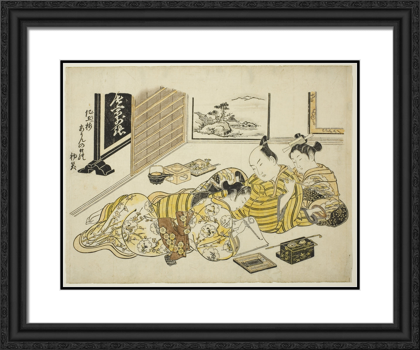 / A Man and a Courtesan Watching a Young Man Writing, first sheet of the album "Mountain of Dyed Color, Specimens of Bedrooms (Someiro no yama neya no hinagata)" by Okumura Masanobu