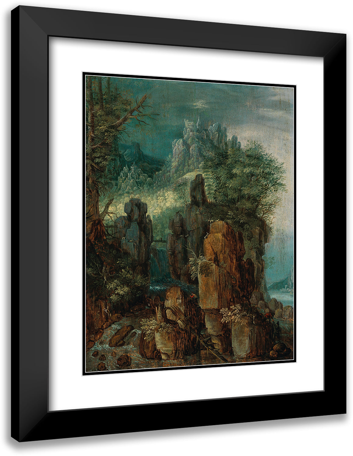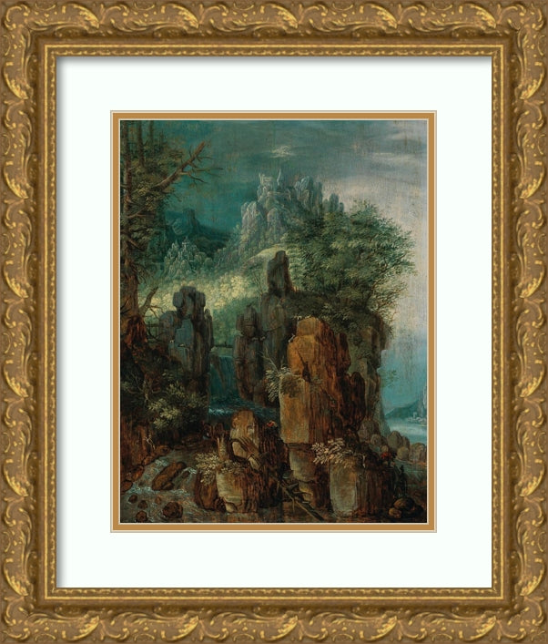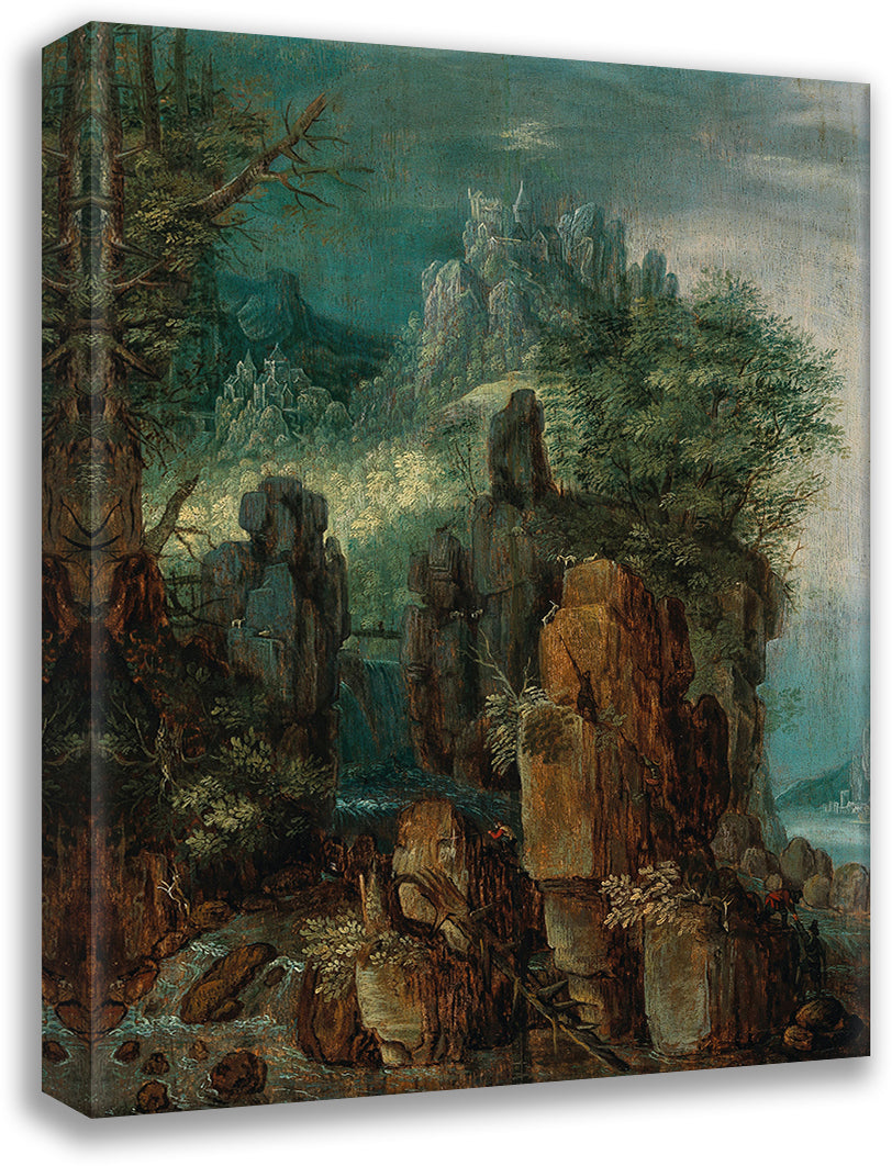 / A Mountainous River Landscape with Figures and Goats, a Village Beyond