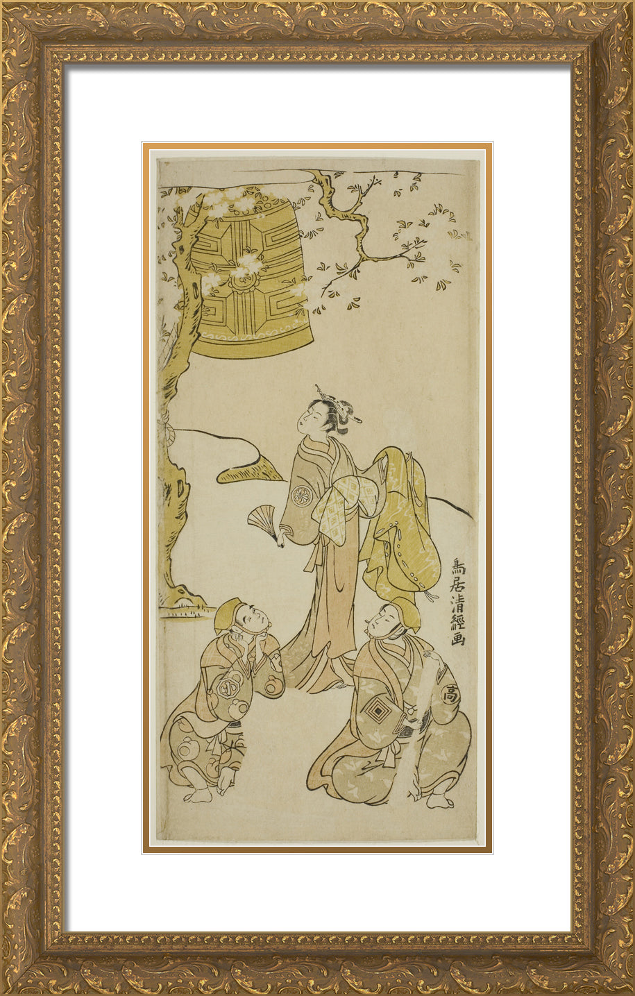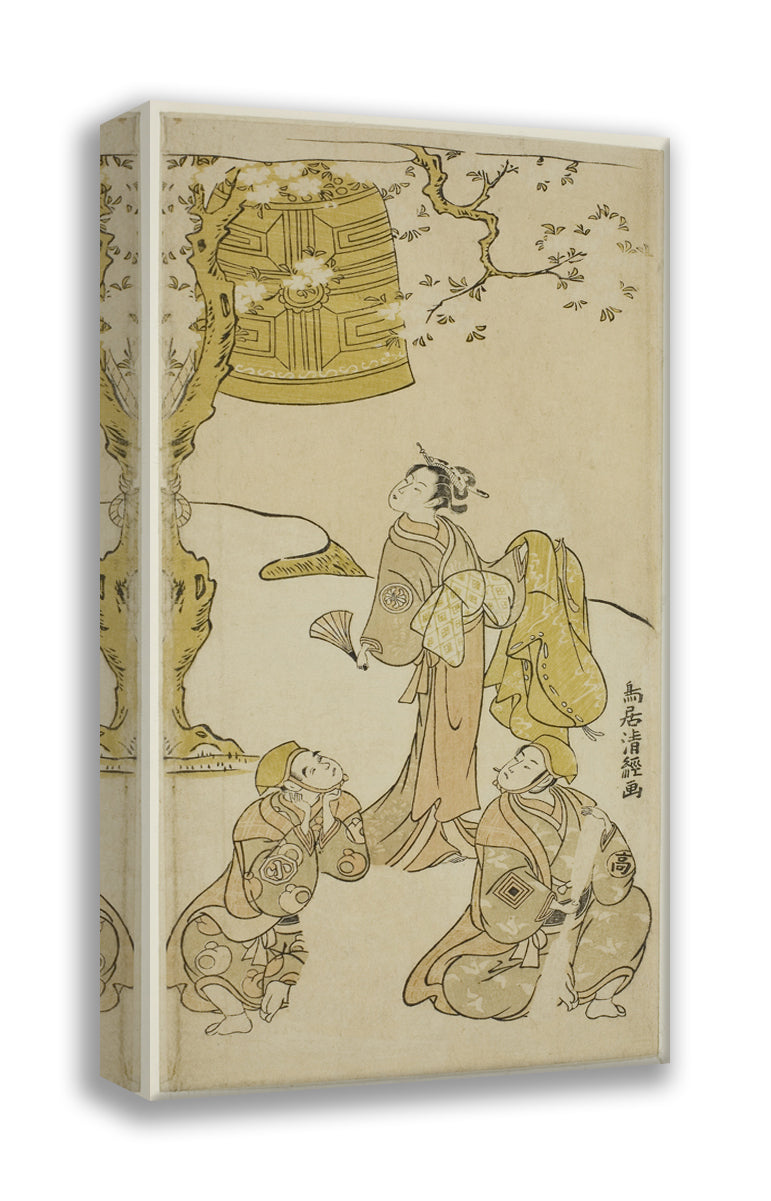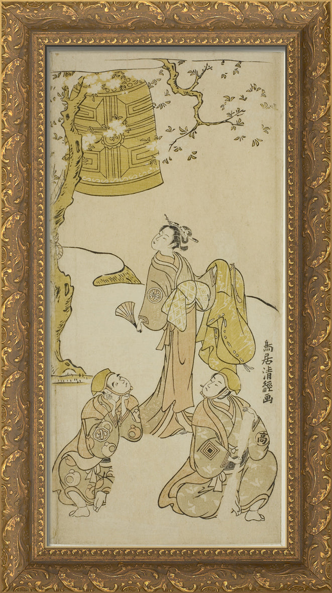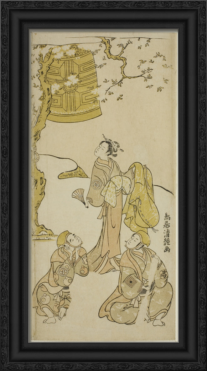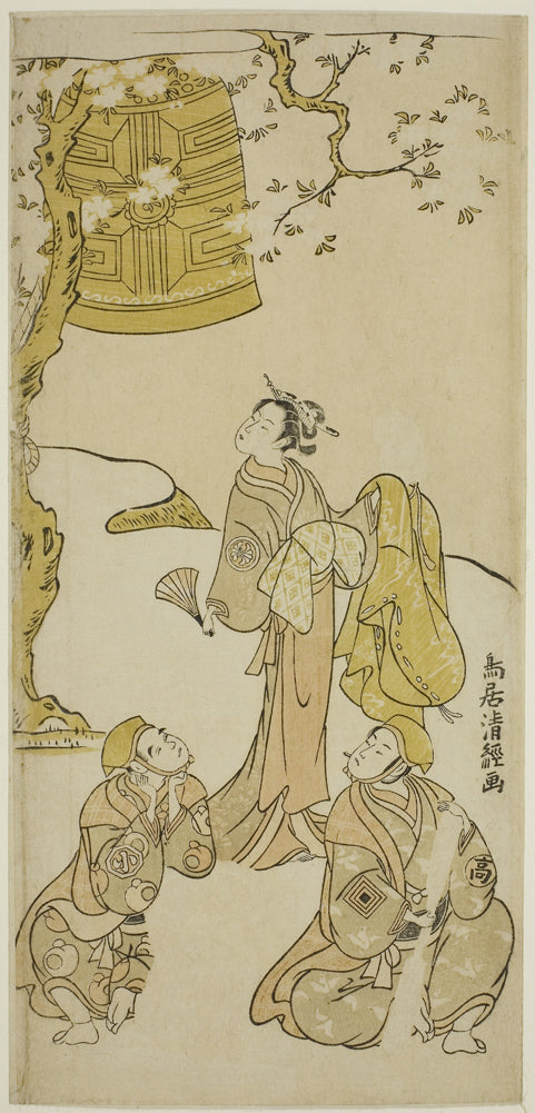 / The Actors Segawa Kikunojo II, Ichikawa Komazo II, and Arashi Otohachi I in the play "Fude Hajime Soga no Tamazusa," performed at the Nakamura Theater in the first month, 1768 by Torii Kiyotsune