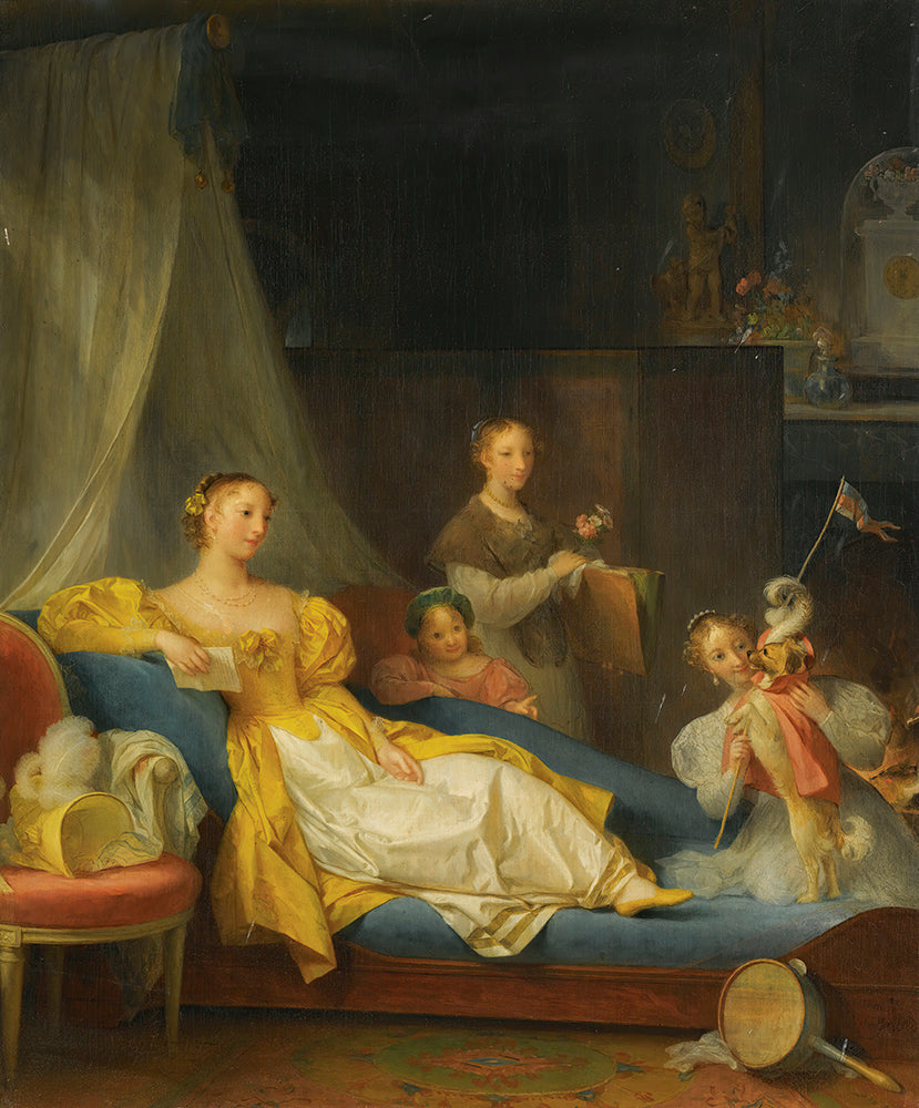 A Family in an Interior Playing with a Dog