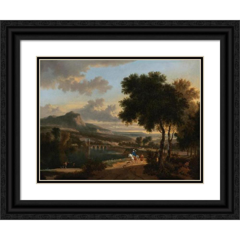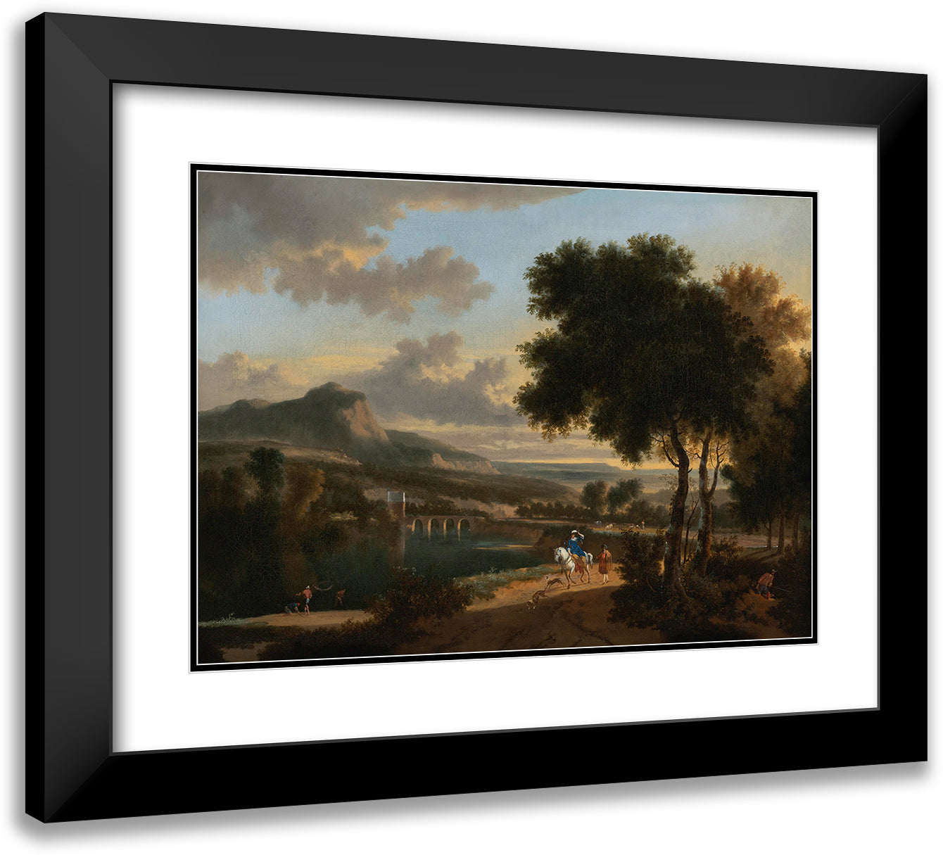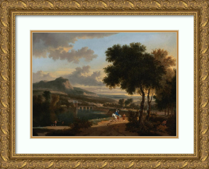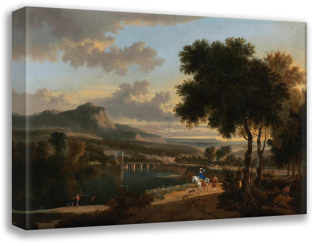 / An Extensive Landscape with Travellers, Fishermen and Cattle Drovers on a Path with a Roman Bridge Beyond