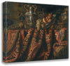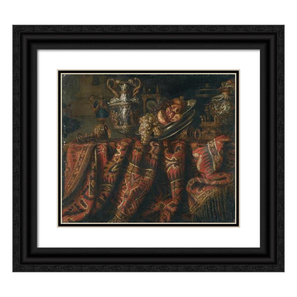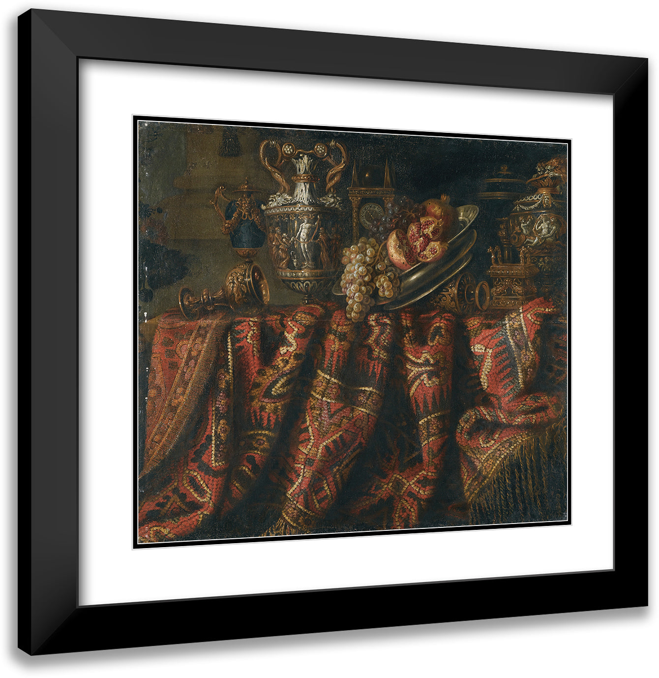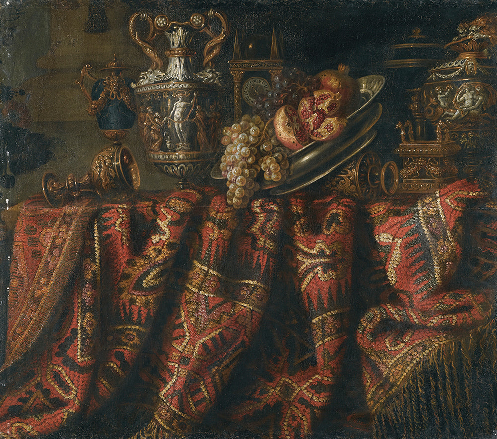 / A Still Life with Pomegranates, and Grapes on a Table Draped with an Ornate Turkish Carpet and Assorted Orfevrerie