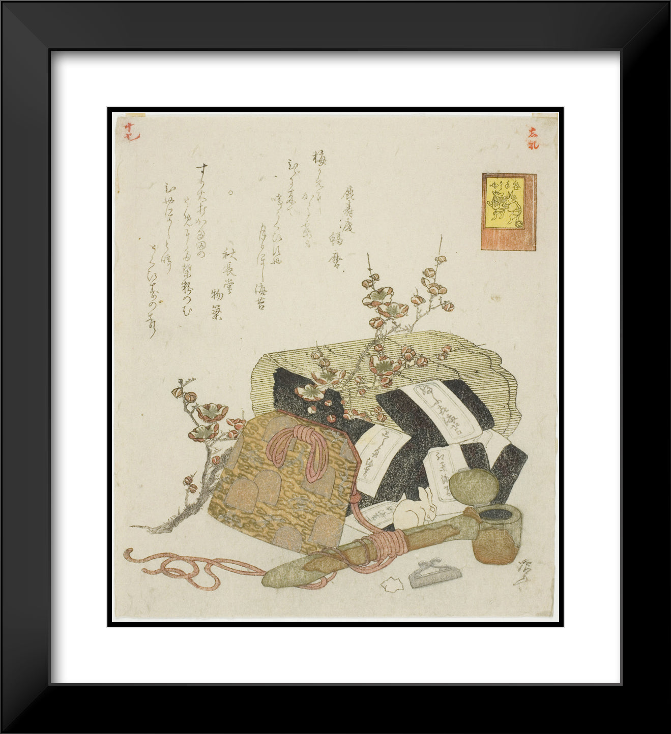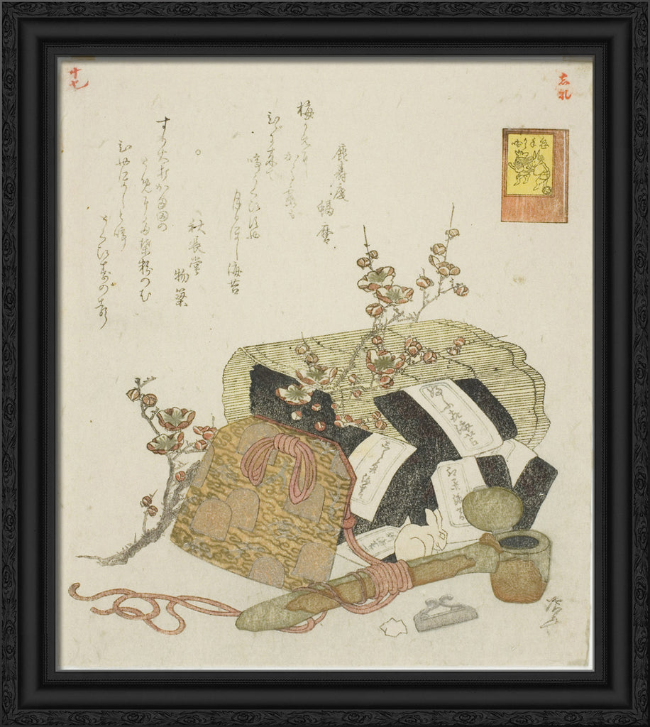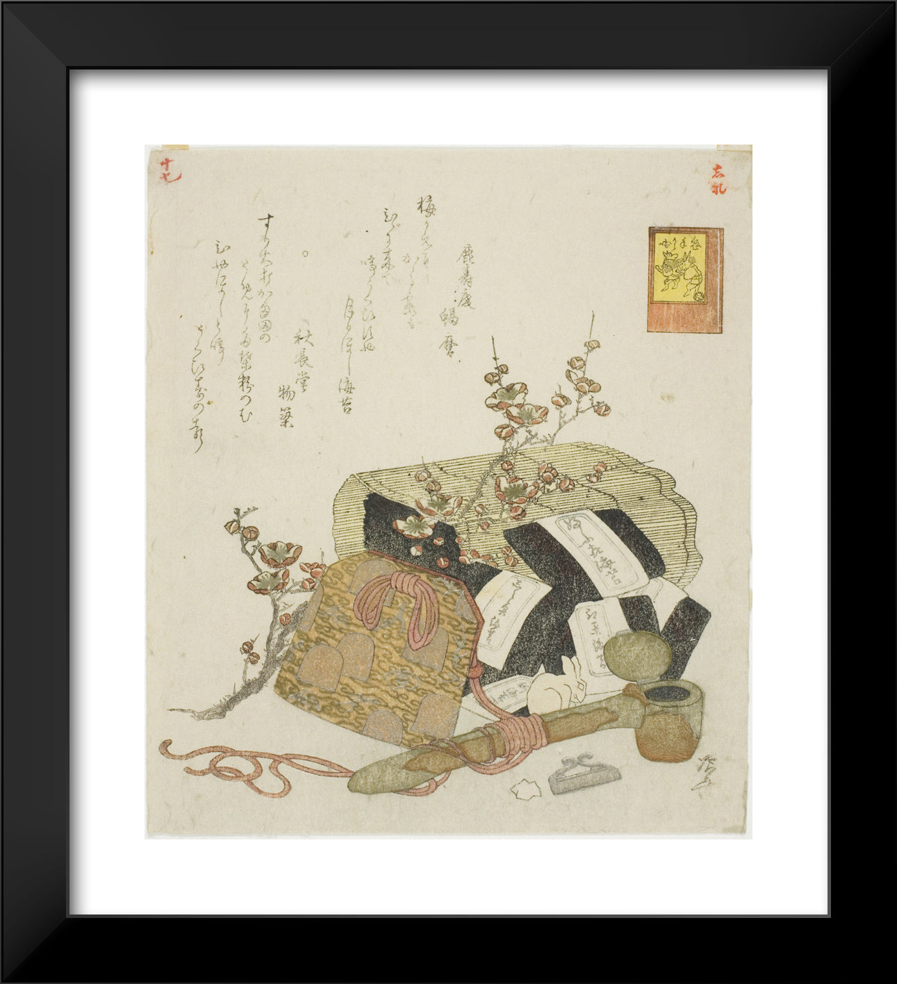/ Seaweed, portable writing case, and plum branch, no. 5 from the series "The Rabbit's Boastful Exploits (Usagi tegarabanashi)" by Ryuryukyo Shinsai