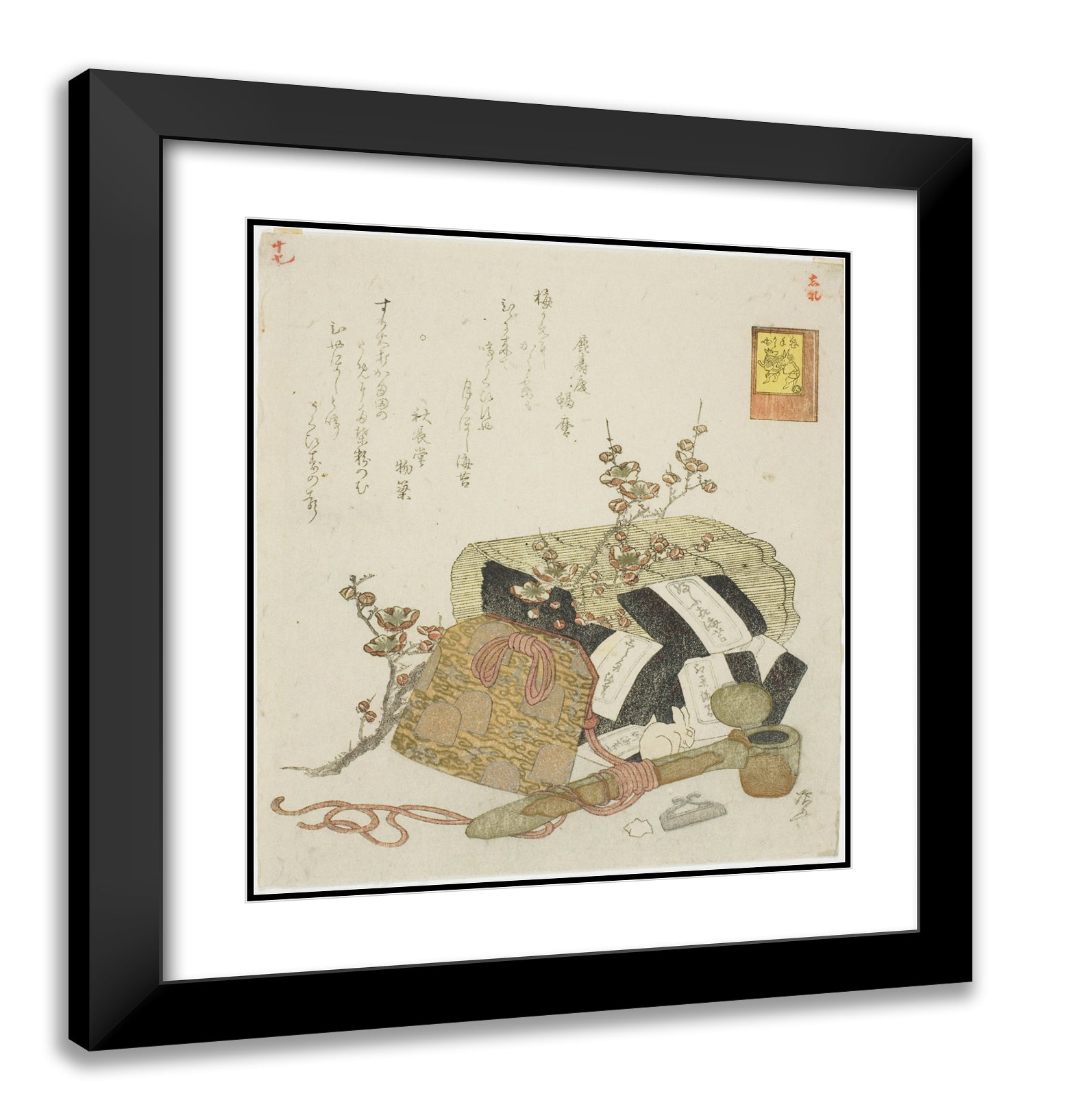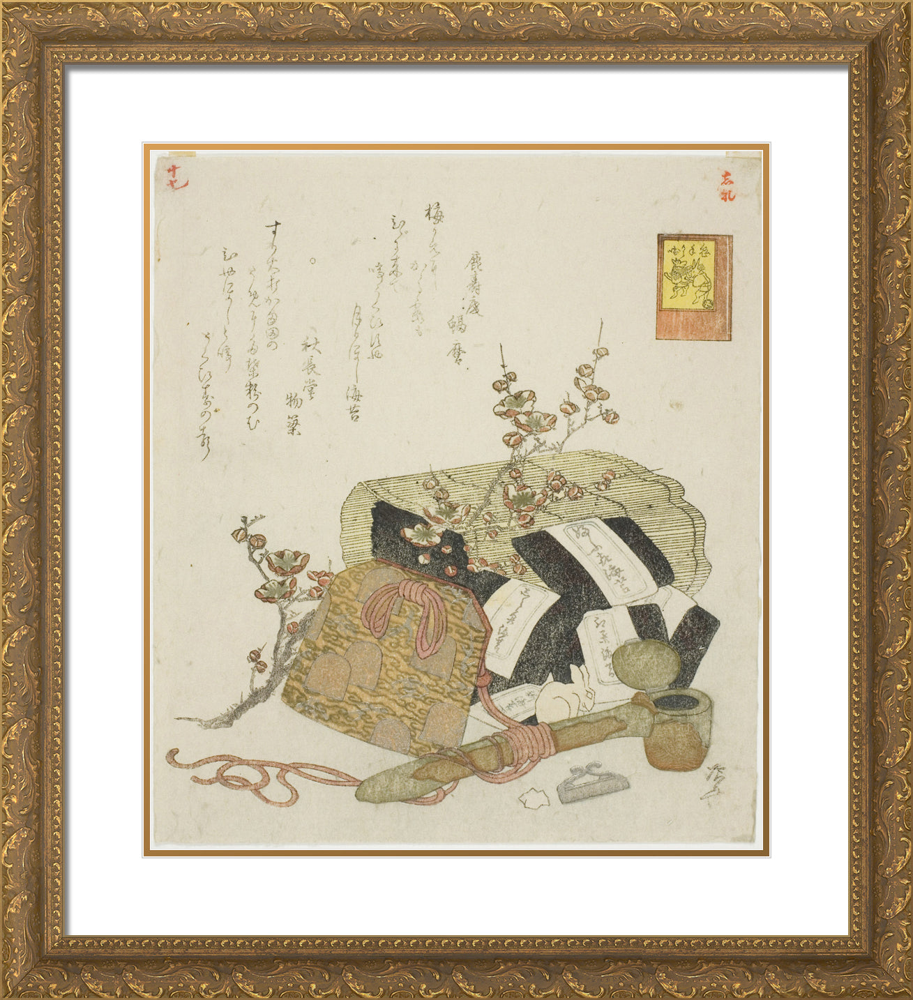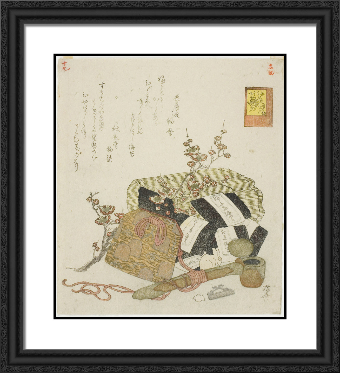 / Seaweed, portable writing case, and plum branch, no. 5 from the series "The Rabbit's Boastful Exploits (Usagi tegarabanashi)" by Ryuryukyo Shinsai