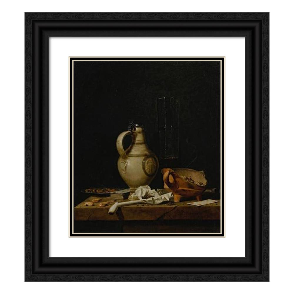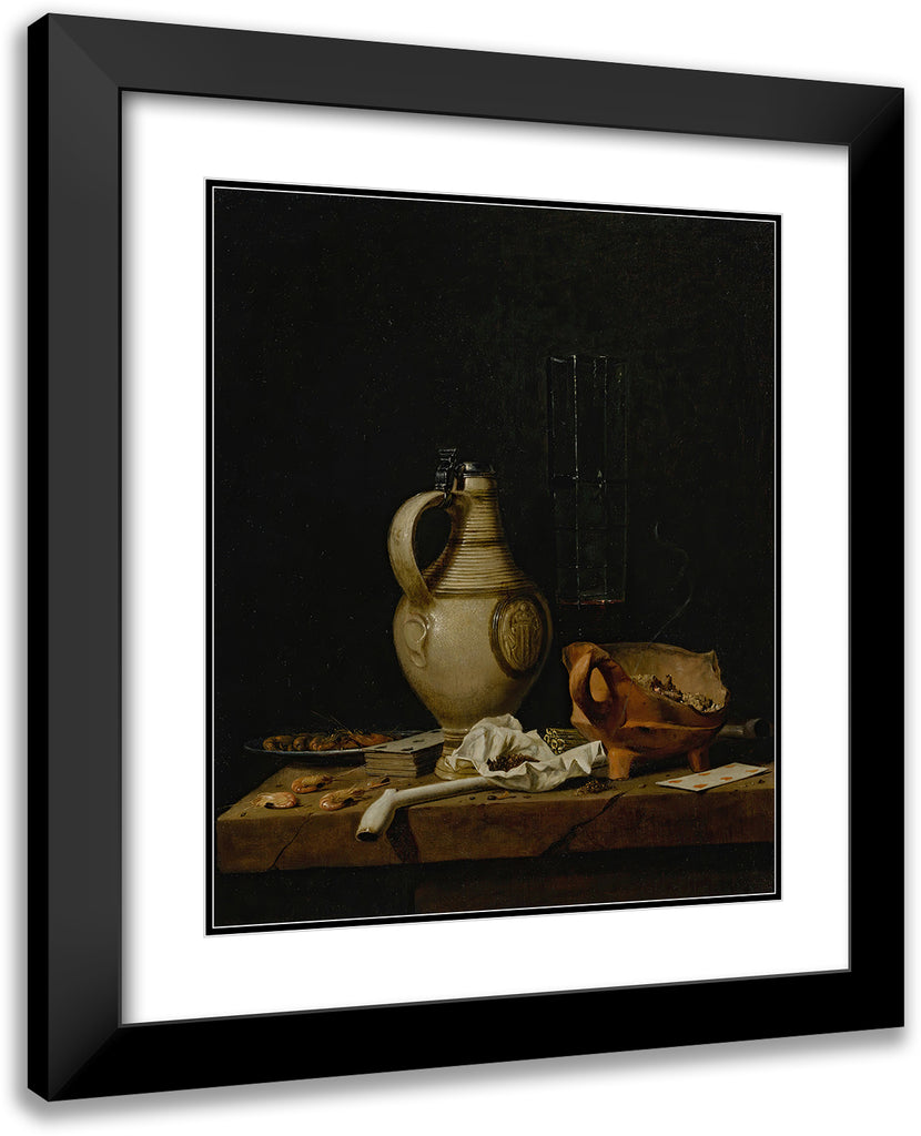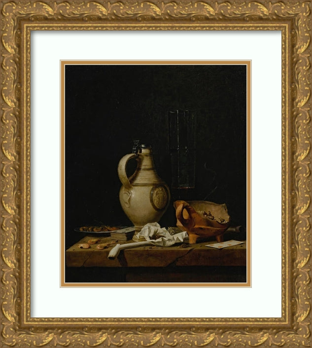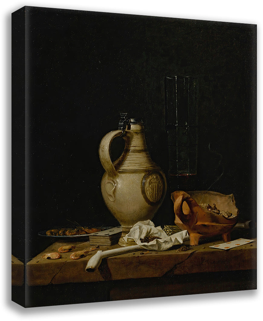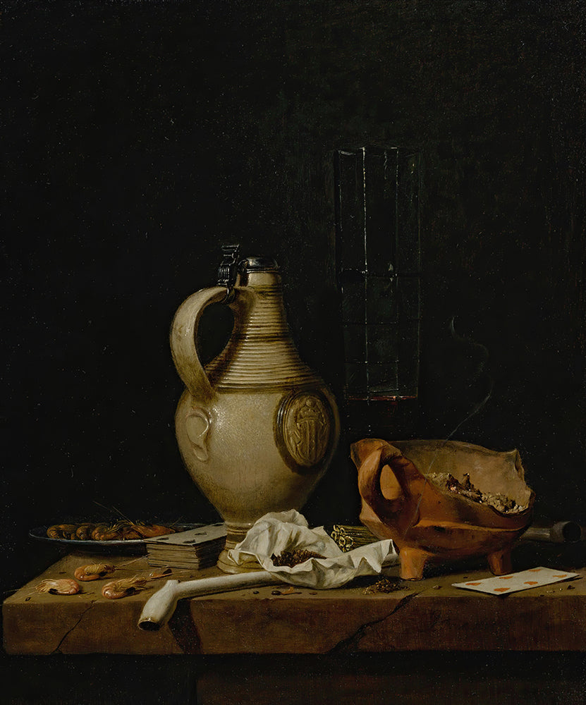 / A Still Life with a Stoneware Jug, a Glass of Beer, Playing Cards and Smokers’ Requisites (1665)