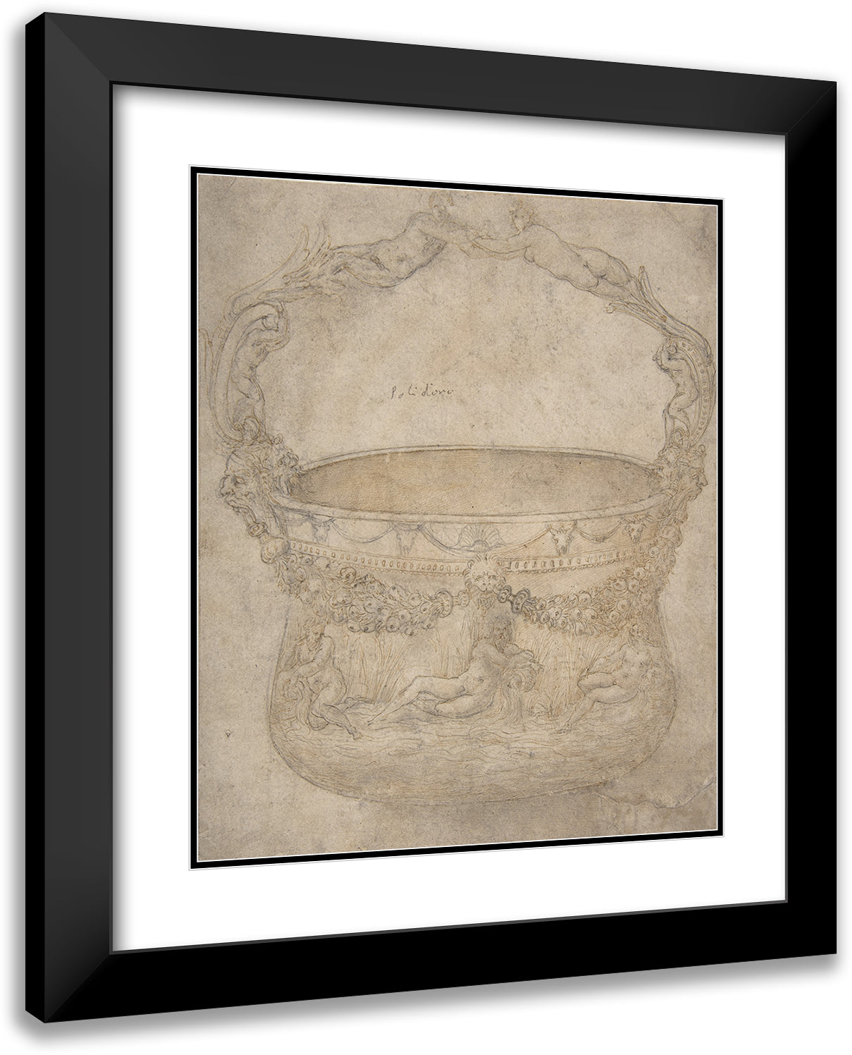 / Design for a Bucket-Like Vessel with a Handle of Interlaced Figures, on a Body Adorned with Bucrania, Garlands, and Three River Gods (1540-50)