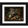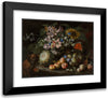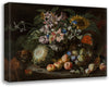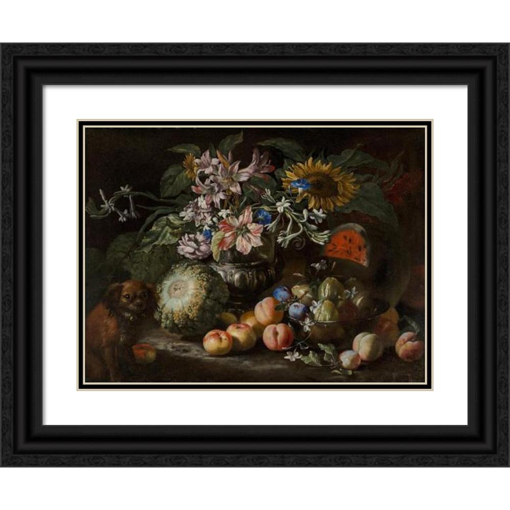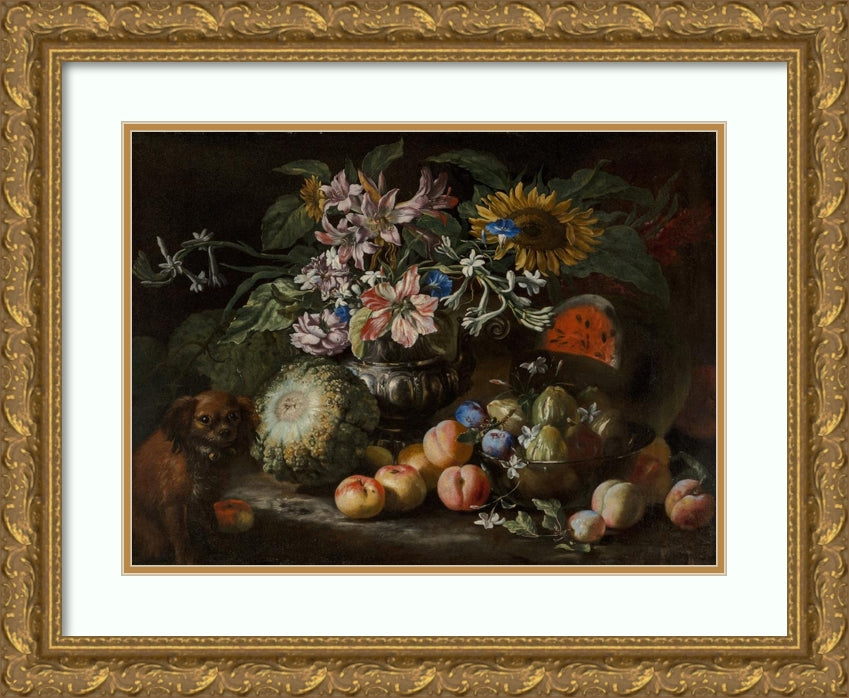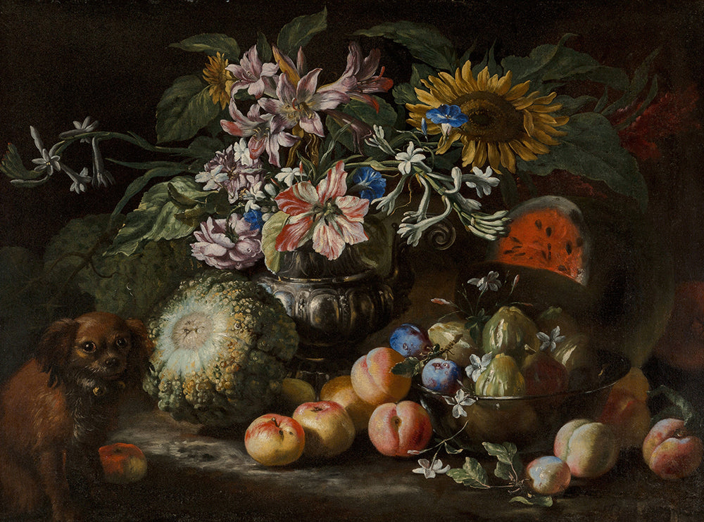 / A Still Life of Fruit and Flowers in a Footed Gadrooned Silver Vase with a Spaniel Looking on (1685)