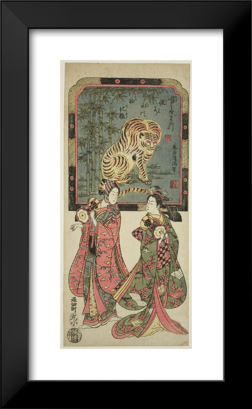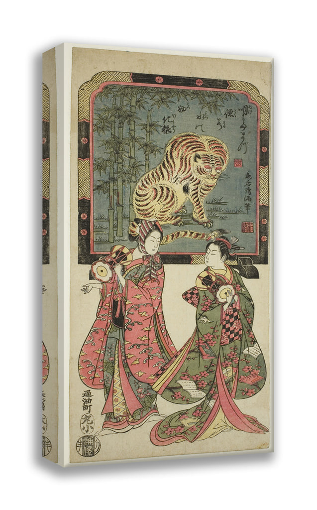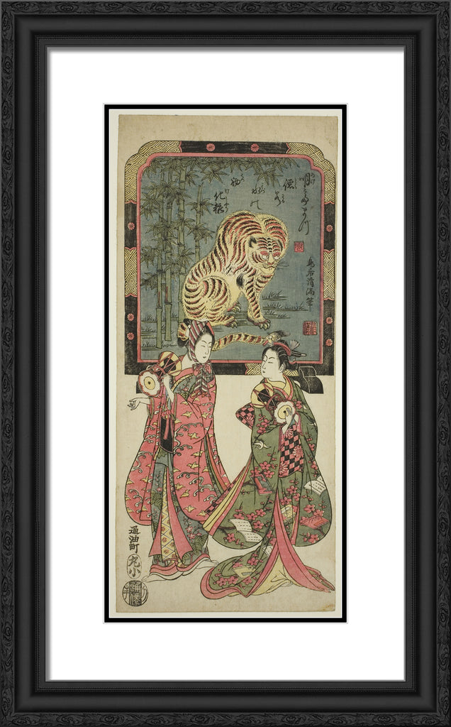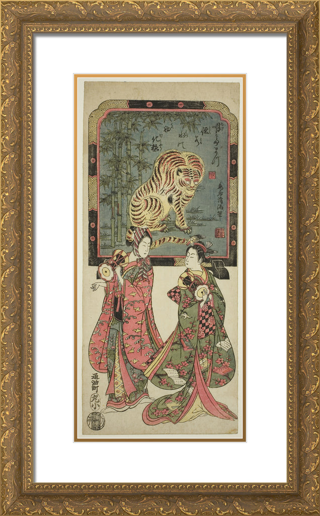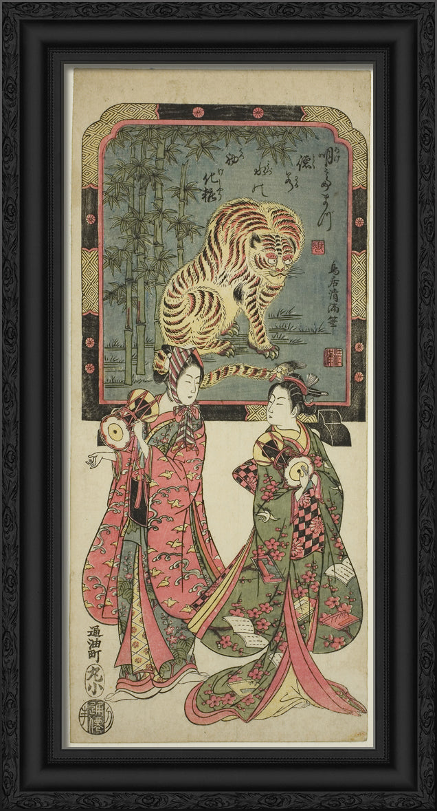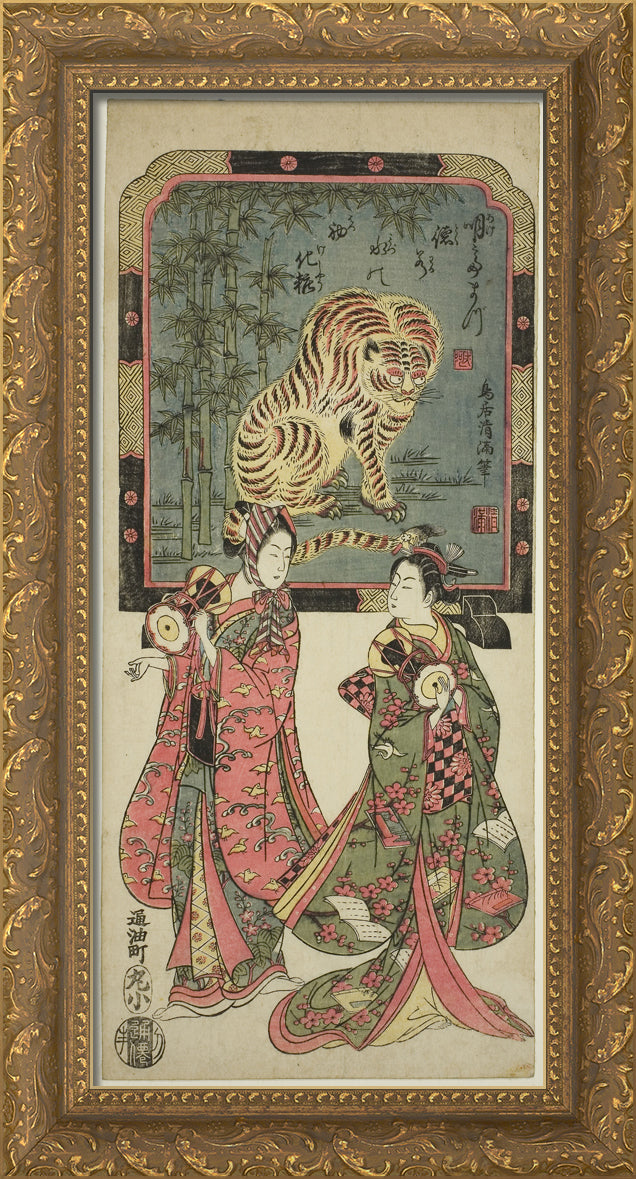 / New Year's entertainers before standing screen of tiger by Torii Kiyomasu I