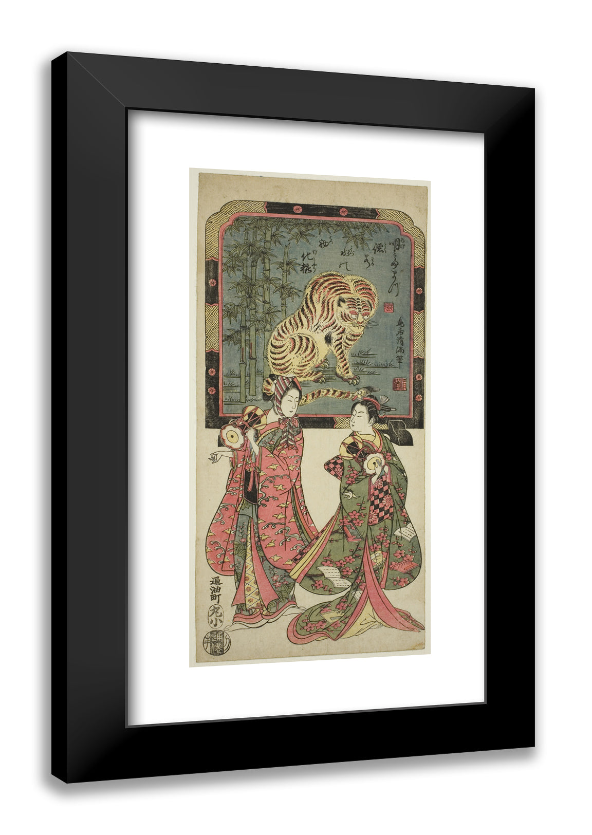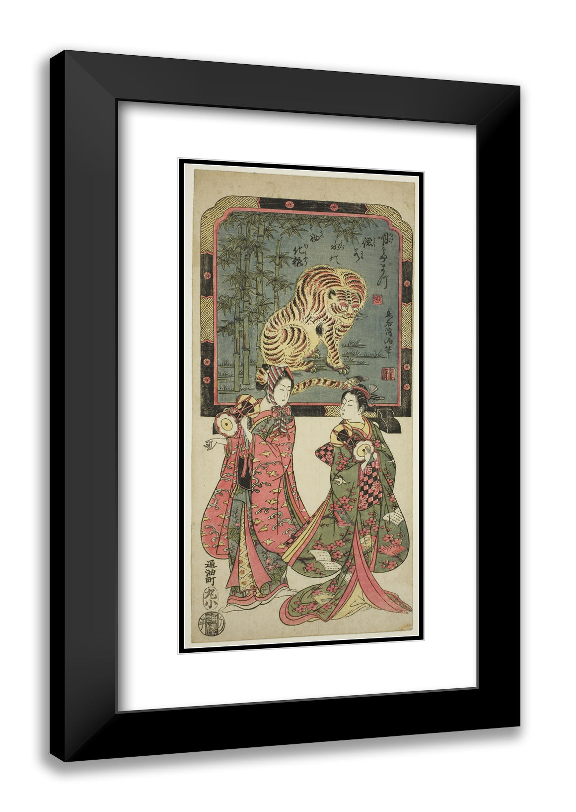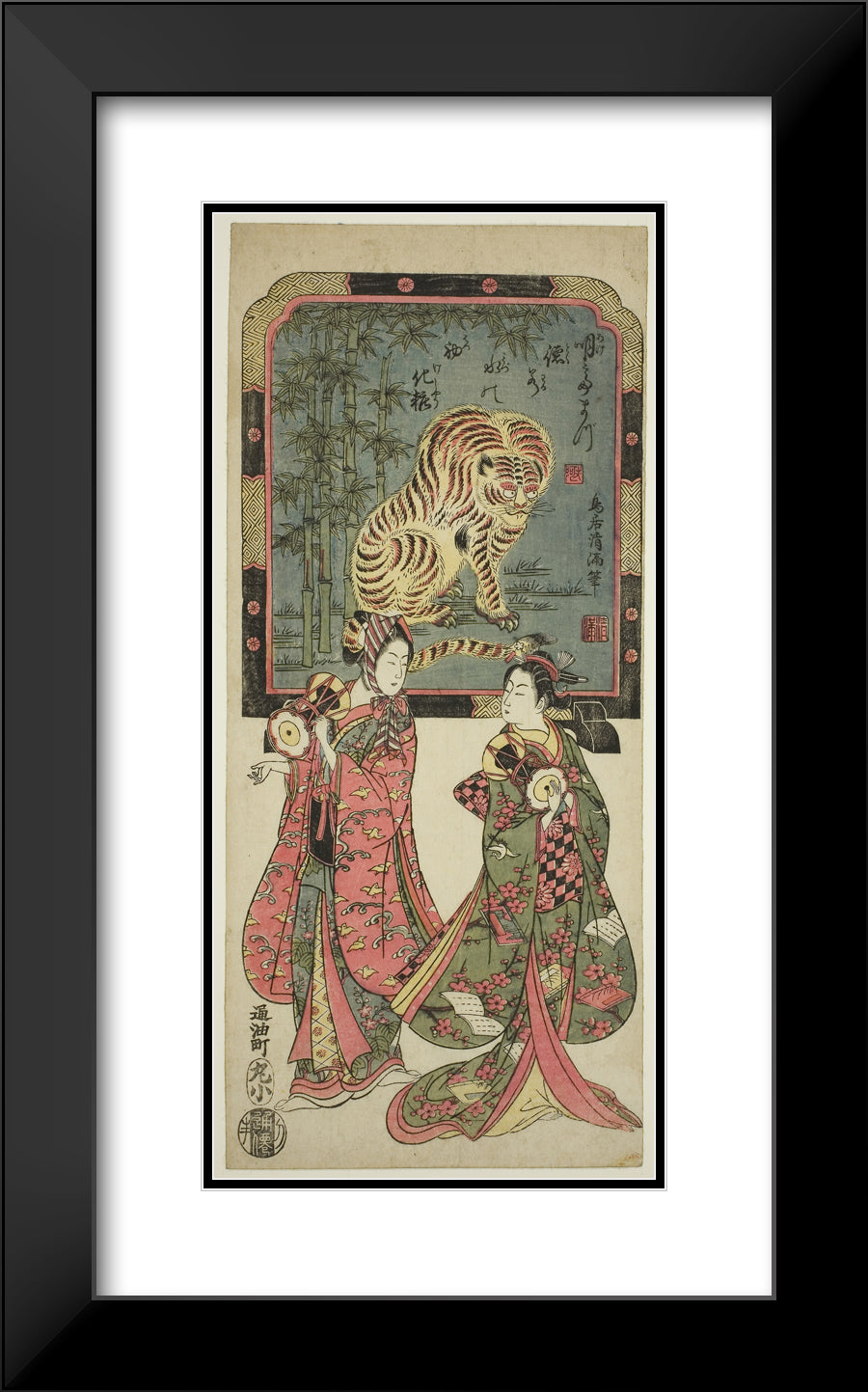 / New Year's entertainers before standing screen of tiger by Torii Kiyomasu I